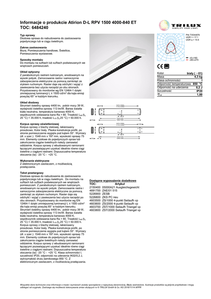 Informacje o produkcie Atirion D-L RPV 1500 4000-840 ET TOC: 6484240 Typ oprawy Diodowa oprawa do nabudowania do zastosowania pojedynczego lub w ciągu świetlnym. Plik TX044876 UGR l = 17.1 UGR q = 14.6 Zakres zastosowania Biura, Pomieszczenia handlowe, Świetlice, Pomieszczenia wystawowe. c0-c180 c90-c270 Sposoby montażu Do montażu na sufitach lub sufitach podwieszanych we wnętrzach pomieszczeń. Układ optyczny Z parabolicznym rastrem lustrzanym, anodowanym na wysoki połysk. Zamocowanie rastra i samoczynne zabezpieczenia elektryczne za pomocą zamknięć ze stykiem ruchomym. Raster daje się odchylić i wyjąć z zawieszenia bez użycia narzędzi po obu stronach. Przystosowany do monitorów wg EN 12464-1 dzięki zmniejszonej luminancji L ≤ 1500 cd/m² dla kąta emisji powyżej 65° w każdym kierunku. 74 100 197 75 18 E 138 74 1410 (1500) 1110 (1200) 87 75 E 30 1232/1534 1282/1584 100 Korpus oprawy oświetleniowej Korpus oprawy z blachy stalowej, lakierowany proszkowo, Kolor biały. Płaska konstrukcja profili, po stronie pomieszczenia wygięta pod kątem 55°. Wymiary (dł. x szer.): 1548 mm x 197 mm, wysokość oprawy 75 mm. Elementy czołowe do pojedynczych opraw lub zakończenia ciągów świetlnych należy zamawiać oddzielnie. Korpus oprawy z wbudowanymi ramionami łączącymi pozwalającymi uzyskać idealnie równe ciągi świetlne z ciągłymi rastrami. Dopuszczalna temperatura otoczenia (ta): -20 °C - +25 °C. 1410 (1500) 1110 (1200) 87 197 Układ diodowy Strumień świetlny oprawy 4400 lm, pobór mocy 39 W, wydajność świetlna oprawy 113 lm/W. Barwa światła biała neutralna, temperatura barwowa 4000 K, współczynnik oddawania barw Ra > 80. Trwałość L80 (tq 25 °C) = 35.000 h, trwałość L70 (tq 25 °C) = 50.000 h. Kolor biały ( ···01) Masa 4,3 kg Klasa ochronności I Odporność temperaturowa 850 °C Odporność na uderzenia 0,2 J Szczelność IP20 η LB 1,00 30 1232/1534 1246/1548 Wykonanie elektryczne Z elektronicznym zasilaczem, z możliwością przełączania. Tekst przetargowy Diodowa oprawa do nabudowania do zastosowania pojedynczego lub w ciągu świetlnym. Do montażu na sufitach lub sufitach podwieszanych we wnętrzach pomieszczeń. Z parabolicznym rastrem lustrzanym, anodowanym na wysoki połysk. Zamocowanie rastra i samoczynne zabezpieczenia elektryczne za pomocą zamknięć ze stykiem ruchomym. Raster daje się odchylić i wyjąć z zawieszenia bez użycia narzędzi po obu stronach. Przystosowany do monitorów wg EN 12464-1 dzięki zmniejszonej luminancji L ≤ 1500 cd/m² dla kąta emisji powyżej 65° w każdym kierunku. Strumień świetlny oprawy 4400 lm, pobór mocy 39 W, wydajność świetlna oprawy 113 lm/W. Barwa światła biała neutralna, temperatura barwowa 4000 K, współczynnik oddawania barw Ra > 80. Trwałość L80 (tq 25 °C) = 35.000 h, trwałość L70 (tq 25 °C) = 50.000 h. Korpus oprawy z blachy stalowej, lakierowany proszkowo, Kolor biały. Płaska konstrukcja profili, po stronie pomieszczenia wygięta pod kątem 55°. Wymiary (dł. x szer.): 1548 mm x 197 mm, wysokość oprawy 75 mm. Elementy czołowe do pojedynczych opraw lub zakończenia ciągów świetlnych należy zamawiać oddzielnie. Korpus oprawy z wbudowanymi ramionami łączącymi pozwalającymi uzyskać idealnie równe ciągi świetlne z ciągłymi rastrami. Dopuszczalna temperatura otoczenia (ta): -20 °C - +25 °C. Klasa ochronności I, szczelność IP20, odporność na uderzenia IK02/0,2 J, wytrzymałość drutu żarnikowego 850 °C. Z elektronicznym zasilaczem, z możliwością przełączania. Dostępne wyposażenie dodatkowe TOC: Artykuł 2150400 05000A21 Ausgleichsgewicht 4691700 ZAE/01 515 5226900 ZESB 5226800 ZKS PC neu 4603500 ZS/1000 4-punkt Seilaufh vp 4603600 ZS/2000 4-punkt Seilaufh vp 4603700 ZST/1000 Seilaufh Triangel vp 4603800 ZST/2000 Seilaufh Triangel vp Wszystkie dane techniczne oraz informacje o masie i wymiarach zostały sporządzone z najwyższą starannością. Błędy zastrzeżone. Ilustracje produktów są jedynie przykładowe i mogą odbiegać od oryginału. Zastrzega się możliwość dokonywania zmian służących ro © TRILUX GmbH & Co. KG 2016/11/14 APPR