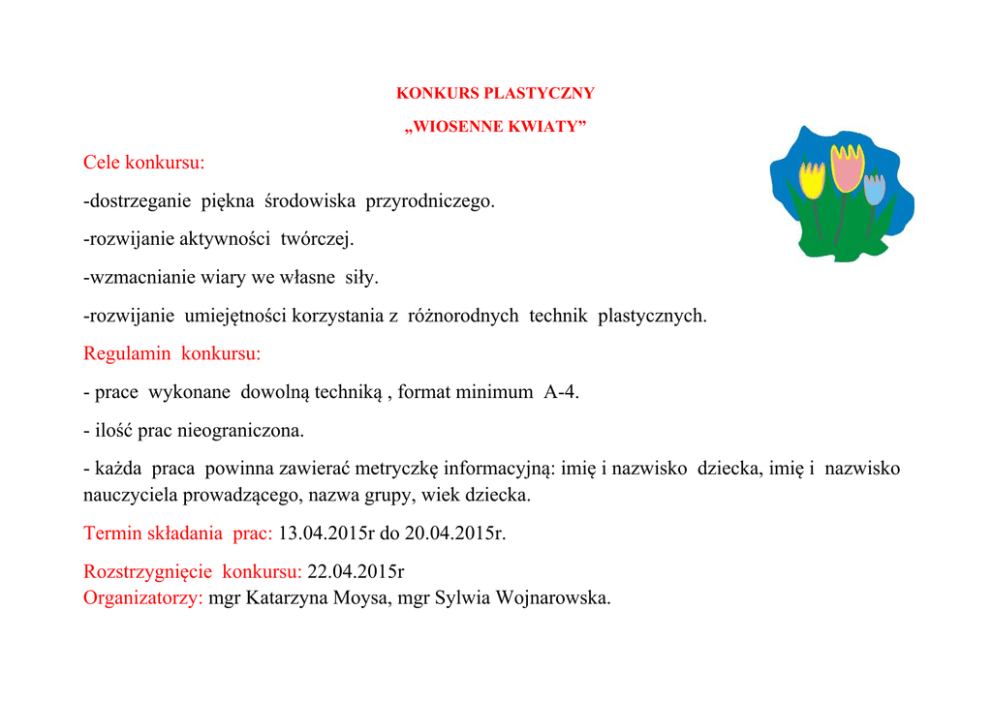 KONKURS PLASTYCZNY „WIOSENNE KWIATY” Cele konkursu: -dostrzeganie piękna środowiska przyrodniczego. -rozwijanie aktywności twórczej. -wzmacnianie wiary we własne siły. -rozwijanie umiejętności korzystania z różnorodnych technik plastycznych. Regulamin konkursu: - prace wykonane dowolną techniką , format minimum A-4. - ilość prac nieograniczona. - każda praca powinna zawierać metryczkę informacyjną: imię i nazwisko dziecka, imię i nazwisko nauczyciela prowadzącego, nazwa grupy, wiek dziecka. Termin składania prac: 13.04.2015r do 20.04.2015r. Rozstrzygnięcie konkursu: 22.04.2015r Organizatorzy: mgr Katarzyna Moysa, mgr Sylwia Wojnarowska.