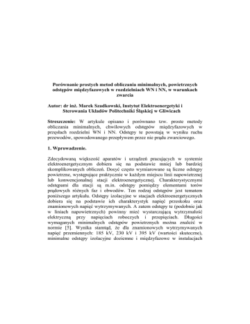 Porównanie prostych metod obliczania minimalnych, powietrznych odstępów międzyfazowych w rozdzielniach WN i NN, w warunkach zwarcia Autor: dr inŜ. Marek Szadkowski, Instytut Elektroenergetyki i Sterowania Układów Politechniki Śląskiej w Gliwicach Streszczenie: W artykule opisano i porównano tzw. proste metody obliczania minimalnych, chwilowych odstępów międzyfazowych w przęsłach rozdzielni WN i NN. Odstępy te powstają w wyniku ruchu przewodów, spowodowanego przepływem przez nie prądu zwarciowego. 1. Wprowadzenie. Zdecydowaną większość aparatów i urządzeń pracujących w systemie elektroenergetycznym dobiera się na podstawie mniej lub bardziej skomplikowanych obliczeń. Dosyć często wymiarowane są liczne odstępy powietrzne, występujące praktycznie w kaŜdym miejscu linii napowietrznej lub konwencjonalnej stacji elektroenergetycznej. Charakterystycznymi odstępami dla stacji są m.in. odstępy pomiędzy elementami torów prądowych róŜnych faz i obwodów. Ten rodzaj odstępów jest tematem poniŜszego artykułu. Odstępy izolacyjne w stacjach elektroenergetycznych dobiera się na podstawie ich charakterystyk napięć przeskoku oraz znamionowych napięć wytrzymywanych. A zatem odstępy te (podobnie jak w liniach napowietrznych) powinny mieć wystarczającą wytrzymałość elektryczną przy napięciach roboczych i przepięciach. Długości wymaganych minimalnych odstępów powietrznych moŜna znaleźć w normie [5]. Wynika stamtąd, Ŝe dla znamionowych wytrzymywanych napięć przemiennych: 185 kV, 230 kV i 395 kV (wartości skuteczne), minimalne odstępy izolacyjne doziemne i międzyfazowe w instalacjach elektroenergetycznych (określenie z normy) wynoszą odpowiednio 0,9 m, 1,1 m i 1,9 m. Stosując interpolację moŜna przyjąć, Ŝe dla napięcia 110 kV odstęp ten będzie wynosił 0,55 m. Odstępy te uznaje się za podstawowe. W [5] zaleca się jednak aby w wielu przypadkach je zwiększać. W przypadku przewodów giętkich wychylających się pod wpływem sił elektromagnetycznych (w wyniku przepływu prądu zwarciowego) zwiększenie powinno wynieść 1,5 odstępu podstawowego. W praktyce projektowej decydujący jest przypadek zwarcia dwufazowego, gdyŜ występuje wtedy największe zbliŜenie przewodów a min (rys. 1). a a amin Rys.1. Trajektorie ruchu przewodów w środku przęsła w wyniku przepływu prądu zwarciowego Sprawdzenie odstępów wymaga obliczenia wychylenia przewodów. MoŜna to zrobić przy pomocy jednej z wielu metod [2] [3]. PoniŜej opisano i porównano kilka z nich, zaliczanych do grupy tzw. metod prostych. 2. Proste metody obliczania minimalnych odstępów między dwoma zwartymi fazami. W metodach prostych oferowane są tablice oraz wzory analityczne ustalone na podstawie doświadczeń, prostych zaleŜności mechanicznych i geometrycznych lub wyników bardzo duŜej ilości symulacji komputerowych. Metoda taka zalecana jest m.in. w normie [6]. W dalszej części artykułu porównano wyniki uzyskiwane tą metodą z wynikami uzyskiwanymi przy pomocy prostego równania opracowanego w IEiSU Politechniki Śląskiej oraz dwu innych zaleŜności stosowanych czasami w praktyce projektowej. Tak uzyskane wyniki porównano z minimalnym dopuszczalnym odstępem powietrznym zalecanym w [5] oraz dodatkowo z wynikami uzyskiwanymi przy pomocy wielokrotnie zweryfikowanego (takŜe przez porównanie z wynikami pomiarów), stworzonego na bazie tzw. metody pośredniej programu komputerowego WASP [4]. 2.1. Metoda I (koło). Najprostszą metodą obliczania minimalnego odstępu między poruszającymi się przewodami jest załoŜenie ruchu przewodów po łuku koła o promieniu równym zwisowi przewodu przed zwarciem. Minimalny odstęp między poruszającymi się przewodami określa wtedy równanie: a min = a − 2bc , (1) gdzie: a min − minimalny odstęp w czasie ruchu przewodów, a − odstęp statyczny (przed zwarciem), bc − statyczny (przed zwarciem) zwis przewodu. Taki sposób postępowania, nazwany na potrzeby niniejszego artykułu metodą I (koła), nie uwzględnia jednak wydłuŜenia cieplnego i mechanicznego (elastycznego) przewodu, które w warunkach zwarcia jest dość istotne. 2.2. Metoda II (mik). W [1] proponuje się obliczanie a min wg zaleŜności: a min = a − 1,8 x (2) ( ) ( ) " 2 l 10 − 2 Tk2 2,04 I k a gdzie: x = 2bc h − h 2 a h = dla Tk < 0,2 s i ' 2 2ml g (I ) h = 0,3 (m g ) la " 3, 6 k 2 ' dla Tk ≥ 0,2 s , I k" − prąd zwarciowy początkowy dla zwarcia trójfazowego, l − długość przewodów podlegających wychyleniu zwarciowemu, a − statyczny odstęp między fazami, Tk − czas trwania zwarcia, m ' − masa jednostkowa przewodu, g − przyśpieszenie ziemskie. 2.3. Metoda III (PN). Metoda ta, nazwana przez autora PN, zalecana jest w normach [6] i [7]. Minimalny odstęp między zwartymi fazami oblicza się przy pomocy zaleŜności: a min = a − 2bh (3) gdzie bh - maksymalny zwis w czasie ruchu przewodu określony na podstawie kilkunastu współczynników, wyznaczanych w mniej lub bardziej skomplikowany sposób [6]. Proponowany w normie [6] algorytm szacowania minimalnej odległości między poruszającymi się przewodami, mimo swojej prostoty, jest dość uciąŜliwy. Dodając do tego fakt, Ŝe norma ta niedostępna jest w języku polskim, w IEiSU Politechniki Śląskiej opracowano alternatywną, prostszą, bo zawierającą zaledwie jedno równanie, metodę szacowania odległości amin. 2.4. Metoda IV (IEiSU). Proponowana poniŜej metoda powstała na podstawie analiz wyników bardzo duŜej ilości róŜnego rodzaju symulacji komputerowych. Głównym celem wspomnianych analiz było zbadanie wpływu róŜnych czynników na skutki mechaniczne prądu zwarciowego. Wg. metody IEiSU obliczenia amin prowadzone są na podstawie znajomości tylko i wyłącznie wartości prądu zwarciowego (dla zwarcia dwufazowego), długości przęsła, statycznej siły naciągu oraz początkowej (statycznej) odległości między przewodami. N