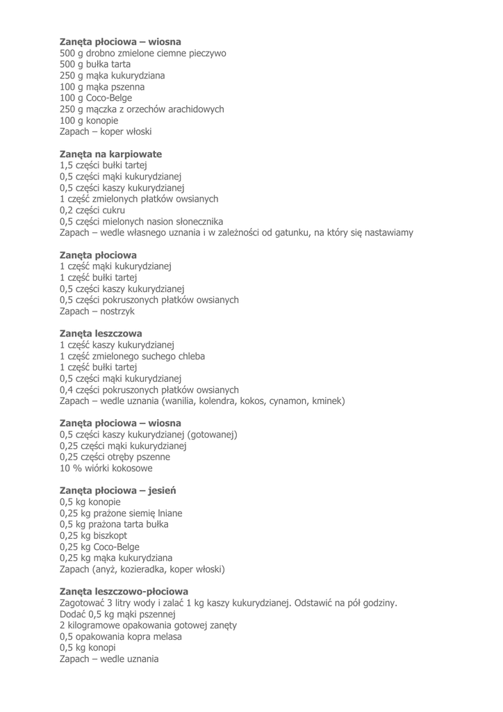 Zanęta płociowa – wiosna 500 g drobno zmielone ciemne pieczywo 500 g bułka tarta 250 g mąka kukurydziana 100 g mąka pszenna 100 g Coco-Belge 250 g mączka z orzechów arachidowych 100 g konopie Zapach – koper włoski Zanęta na karpiowate 1,5 części bułki tartej 0,5 części mąki kukurydzianej 0,5 części kaszy kukurydzianej 1 część zmielonych płatków owsianych 0,2 części cukru 0,5 części mielonych nasion słonecznika Zapach – wedle własnego uznania i w zależności od gatunku, na który się nastawiamy Zanęta płociowa 1 część mąki kukurydzianej 1 część bułki tartej 0,5 części kaszy kukurydzianej 0,5 części pokruszonych płatków owsianych Zapach – nostrzyk Zanęta leszczowa 1 część kaszy kukurydzianej 1 część zmielonego suchego chleba 1 część bułki tartej 0,5 części mąki kukurydzianej 0,4 części pokruszonych płatków owsianych Zapach – wedle uznania (wanilia, kolendra, kokos, cynamon, kminek) Zanęta płociowa – wiosna 0,5 części kaszy kukurydzianej (gotowanej) 0,25 części mąki kukurydzianej 0,25 części otręby pszenne 10 % wiórki kokosowe Zanęta płociowa – jesień 0,5 kg konopie 0,25 kg prażone siemię lniane 0,5 kg prażona tarta bułka 0,25 kg biszkopt 0,25 kg Coco-Belge 0,25 kg mąka kukurydziana Zapach (anyż, kozieradka, koper włoski) Zanęta leszczowo-płociowa Zagotować 3 litry wody i zalać 1 kg kaszy kukurydzianej. Odstawić na pół godziny. Dodać 0,5 kg mąki pszennej 2 kilogramowe opakowania gotowej zanęty 0,5 opakowania kopra melasa 0,5 kg konopi Zapach – wedle uznania Zanęta krąpiowo-leszczowa na wodę stojącą 2 części bułki tartej lub pszennych otrębów, 2 części mielonych płatków owsianych, 1 część suszonej mielonej gliny, 1 część krwi, 1 część białych robaków Zanęta płociowa na wodę stojącą 3 części mielonych biszkoptów, 1 część mleka w proszku, 1 część tartej bułki, 1 część suszonej mielonej gliny, 1 część otrębów pszennych, 1 część suszonych lub żywych larw ochotek i chruścika oraz białych robaków. Zanęta świnkowa 2 części bułki tartej, 2 części mlek w proszku, 2 części gliny mielonej-suszonej, 1 część płatków owsianych mielonych, 1 część glonów suszonych mielonych, 1 część robaków białych Zanęta krąpiowo-leszczowa na wodę bieżącą 2 części płatków owsianych (80% mielone), 2 części mąki kukurydzianej, 1 część mielonej gliny suszonej, 1 część otrąb pszennych, 1 część mleka w proszku, 1 część robaków białych, 0,5 części soli kuchennej Zanęta płociowa na wodę bieżącą 3 części bułki tartej 2 części mielonych herbatników 2 części kaszy kukurydzianej 1 część płatki owsiane mielone 1 część mleko w proszku 0,5 części siemię lniane mielone 0,5 części konopie mielone Olejek anyżowy Glina stosownie do prądu Zanęta płociowa na wodę stojącą 2 części bułki tartej 3 części biszkoptów mielonych 1,5 części mąki kukurydzianej 0,5 części mleka w proszku 2 części otrębów pszennych 1 część siemię lniane mielone Zapach (koper, kminek) Ziemia z kretowiska stosownie do głębokości łowiska Zanęta leszczowa na wodę bieżącą 2 części chleba mielonego 1 część bułki tartej 2 części płatków owsianych mielonych 0,5 części płatków owsianych całych 1 część mąki ziemniaczanej 1 część konopie mielone Olejek kminkowy Glina odpowiednio do prądu Zanęta leszczowa na wodę stojącą 3 części bułki tartej 2 części kaszy kukurydzianej 2 części otrębów pszennych 1 część płatków owsianych całych 1 część konopie mielone Olejek kminkowy Ziemia z kretowiska według głębokości Zanęta płociowa na wodę stojącą 5 części bułki tartej 1,5 części mąki kukurydzianej 1 część płatków owsianych mielonych 1,5 części biszkoptów mielonych 1 część mąka kokosowa Cukier Zanęta leszczowo-krąpiowa na wody stojące i wolno płynące 6 części bułki tartej 6 części suchar słodki mielony 5 części biszkoptu mielonego 1 część cukru pudru 1 część cukru krystalicznego 1 część cukru waniliowego Na wody szybciej płynące trzeba dodać 2 części mąki kukurydzianej, 2 części chleba mielonego i 1 część czystego żwiru Zanęta powierzchniowa 50 % bułka tarta – bardzo drobne 50 % mąka kukurydziana Dodatki smakowo-zapachowe Olejek arakowy lub migdałowy Zanęta powierzchniowa 30% biszkopt – dobrze wyprażony i zmielony 30% mąka kukurydziana 25% bułka tarta – dobrze wyprażona i zmielona 10% siemię lniane – wyprażone i dobrze zmielone 5% kakao Zanęta denna rozpraszająca się 30% płatki owsiane 30% bułka tarta – gruba 20% chrupki kukurydziane – gniecione 10% mąka kukurydziana 5% otręby pszenne 5% wiórki kokosowe Zapach owocowy
