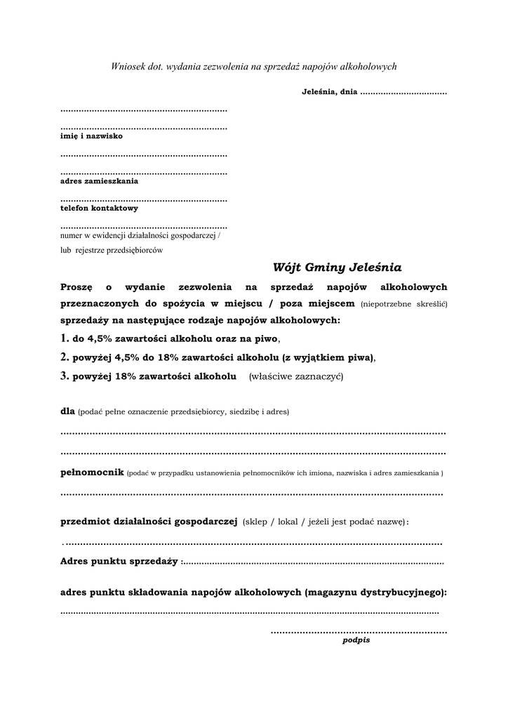 Wniosek dot. wydania zezwolenia na sprzedaż napojów alkoholowych Jeleśnia, dnia ………………………….… ................................................................ ................................................................ imię i nazwisko ................................................................ ................................................................ adres zamieszkania ................................................................ telefon kontaktowy ................................................................ numer w ewidencji działalności gospodarczej / lub rejestrze przedsiębiorców Wójt Gminy Jeleśnia Proszę o wydanie zezwolenia na sprzedaż napojów alkoholowych przeznaczonych do spożycia w miejscu / poza miejscem (niepotrzebne skreślić) sprzedaży na następujące rodzaje napojów alkoholowych: 1. do 4,5% zawartości alkoholu oraz na piwo, 2. powyżej 4,5% do 18% zawartości alkoholu (z wyjątkiem piwa), 3. powyżej 18% zawartości alkoholu (właściwe zaznaczyć) dla (podać pełne oznaczenie przedsiębiorcy, siedzibę i adres) ..................................................................................................................................... ..................................................................................................................................... pełnomocnik (podać w przypadku ustanowienia pełnomocników ich imiona, nazwiska i adres zamieszkania ) .................................................................................................................................... przedmiot działalności gospodarczej (sklep / lokal / jeżeli jest podać nazwę): ................................................................................................................................... Adres punktu sprzedaży :.................................................................................................... adres punktu składowania napojów alkoholowych (magazynu dystrybucyjnego): …………………………………………………………………………………………………………………………………. ............................................................. podpis