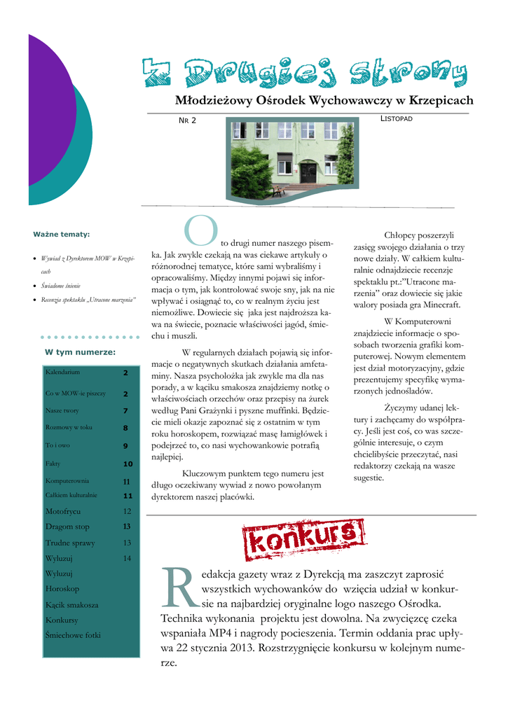 Młodzieżowy Ośrodek Wychowawczy w Krzepicach NR 2 Ważne tematy: Wywiad z Dyrektorem MOW w Krzepicach Świadome śnienie Recenzja spektaklu „Utracone marzenia” W tym numerze: Kalendarium 2 Co w MOW-ie piszczy 2 Nasze twory 7 Rozmowy w toku 8 To i owo 9 Fakty 10 Komputerownia 11 Całkiem kulturalnie 11 Motofrycu 12 Dragom stop 13 Trudne sprawy 13 Wyluzuj 14 Wyluzuj Horoskop Kącik smakosza Konkursy Śmiechowe fotki O to drugi numer naszego pisemka. Jak zwykle czekają na was ciekawe artykuły o różnorodnej tematyce, które sami wybraliśmy i opracowaliśmy. Między innymi pojawi się informacja o tym, jak kontrolować swoje sny, jak na nie wpływać i osiągnąć to, co w realnym życiu jest niemożliwe. Dowiecie się jaka jest najdroższa kawa na świecie, poznacie właściwości jagód, śmiechu i muszli. W regularnych działach pojawią się informacje o negatywnych skutkach działania amfetaminy. Nasza psycholożka jak zwykle ma dla nas porady, a w kąciku smakosza znajdziemy notkę o właściwościach orzechów oraz przepisy na żurek według Pani Grażynki i pyszne muffinki. Będziecie mieli okazje zapoznać się z ostatnim w tym roku horoskopem, rozwiązać masę łamigłówek i podejrzeć to, co nasi wychowankowie potrafią najlepiej. Kluczowym punktem tego numeru jest długo oczekiwany wywiad z nowo powołanym dyrektorem naszej placówki. R LISTOPAD Chłopcy poszerzyli zasięg swojego działania o trzy nowe działy. W całkiem kulturalnie odnajdziecie recenzje spektaklu pt.:”Utracone marzenia” oraz dowiecie się jakie walory posiada gra Minecraft. W Komputerowni znajdziecie informacje o sposobach tworzenia grafiki komputerowej. Nowym elementem jest dział motoryzacyjny, gdzie prezentujemy specyfikę wymarzonych jednośladów. Życzymy udanej lektury i zachęcamy do współpracy. Jeśli jest coś, co was szczególnie interesuje, o czym chcielibyście przeczytać, nasi redaktorzy czekają na wasze sugestie. edakcja gazety wraz z Dyrekcją ma zaszczyt zaprosić wszystkich wychowanków do wzięcia udział w konkursie na najbardziej oryginalne logo naszego Ośrodka. Technika wykonania projektu jest dowolna. Na zwycięzcę czeka wspaniała MP4 i nagrody pocieszenia. Termin oddania prac upływa 22 stycznia 2013. Rozstrzygnięcie konkursu w kolejnym numerze. STR. 2 Z DRUGIEJ STRONY Kalendarium 1 grudnia Światowy Dzień Walki z AIDS 2 grudnia Światowy Dzień Walki z Uciskiem 3 grudnia Międzynarodowy Dzień Niepełnosprawnych 4 grudnia Barbórka 5 grudnia Dzień Pomocy Cierpiącym, Międzynarodowy Dzień Wolontariusza 6 grudnia Dzień św. Mikołaja 8 grudnia Uroczystość Niepokalanego Poczęcia Najświętszej Maryi Panny 9 grudnia Międzynarodowy Dzień Przeciwdziałania Korupcji 18 grudnia Międzynarodowy Dzień Emigrantów 20 grudnia Międzynarodowy Dzień Solidarności 21 grudnia Początek astronomicznej zimy - najkrótszy dzień roku 22 grudnia Światowy Dzień Wody 24 grudnia Wigilia Bożego Narodzenia 25 grudnia Boże Narodzenie (pierwszy dzień) 26 grudnia Boże Narodzenie (drugi dzień) 30 grudnia Sylwester Opracował: Grzegorz Konwisarz NR 2 STR. 3 Co w MOW-ie piszczy? H alloween jest świętem pogańskim, wywodzącym się z celtyckiego obrządku Samhain. Celtowie wierzyli, że w ten dzień zaciera się granica między światem ludzkim, a zaświatem i duchom łatwiej dostać się do świata żywych. Dobre duchy przodków zapraszano do domów na uczty, oddawano im cześć, złe zaś – przepędzano. Prawdopodobnie, to właśnie z potrzeby odstraszenia złych dusz, wywodzi się zwyczaj przebierania się w dziwne, straszne stroje oraz zakładania różnego rodzaju masek potworów i duchów. Nazwa Halloween prawdopodobnie pochodzi od wyrażenia All Hallow's Eve - wigilia Wszystkich Świętych, a wydrążona dynia ze światełkiem wewnątrz, która stała się symbolem tegoż święta, dla irlandzkich chłopów oznaczała błędne ogniki uważane za dusze zmarłych. 31października Samorząd Uczniowski, pod opieką pani Patrycji i Magdy oraz pana Rafała, zorganizował imprezę Halloweenową. Późnym popołudniem zebraliśmy się w jednej z sal, aby wspólnie zabawić Z godnie z tradycją, Irlandczyk Jack Lantern – pijak, który był zbyt zły, by pójść do nieba, a za sztuczki z diabłem wyrzucono go z piekła został skazany na wieczną wędrówkę po ziemi. Na pożegnanie Szatan dał mu kawałek żarzącego się węgla prosto z ogniska. Jack wetknął go do niedojedzonej połowy ogromnej rzepy. Dzięki światłu z warzywnej latarni Jack wyruszył w podróż w poszukiwaniu wiecznego miejsca zatracenia. Ta tradycja rozprzestrzeniła się po świecie, tylko że to w dyni dziś rzeźbiliśmy twarz Jacka Laterna. Podzieleni na trzy zespoły tworzyliśmy niepowtarzalne kreacje bohatera legend. Efektem naszej pracy były niepowtarzalne rzeźby z dyni. Gdy w środku umieściliśmy świeczki dynie wyglądały przerażająco i tworzyły odpowiedni dla tego święta nastrój. Kolejnym punktem spotkania był konkurs na najoryginalniejszy makijaż halloweenowy. Naszym zadaniem było opracowanie własnego projektu na najstraszniejszy malunek na twarzy. Przedstawiciele zespołów pełnili funkcje modeli, na których reszta ekipy eksperymentowała z farbami, na szczęście tymi zmywalnymi. Wyobraźnia poniosła naszych podopiecznych i pomysłów nie brakowało. Chłopaki spisali się na medal kreując fantazyjne, barwne i przerażające karykatury. Mistrzem kamuflażu jednogłośnie okrzyknięto zespół Adriana z Kamilem i Patrykiem w roli charakteryzatorów. Drugie podium przypadło Dawidowi, Michałowi, Pawłowi i Sewerynowi, a brąz zdobyła grupa Daniela, malowanego przez Dastina i Adriana. Praca nad najlepszą maską wywołała wiele pozytywnych emocji i dużą dawkę śmiechu. Ozdabiani chłopcy do końca nie wiedzieli, jaki będzie rezultat tej metamorfozy i z niecierpliwieniem czekali na efekt końcowy. A proszę mi wierzyć, było co podziwiać. Następnym etapem i