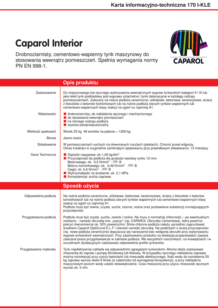 Karta informacyjno-techniczna 170 I-KLE Caparol Interior Drobnoziarnisty, cementowo-wapienny tynk maszynowy do stosowania wewnątrz pomieszczeń. Spełnia wymagania normy PN EN 998-1. Opis produktu Zastosowanie Właściwości Wielkość opakowań Barwa Składowanie Dane Techniczne Do maszynowego lub ręcznego wykonywania wewnętrznych wypraw tynkarskich kategorii II i III lub jako lekki tynk podkładowy pod wyprawy szlachetne i tynki dekoracyjne w każdego rodzaju pomieszczeniach. Zalecany na nośne podłoża ceramiczne, silikatowe, betonowe, keramzytowe, ściany z bloczków z betonów komórkowych lub na nośne podłoża starych tynków wapiennych lub cementowo-wapiennych klasy reakcji na ogień co najmniej A1. ■ ■ ■ ■ drobnoziarnisty, do nakładania ręcznego i mechanicznego do stosowania wewnątrz pomieszczeń na różnego rodzaju podłoża wysoce paroprzepuszczalny Worek 25 kg 48 worków na palecie = 1200 kg. Jasno szara W pomieszczeniach suchych na drewnianych rusztach (paletach). Chronić przed wilgocią. Okres trwałości w oryginalnie zamkniętym opakowaniu przy prawidłowym składowaniu: 12 miesięcy. ■ Gęstość nasypowa: ok.1,26 kg/dm3 ■ Przyczepność do podłoża dla grubości warstwy tynku 12 mm: Betonowego: ok. 0,5 N/mm2 - FP: B Betonu komórkowego: ok. 0,49 N/mm2 - FP: B Cegły: ok. 0,6 N/mm2 - FP: B ■ Wytrzymałaość na ściskanie: ok. 2,1 MPa ■ Konsystencja: sucha zaprawa Sposób użycia Odpowiednie podłoża Na nośne podłoża ceramiczne, silikatowe, betonowe, keramzytowe, ściany z bloczków z betonów komórkowych lub na nośne podłoża starych tynków wapiennych lub cementowo-wapiennych klasy reakcji na ogień co najmniej A1. Podłoże musi być równe, czyste, suche, mocne, nośne oraz pozbawione substancji zmniejszających przyczepność. Przygotowanie podłoża Podłoże musi być czyste, suche, zwarte i nośne. Na mury o normalnej chłonności – po ewentualnym zwilżeniu - nanieść obrzutkę tzw. „szpryc” (np. CAPAROL Obrzutka Cementowa), która powinna pokryć równomiernie ok. 50% powierzchni. Silnie chłonne podłoża należy uprzednio zagruntować środkiem Caparol OptiGrund E.L.F i również nanieść obrzutkę. Na podłożach o dużej przyczepności (np. nowe podłoża ceramiczne) dopuszcza się nanoszenie bez wstępnej obrzutki przy wykonywaniu wypraw tynkarskich wewnętrznych. Przy zastosowaniu produktu na elewacje przeprowadzić zawsze zalecane prace przygotowawcze w zakresie podłoża. We wszystkich narożnikach, na krawędziach i w szczelinach dylatacyjnych zastosować odpowiednie profile tynkarskie. Przygotowanie materiału Tynk najefektywniej nakłada się odpowiednimi agregatami tynkarskimi. Można także zastosować mieszarkę do zapraw i pompę ślimakową lub tłokową. W przypadku ręcznego nakładania zaprawę można rozmieszać przy użyciu betoniarki lub mieszadła elektrycznego. Ilość wody do rozrobienia 25 kg zaprawy wynosi około 6 litrów (w zależności od wymaganej konsystencji), a przy nakładaniu maszynowym poziom wody ustalić doświadczalnie. Czas mieszania przy użyciu mieszarek ręcznych wynosi ok. 5 min. Karta informacyjno-techniczna 170 I-KLE Sposób nakładania Na jednorodnych powierzchniach murów materiał nakładać w jednym cyklu.W przypadku murów mieszanych lub niejednorodnych podłoży nakładać dwuwarstwowo „mokre w mokre” Powierzchnię zatrzeć jednolicie przy użyciu pacy styropianowej, z filcem lub twarda gąbką. W rejonie płyt z materiałów drewno pochodnych, kaset żaluzji, wieńców, pasów stropowych lub niejednorodnych murów należy najpierw nałożyć ok. 5 mm grubości warstwę zaprawy i zatopić w niej siatkę wzmacniającą z włókna szklanego Capatect 650, pozostawiając odpowiedniej wielkości zakładkę. Tężejącą powierzchnię lekko przeczesać szorstką miotełką. Minimalna grubość warstwy: 12 mm; powyżej 20 mm nakładać warstwowo po dostatecznym wyschnięciu poprzedniej nadając warstwie spodniej odpowiednią szorstkość celem zwiększenia przyczepności. W przypadku prowadzenia prac na zewnętrz unikać pracy w bezpośrednim nasłonecznieniu, przy silnym wietrze lub mgle. Stosować plandeki lub siatki ocieniające celem ochrony nowo wykonanych wypraw przed deszczem, silnym słońcem lub wiatrem. Obróbka: Po narzuceniu tynku na uprzednio przygotowane podłoże ściągnąć (wyrównać) tynk łatą typu H, wyrównując cała powierzchnię. Tak obrobioną pozostawić na 4 do 16 godzin (w zależność od warunków atmosferycznych), aż do wstępnego związania tynku. Następnie przystąpić do ścinania tynku (tynk powinien być na tyle związany, aby następowało jego osypywanie, a nie wyrywanie) przy użyciu łaty trapezowej lub zdzieraka aż do wyrównania powierzchni w stopniu satysfakcjonującym, pamiętając o cało-powierzchniowym przeprowadzeniu tego procesu. Następnie zrosić woda i zacierać przy pomocy pacy styropianowej lub pacy z twardą gąbką do chwili uzyskania równej i gładkiej powierzchni. W celu uzyskania drobnej, jednorodnej faktury tynk obrabiać po wstępnym zatarciu „na sucho” pacą z drobną, miękką gąbką lub filcem. Układ warstw Minimalna grubość warstwy: 12 mm; powyżej 20 mm nakładać warstwowo. Sugerowane produkty do wierzchniego wykończenia: Związany i wyschnięty tynk można pokrywać bezpośrednio powłokami malarskimi marki Caparol lub zastosować wyprawy – tynki ; techniki dekoracyjne. Dobór produktów zależy od indywidualnych preferencji oraz oczekiwanego efektu. Wykończenie ostateczne powierzchni można wykonać przy pomocy dostępnych na rynku produktów lub zastosować rozwiązania z szerokiej palety produktów firmy CAPAROL: powłoki malarskie, szlachetne tynki dekoracyjne, techniki dekoracyjne, tynki mozaikowe lub lekkie płytki okładzinowe CAPAROL Meldorfer. Przy stosowaniu produktów jako warstwy wykończeniowe zawsze zapoznać się z zaleceniami ich producentów. Zużycie Warunki obróbki C