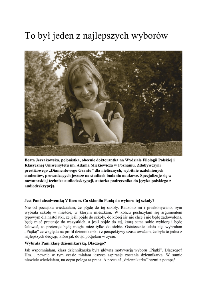 To był jeden z najlepszych wyborów Beata Jerzakowska, polonistka, obecnie doktorantka na Wydziale Filologii Polskiej i Klasycznej Uniwersytetu im. Adama Mickiewicza w Poznaniu. Zdobywczyni prestiżowego „Diamentowego Grantu” dla nielicznych, wybitnie uzdolnionych studentów, prowadzących jeszcze na studiach badania naukowe. Specjalizuje się w nowatorskiej technice audiodeskrypcji, autorka podręcznika do języka polskiego z audiodeskrypcją. Jest Pani absolwentką V liceum. Co skłoniło Panią do wyboru tej szkoły? Nie od początku wiedziałam, że pójdę do tej szkoły. Radzono mi i przekonywano, bym wybrała szkołę w mieście, w którym mieszkam. W końcu posłużyłam się argumentem typowym dla nastolatki, że jeśli pójdę do szkoły, do której iść nie chcę i nie będę zadowolona, będę mieć pretensje do wszystkich, a jeśli pójdę do tej, którą sama sobie wybiorę i będę żałować, to pretensje będę mogła mieć tylko do siebie. Ostatecznie udało się, wybrałam „Piątkę” ze względu na profil dziennikarski i z perspektywy czasu uważam, że była to jedna z najlepszych decyzji, które jak dotąd podjęłam w życiu. Wybrała Pani klasę dziennikarską. Dlaczego? Jak wspomniałam, klasa dziennikarska była główną motywacją wyboru „Piątki”. Dlaczego? Hm… pewnie w tym czasie miałam jeszcze aspiracje zostania dziennikarką. W sumie niewiele wiedziałam, na czym polega ta praca. A przecież „dziennikarka” brzmi z pompą! W jakich działaniach brała Pani udział, w celu kształcenia się w dziedzinie dziennikarstwa, które jest podstawą profilu? Działaniami były przede wszystkim zadania z zakresu dziennikarstwa realizowane na lekcjach języka polskiego oraz działalność dodatkowa. Do inicjatyw pozalekcyjnych należało redagowanie pierwszego tomu rocznika szkolnego „Ad notam”. Byłam także korespondentką „Głosu Wielkopolskiego”, do którego pisywałam krótkie notki na temat wydarzeń, które działy się w moim mieście. Pisała Pani do „Głosu Wielkopolskiego”? Było to w ramach projektu, czy sama się Pani zgłosiła? Sama napisałam do redakcji. Dostałam wtedy legitymację korespondentki. Później, gdy wiedziałam, że coś się dzieje w mieście, pisałam krótką notatkę z danego wydarzenia. Była Pani zastępcą redaktora naczelnego pierwszej edycji „Ad notam”. Co zadecydowało o Pani udziale w tym projekcie? Interesowało mnie wszystko, co związane z lekcjami języka polskiego. A że inicjatorką stworzenia takiego rocznika była nauczycielka tego przedmiotu, to przecież nie mogłam nie wziąć udziału w redagowaniu „Ad notam”. Poza tym miło zapisać się w pamięci szkoły, dzięki pracy przy pierwszym, można powiedzieć, historycznym tomie rocznika. Może Pani opowiedzieć jak wyglądała praca nad tworzeniem rocznika? Myślę, że podobnie jak w kolejnych edycjach. Zbieranie materiału, redagowanie, korygowanie… Wymagało to wielkiego zaangażowania i zabierało ogromnie dużo czasu... Zadaniem wielu osób po ukończeniu klasy humanistycznej nie ma się przyszłości. Miała Pani podobne obawy, wybierając klasę o takim profilu? Nie. Nie myślałam o tym. Jakoś nie widziałam siebie nigdzie indziej jak na polonistyce. Koniec końców, znalazłam się na tym kierunku. Czy nie ma przyszłości? A po innych jest? Ja po kierunku inżynieryjnym czy innym ścisłym też nie miałabym przyszłości, bo o ile bym go skończyła, to wątpię czy byłabym wziętym informatykiem, fizykiem czy matematykiem. Choć może warto było pomyśleć o neurochirurgii…? Bądź co bądź, już jest za późno. To już slogan, ale naprawdę warto robić to, co się lubi. Trochę smutno, gdy wstajemy do pracy z myślą: „O nie… Boże… Znowu muszę tam iść…”. Obecnie, jako pracownik naukowy, specjalizuje się Pani w audiodeskrypcji. Może Pani powiedzieć coś więcej na temat tej techniki? Audiodeskrypcja to technika opisywania sztuki osobom niewidomym i niedowidzącym. Można ją wykorzystywać w filmie i teatrze. Są to wówczas krótkie relacje między dialogami bohaterów na temat tego, co dzieje się na ekranie oraz w muzeach, gdzie stanowi opis warstwy wizualnej obrazu. Właśnie ten rodzaj audiodeskrypcji jest mi szczególnie bliski. Założeniem tej techniki jest tak opowiedzieć treść obrazu niewidomemu odbiorcy, by wiedział, co obraz przedstawia oraz by mógł go samodzielnie zinterpretować i przeżyć. Audiodeskrypcja, opisując sztukę, sama w sobie powinna być sztuką, dzięki której osoby z dysfunkcją wzroku mogą z nią obcować. Skąd zainteresowanie audiodeskrypcją? Zupełnie przypadkowe. Usłyszałam kiedyś w telewizji, że w Kinie Muza, z okazji Dnia Dziecka, odbył się pokaz filmu „Księżniczka i żaba” z audiodeskrypcją. To był pierwszy raz, gdy usłyszałam ten termin. Nie wiedziałam, co on oznacza, więc poszperałam w Internecie. Okazało się, że jest to właśnie technika opisywania sztuki niewidomym odbiorcom. Co ważne, Internet był bardzo lakoniczny w tym temacie. Teraz informacji na temat audiodeskrypcji jest znacznie więcej. Organizowane są wystawy, pokazy filmowe, spektakle teatralne. Dzieje się sporo. Zwłaszcza od strony praktycznej. Po tych poszukiwaniach stwierdziłam, że skoro jest tak mało informacji o AD, to może warto zająć się tą techniką od strony naukowej i językoznawczej. Jest Pani zdobywczynią „Diamentowego Grantu”. Jest to program grantowy dla nielicznych, wybitnie uzdolnionych studentów, aby ułatwić im szybsze wejście na drogę kariery naukowej. Skierowany jest do młodych ludzi, którzy już na studiach prowadzą badania naukowe. Co zachęciło Panią do wzięcia udziału w tym konkursie? Możliwość zaistnienia w świecie naukowym. Choć w ogóle nie spodziewałam się, że zdobędę ten grant. Tym bardziej, że dokumenty zanosiłam „za pięć dwunasta”, bo do ostatniej chwili zdobywałam potrzebne podp