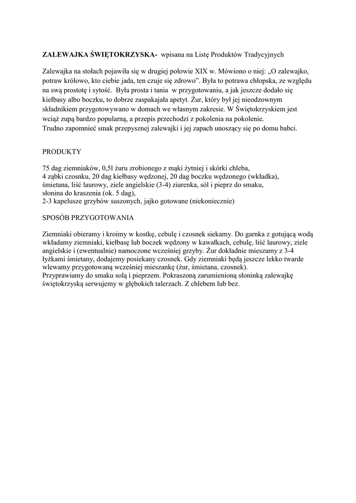 ZALEWAJKA ŚWIĘTOKRZYSKA- wpisana na Listę Produktów Tradycyjnych Zalewajka na stołach pojawiła się w drugiej połowie XIX w. Mówiono o niej: „O zalewajko, potraw królowo, kto ciebie jada, ten czuje się zdrowo”. Była to potrawa chłopska, ze względu na swą prostotę i sytość. Była prosta i tania w przygotowaniu, a jak jeszcze dodało się kiełbasy albo boczku, to dobrze zaspakajała apetyt. Żur, który był jej nieodzownym składnikiem przygotowywano w domach we własnym zakresie. W Świętokrzyskiem jest wciąż zupą bardzo popularną, a przepis przechodzi z pokolenia na pokolenie. Trudno zapomnieć smak przepysznej zalewajki i jej zapach unoszący się po domu babci. PRODUKTY 75 dag ziemniaków, 0,5l żuru zrobionego z mąki żytniej i skórki chleba, 4 ząbki czosnku, 20 dag kiełbasy wędzonej, 20 dag boczku wędzonego (wkładka), śmietana, liść laurowy, ziele angielskie (3-4) ziarenka, sól i pieprz do smaku, słonina do kraszenia (ok. 5 dag), 2-3 kapelusze grzybów suszonych, jajko gotowane (niekoniecznie) SPOSÓB PRZYGOTOWANIA Ziemniaki obieramy i kroimy w kostkę, cebulę i czosnek siekamy. Do garnka z gotującą wodą wkładamy ziemniaki, kiełbasę lub boczek wędzony w kawałkach, cebulę, liść laurowy, ziele angielskie i (ewentualnie) namoczone wcześniej grzyby. Żur dokładnie mieszamy z 3-4 łyżkami śmietany, dodajemy posiekany czosnek. Gdy ziemniaki będą jeszcze lekko twarde wlewamy przygotowaną wcześniej mieszankę (żur, śmietana, czosnek). Przyprawiamy do smaku solą i pieprzem. Pokraszoną zarumienioną słoninką zalewajkę świętokrzyską serwujemy w głębokich talerzach. Z chlebem lub bez.