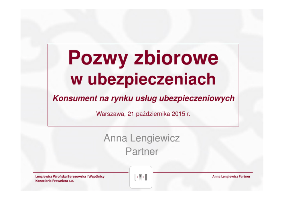 Pozwy zbiorowe w ubezpieczeniach Konsument na rynku usług ubezpieczeniowych Warszawa, 21 października 2015 r. Anna Lengiewicz Partner Lengiewicz Wrońska Berezowska i Wspólnicy Kancelaria Prawnicza s.c. Anna Lengiewicz Partner Przyczyny pozwów zbiorowych: nadmierny konsumeryzm czy chciwość towarzystw ubezpieczeniowych? • Towarzystwa ubezpieczeniowe masowo naruszają interesy konsumentów. Przeprowadzają prostą kalkulację opłacalności nieprzestrzegania prawa i nieuchronności kary - instytucjom finansowym opłaca się stosowanie postanowień niedozwolonych i nierespektowanie wyroków sądowych, bo nic im za to nie grozi. • Wywłaszczenie obywatela z jego majątku przez Towarzystwa ubezpieczeniowe? – Art. 21 Konstytucji - Rzeczpospolita Polska chroni własność – czy rzeczywiście chroni własność obywatela? – Art. 76 Konstytucji - Władze publiczne chronią konsumentów – czy rzeczywiście ich chronią? Lengiewicz Wrońska Berezowska i Wspólnicy Kancelaria Prawnicza s.c. Anna Lengiewicz Partner 2 Przyczyny pozwów zbiorowych: nadmierny konsumeryzm czy chciwość towarzystw ubezpieczeniowych? „Nadzorcy Finansowi” na świecie: • • • „Sześć wielkich banków zapłaci łącznie 5,8 mld USD kary za gigantyczne oszustwa na rynku finansowym. Piątka z ukaranych przyznała się do manipulacji kursami walutowymi. Zgodnie z oświadczeniem Departamentu Sprawiedliwości Citigroup zapłaci 925 mln USD kary, Barclays 650 mln USD, JP Morgan 550 mln USD, a Royal Bank of Scotland 295 mln USD. Dodatkowo Barclays zapłaci kolejne 1,3 mld USD kary w związku z wcześniejszymi postanowieniami urzędów brytyjskich i Nowojorskiego Departamentu Finansów”. 2015-05-20 – Bankier.pl „W ramach ugody zawartej przez Deutsche Bank z władzami USA i Wielkiej Brytanii, niemiecki Deutsche Bank zapłaci im łącznie 2,5 mld dol. kary za swą rolę w manipulowaniu stopą Libor”. 24.04.2015 – PAP „Aż 17 mld dol. odszkodowań zapłaci władzom USA oraz klientom Bank of America. Jego szefowie przyznali, że oferował inwestycje, wiedząc, że to zwykłe śmieci”. 22.08.2014, Maciej Samcik, Gazeta Wyborcza Lengiewicz Wrońska Berezowska i Wspólnicy Kancelaria Prawnicza s.c. Anna Lengiewicz Partner 3 Przyczyny pozwów zbiorowych: nadmierny konsumeryzm czy chciwość towarzystw ubezpieczeniowych? „Nadzorcy Finansowi” na świecie: • „Kary dla ubezpieczycieli za misselling produktów ubezpieczeniowych. Kara nałożona na Abbey Life przez FSA w wysokości £1m pokazuje, że skandal jest poważny. Wielu ubezpieczycieli, włączając Prudential, Pearl oraz Allied Dunbar może podążyć śladem Lloyds TSB, na którego regulator nałożył duże kary oraz obowiązek zapłaty odszkodowań, jeżeli okaże się, że firmy te stosowały misselling w sprzedaży produktów ubezpieczeniowych, w tym typu unit-linked”. Friday 6 December 2002 Katherine Griffiths, Banking Correspondent Independent Lengiewicz Wrońska Berezowska i Wspólnicy Kancelaria Prawnicza s.c. Anna Lengiewicz Partner 4 Przyczyny pozwów zbiorowych: nadmierny konsumeryzm czy chciwość towarzystw ubezpieczeniowych? Organizacje europejskie: • Problem ubezpieczeń na życie z UFK, tzw. umów finansowych „opakowanych” w formę umowy ubezpieczenia był w latach 2009-2012 przedmiotem szczegółowej analizy Komisji Europejskiej, która przeprowadziła wśród państw członkowskich UE badanie czy w jakikolwiek sposób uregulowały prawnie sprzedaż tego typu produktów, w celu zapewnienia ich transparentności, prawidłowej sprzedaży oraz uniknięcia konfliktu interesów pomiędzy pośrednikami sprzedającymi te produkty a konsumentami. • Polska była jednym z 4 państw Unii Europejskiej (wraz z Bułgarią, Litwą i Luksemburgiem), które nie uregulowały w jakimkolwiek zakresie praktyk sprzedażowych podmiotów oferujących produkty inwestycyjne sprzedawane wraz z ubezpieczeniem na życie. Polska również nie zadeklarowała, że przewiduje wprowadzenie takich regulacji. Proposal for a REGULATION OF THE EUROPEAN PARLIAMENT AND OF THE COUNCIL on key information documents for investment products” Strasbourg, 3.7.2012 COM(2012) 352 final Lengiewicz Wrońska Berezowska i Wspólnicy Kancelaria Prawnicza s.c. Anna Lengiewicz Partner 5 Przyczyny pozwów zbiorowych: nadmierny konsumeryzm czy chciwość towarzystw ubezpieczeniowych? Organizacje europejskie: • European Insurance and Occupational Pensions Authority (EIOPA), European Banking Authority (EBA), European Securities and Markets Authoriy (ESMA) - wystosowały w dniu 31 lipca 2014 r. (znak: JC 2014 62) upomnienie do instytucji finansowych i firm ubezpieczeniowych: – wskazując na konflikt interesów w przypadku, gdy w obrębie tej samej grupy kapitałowej odbywa się tworzenie jak i sprzedaż polis inwestycyjnych (unit-linked policies) – z taką sytuacją mamy do czynienia w przypadku polisolokat sprzedawanych przez Towarzystwa Ubezpieczeniowe Open Life i Europa; – wskazując na wysokość wynagrodzenia pośredników, które jest tak lukratywne w przypadku sprzedaży produktów inwestycyjnych – w tym polisolokat, iż stanowi zachętę dla tychże pośredników do sprzedaży konsumentom ryzykownych produktów finansowych, w których ryzyka są zatajone, zamiast tradycyjnych produktów oszczędnościowych – taki stan rzeczy wyrządza szkodę konsumentom. Lengiewicz Wrońska Berezowska i Wspólnicy Kancelaria Prawnicza s.c. Anna Lengiewicz Partner 6 Przyczyny pozwów zbiorowych: nadmierny konsumeryzm czy chciwość towarzystw ubezpieczeniowych? Sądy w krajach europejskich: • • • • W Niemczech w 2012 roku zapada szereg orzeczeń Sądu Federalnego, w których sąd kwestionuje: nieczytelne zapisy w ogólnych warunkach umów, odsyłające od jednego postanowienia do drugiego, brak wyraźnego wskazania, że polisy inwestycyjne mogą przynieść tak dużą stratę, że konsument może stracić wszystko, opłaty likwidacyjne (przy „wyjściu