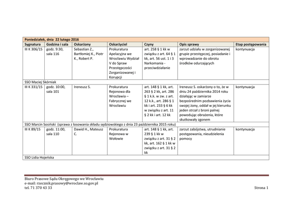 Poniedziałek, dnia 22 lutego 2016 Sygnatura Godzina i sala Oskarżony III K 306/15 godz. 9:30, Sebastian Z., sala 116 Bartłomiej K., Piotr K., Robert P. SSO Maciej Skórniak III K 331/15 godz. 10:00, sala 101 Ireneusz S. Oskarżyciel Prokuratura Apelacyjna we Wrocławiu Wydział V do Spraw Przestępczości Zorganizowanej i Korupcji Czyny art. 258 § 1 kk w związku z art. 64 § 1 kk, art. 56 ust. 1 i 3 Narkomania przeciwdziałanie Opis sprawy zarzut udziału w zorganizowanej grupie przestępczej, posiadanie i wprowadzanie do obrotu środków odurzających Etap postępowania kontynuacja Prokuratura Rejonowa dla Wrocławia – Fabrycznej we Wrocławiu art. 148 § 1 kk, art. 263 § 2 kk, art. 286 § 1 k.k. w zw. z art. 12 k.k., art. 286 § 1 kk i art. 233 § 6 kk w związku z art. 11 § 2 kk i art. 12 kk Ireneusz S. oskarżony o to, że w dniu 24 października 2014 roku działając w zamiarze bezpośrednim pozbawienia życia swojej żony, oddał w jej kierunku jeden strzał z broni palnej powodując obrażenia, które skutkowały zgonem kontynuacja SSO Marcin Sosioski (sprawa z losowania składu sędziowskiego z dnia 23 października 2015 roku) III K 89/15 godz. 11:00, Dawid H., Mateusz Prokuratura art. 148 § 1 kk, art. zarzut zabójstwa, utrudnianie sala 110 C. Rejonowa w 239 § 1 kk w postępowania, nieudzielenia Wołowie związku z art. 31 § 2 pomocy kk, art. 162 § 1 kk w związku z art. 31 § 2 kk SSO Lidia Hojeoska Biuro Prasowe Sądu Okręgowego we Wrocławiu e-mail: [email protected] tel. 71 370 43 33 kontynuacja Strona 1 III K 302/13 godz. 9:30, sala 115 Grzegorz S., Jacek Z., Tomasz U., Danuta G., Agnieszka W., Barbara P., Ryszard P., Michał G., Anna K., Krzysztof G., Krzysztof W., Tomasz S., Roland S., Mariusz B., Ireneusz S., Tomasz C., Marek Sz., Józef B., Marek G. Prokuratura Okręgowa we Wrocławiu art. 13 § 1 kk w związku z art. 286 § 1 kk i art. 270 § 1 kk i art. 297 § 1 kk w związku z art. 11 § 2 kk w związku z art. 12 kk, art. 13 § 1 kk w związku z art. 286 § 1 kk i art. 270 § 1 kk i art. 297 § 1 kk w związku z art. 11 § 2 kk Danuta G. oskarżona m.in. o to, Kontynuacja że w okresie od 27 grudnia 2007 roku do dnia 31 stycznia 2009 roku we Wrocławiu działając w celu osiągnięcia korzyści majątkowej, wspólnie i w porozumieniu z Mariuszem B., Anną K., Hieronimem S., Urszulą S. i innymi jako właścicielka firmy z siedzibą we Wrocławiu, doprowadziła Powszechną Kasę Oszczędności Bank Polski SA 3 Oddział we Wrocławiu do niekorzystnego rozporządzenia mieniem znacznej wartości w kwocie 425.290,62 CHF o równowartości 938.671,54 zł w ten sposób, że złożyła wniosek kredytowy zawierający nierzetelne oświadczenie, co do ich sytuacji majątkowej oraz przedłożyła jako autentyczne SSO Zbigniew Muszyoski Biuro Prasowe Sądu Okręgowego we Wrocławiu e-mail: [email protected] tel. 71 370 43 33 Strona 2 V K 242/15 godz. 11:30, sala 262 Grzegorz K., Jarosław B. Prokuratura Okręgowa w Opolu art. 507 Kodeks wyborczy i art. 506 pkt 6 Kodeks wyborczy w związku z art. 11 § 2 kk i art. 12 kk, art. 507 Kodeks wyborczy i art. 506 pkt 6 Kodeks wyborczy w związku z art. 11 § 2 kk i art. 12 kk zarzut udzielania komitetowi wyborczemu lub przyjmowania w jego imieniu korzyści majątkowej o charakterze niepieniężnym polegającą na rozpowszechnianiu plakatów i ulotek wyborczych kontynuacja SSR Paweł Pomianowski Biuro Prasowe Sądu Okręgowego we Wrocławiu e-mail: [email protected] tel. 71 370 43 33 Strona 3 Wtorek, dnia 23 lutego 2016 Sygnatura Godzina i sala III K 174/14 godz. 9:00, sala 101 SSO Marek Poteralski III K 211/15 godz. 9:30, sala 114 SSO Ewa Mokrzysz IV Ka godz. 10:00, 1141/15 sala 2 Oskarżony Rafał D., Łukasz J., Marek J., Aleksander S., Marek Z. i inni Oskarżyciel Prokuratura Apelacyjna we Wrocławiu Czyny art. 159 kk i art. 158 § 2 kk w związku z art. 11 § 2 kk w związku z art. 64 § 1 kk, art. 258 § 1 kk, art. 159 kk i art. 158 § 2 kk w związku z art. 11 § 2 kk w związku z art. 65 § 1 kk, art. 159 kk Opis sprawy zarzut bójki przy użyciu niebezpiecznych przedmiotów w postaci noży, maczet, pałek drewnianych i metalowych; udział w zorganizowanej grupie przestępczej Etap postępowania kontynuacja Daniel B., Krystian J., Łukasz K., Mariusz Z., Tomasz Ł. I inni Prokuratura Rejonowa dla Wrocławia – Stare Miasto we Wrocławiu art. 13 § 1 kk w związku z art. 286 § 1 kk i art. 298 § 1 kk w związku z art. 11 § 2 kk w związku z art. 294 § 1 kk i art. 286 § 1 kk w związku z art. 11 § 2 kk Tomasz Ł. oskarżony o to, że w celu osiągnięcia korzyści majątkowej oraz wspólnie i w porozumieniu usiłował doprowadzid PZU SA do niekorzystnego rozporządzenia mieniem o wartości 1 003 000 zł kontynuacja Damian P., Wojciech M. Prokuratura Rejonowa Wrocław Krzyki Zachód art. 35 ust. 1 Ochrona zwierząt i art. 35 ust. 2 Ochrona zwierząt, art. 35 ust. 1 Ochrona zwierząt i art. 35 ust. 2 Ochrona zwierząt, Damian P. oskarżony o to, że na przełomie lipca i sierpnia 2013 roku we Wrocławiu, działając w zamiarze pozbawienia życia kota i ze szczególnym okrucieostwem w celu zadania zwierzęciu bólu i cierpienia, umieścił je w pralce automatycznej , uruchamiając pierwszy termin rozprawy odwoławczej Biuro Prasowe Sądu Okręgowego we Wrocławiu e-mail: [email protected] tel. 71 370 43 33 Strona 4 art. 35 ust. 1 Ochrona zwierząt i art. 35 ust. 2 Ochrona zwierząt, art. 35 ust. 1 Ochrona zwierząt, art. 239 § 1 kk, art. 239 § 1 kk następnie cykl prania, czym spowodował szereg obrażeo, a następnie zgon zwierzęcia SSO Grzegorz Szepelak Biuro Prasowe Sądu Okręgowego we Wrocławiu e-mail: [email protected] tel. 71 370 43 33 Strona 5 Środa, dnia 24 lutego 2016 Sygnatura Godzina i sala III K 193/15 godz. 9:30, sala 102 SSO Zbigniew Moska III K 152/15 godz. 9:30, sala 101 Oskarżony Michał T., Ryszard S., Zbigniew S., Dariusz S. i inni Oskarżyciel Prokuratura Rejonowa dla Wrocławia – Krzyki 