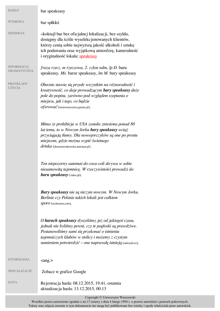 HASŁO bar speakeasy WYMOWA bar spikizi DEFINICJA «koktajl bar bez oficjalnej lokalizacji, bez szyldu, dostępny dla ściśle wyselekcjonowanych klientów, którzy cenią sobie najwyższą jakość alkoholi i sztukę ich podawania oraz wyjątkową atmosferę, kameralność i oryginalność lokalu; speakeasy» INFORMACJA GRAMATYCZNA fraza rzecz. m rzeczowa, 2. człon ndm, lp D. baru speakeasy, Ms. barze speakeasy, lm M. bary speakeasy PRZYKŁADY UŻYCIA Obecnie stawia się przede wszystkim na różnorodność i kreatywność, co daje prowadzącym bary speakeasy duże pole do popisu, zarówno pod względem szeptania o miejscu, jak i tego, co będzie oferować (metrowarszawa.gazeta.pl). Mimo że prohibicja w USA została zniesiona ponad 80 lat temu, to w Nowym Jorku bary speakeasy wciąż przyciągają tłumy. Dla nowojorczyków są one po prostu miejscem, gdzie można wypić świetnego drinka (dorotasierakowska.natemat.pl). Ten niepozorny automat do coca-coli skrywa w sobie niesamowitą tajemnicę. W rzeczywistości prowadzi do baru speakeasy (video.pl). Bary speakeasy nie są niczym nowym. W Nowym Jorku, Berlinie czy Pekinie takich lokali jest całkiem sporo (archemon.com). O barach speakeasy słyszeliśmy już od jakiegoś czasu, jednak nie byliśmy pewni, czy te pogłoski są prawdziwe. Postanowiliśmy sami się przekonać o istnieniu tajemniczych klubów w stolicy i możemy z czystym sumieniem potwierdzić – one naprawdę istnieją (odwiedz.to). ETYMOLOGIA WIZUALIZACJE DATA <ang.> Zobacz w grafice Google Rejestracja hasła: 08.12.2015, 19.41, ostatnia aktualizacja hasła: 13.12.2015, 00.13 Copyright © Uniwersytet Warszawski Wszelkie prawa zastrzeżone zgodnie z art.17 ustawy z dnia 4 lutego 1994 r. o prawie autorskim i prawach pokrewnych. Teksty oraz zdjęcia zawarte w tym dokumencie nie mogą być publikowane bez wiedzy i zgody właściciela praw autorskich. AUTOR Paweł Ciach REDAKTOR Maciej Czeszewski Copyright © Uniwersytet Warszawski Wszelkie prawa zastrzeżone zgodnie z art.17 ustawy z dnia 4 lutego 1994 r. o prawie autorskim i prawach pokrewnych. Teksty oraz zdjęcia zawarte w tym dokumencie nie mogą być publikowane bez wiedzy i zgody właściciela praw autorskich. Powered by TCPDF (www.tcpdf.org)