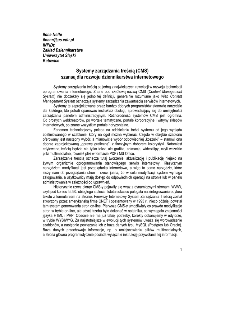 Ilona Neffe [email protected] INPiDz Zakład Dziennikarstwa Uniwersytet Śląski Katowice Systemy zarządzania treścią (CMS) szansą dla rozwoju dziennikarstwa internetowego Systemy zarządzania treścią są jedną z największych rewelacji w rozwoju technologii oprogramowania internetowego. Znane pod skrótową nazwą CMS (Content Management System) nie doczekały się jednolitej definicji, generalnie rozumiane jako Web Content Management System oznaczają systemy zarządzania zawartością serwisów internetowych. Systemy te zaprojektowane przez bardzo dobrych programistów stanowią narzędzie dla każdego, kto potrafi opanować instruktaż obsługi, sprowadzający się do umiejętności zarządzania panelem administracyjnym. Różnorodność systemów CMS jest ogromna. Od prostych webkreatorów, po wortale tematyczne, portale korporacyjne i witryny sklepów internetowych, po znane wszystkim portale horyzontalne. Fenomen technologiczny polega na oddzieleniu treści systemu od jego wyglądu zdefiniowanego w szablonie, który na ogół można wybierać. Często w obrębie szablonu oferowany jest następny wybór, a mianowicie wybór odpowiedniej „koszulki” – stanowi ona dobrze zaprojektowaną „oprawę graficzną”, z finezyjnym doborem kolorystyki. Natomiast edytowaną treścią będzie nie tylko tekst, ale grafika, animacja, wideoklipy, czyli wszelkie pliki multimedialne, również pliki w formacie PDF i MS Office. Zarządzanie treścią oznacza tutaj tworzenie, aktualizację i publikację niejako na żywym organizmie oprogramowania stanowiącego serwis internetowy. Klasycznym narzędziem modyfikacji jest przeglądarka internetowa, a więc to samo narzędzie, które służy nam do przeglądania stron – rzecz jasna, że w celu modyfikacji system wymaga zalogowania, a użytkownicy mają dostęp do odpowiednich operacji na stronie lub w panelu administrowania w zależności od uprawnień. Historycznie rzecz biorąc CMS-y pojawiły się wraz z dynamicznymi stronami WWW, czyli pod koniec lat 90. ubiegłego stulecia. Istota sukcesu polegała na zintegrowaniu edytora tekstu z formularzem na stronie. Pierwszy Internetowy System Zarządzania Treścią został stworzony przez amerykańską firmę CNET i opatentowany w 1995 r., nieco później powstał tam system generowania stron on-line. Pierwsze CMS-y umożliwiały co prawda modyfikacje stron w trybie on-line, ale edycji trzeba było dokonać w notatniku, co wymagało znajomości języka HTML i PHP. Obecnie nie ma już takiej potrzeby, korekty dokonujemy w edytorze, w trybie WYSIWYG. Za najistotniejsze w ewolucji tych systemów uważa się wprowadzenie szablonów, a następnie powiązanie ich z bazą danych typu MySQL (Postgres lub Oracle). Baza danych przechowuje informacje, np. o umiejscowieniu plików multimedialnych, a strona główna programistycznie posiada wyłącznie instrukcję przywołania tej informacji. 1 Tak więc dane rozumiane jako zawartość strony (treść) oddzielone są od szablonu strony i przechowywane w bazie danych, natomiast aplikacje pracujące na serwerze pobierają te dane (według instrukcji) i wyświetlają w wyznaczonym miejscu. Wygląd strony, na którą składa się tekst i wstawione elementy rozumiany jest jako forma i definiowany w tzw. kaskadowych arkuszach stylów (CSS). Obecnie w przypadku skromnego wąskotematycznego serwisu zarządzanie może odbywać się w tzw. trybie centralistycznym, co oznacza, że administrator systemu wykonuje wszystkie operacje: tworzy treść, zatwierdza i publikuje. W przypadku serwisów znacznie rozbudowanych liczy się praca zbiorowa w tzw. zarządzaniu procesowym – system zarządza przekazywaniem dokumentu kolejno odpowiednim osobom, których role i kompetencje są ściśle zdefiniowane w kategorii uprawnień. Użytkownicy posiadający konta w takim systemie stanowią często dwie kategorie. Pierwsza z nich to niejako użytkownicy frontowej części witryny, a więc goście oraz posiadający swoje konta w systemie: autorzy artykułów, redaktorzy i wydawcy (odpowiednio uprawnienia: author, editor, Publisher). Nazwy te mają charakter symboliczny. Wszyscy posiadają uprawnienia do przeglądania artykułów, a zróżnicowane uprawnienia do korzystania z komponentów. Autorzy, rzecz jasna, opracowują artykuły, redaktorzy posiadają uprawnienia do ich czytania i korekty, natomiast zatwierdzenie artykułu do publikacji wymaga uprawnień wydawcy. Druga kategoria użytkowników to grupa tzw. administratorów, posiadających uprawnienia logowania do panelu administracyjnego. Tutaj również obowiązuje hierarchia uprawnień. Zarządzający (menager), oprócz uprawnień wydawcy, posiadają również możliwości tworzenia nowych sekcji i kategorii artykułów (artykuły w serwisie uporządkowane są tematycznie kategoriami w sekcjach), kontrolują zawartość strony głównej oraz menu. Członkowie grupy administrator posiadają dodatkowo uprawnienia zarządzania tzw. dodatkami do systemu (forum lub czat), jak również mogą dodawać i usuwać konta użytkowników. Uprawnienia absolutne zarządzania całym systemem, a tym samym możliwość wykonania wszystkich operacji, posiada główny administrator. Oczywiście, wszelkie wyżej opisane funkcje mają znaczenie w sensie technologicznego funkcjonowania przykładowego internetowego serwisu, jednak aby tchnąć duszę w ten twór niezbędny jest kompetentny twórca treści – od jego inwencji twórczej i zaangażowania zależy powodzenie serwisu. Tak więc, bez względu na to, czy serwis zarządzany jest jednoosobowo, czy przez zespół, liczy się jego zawartość merytoryczna, funkcjonalność i przydatność, którą ocenią wybredni internauci. Jak wybrać odpowiedni CMS? Otóż, po dokładnej analizie potrzeb, oraz analizie możliwości systemów, należałoby zwrócić uwagę na licencję. Sporo jest na rynku ofert komercyjnych i drogich, z bardzo sugestywną reklamą, jak bardzo się opłaca taki kupić, jak 