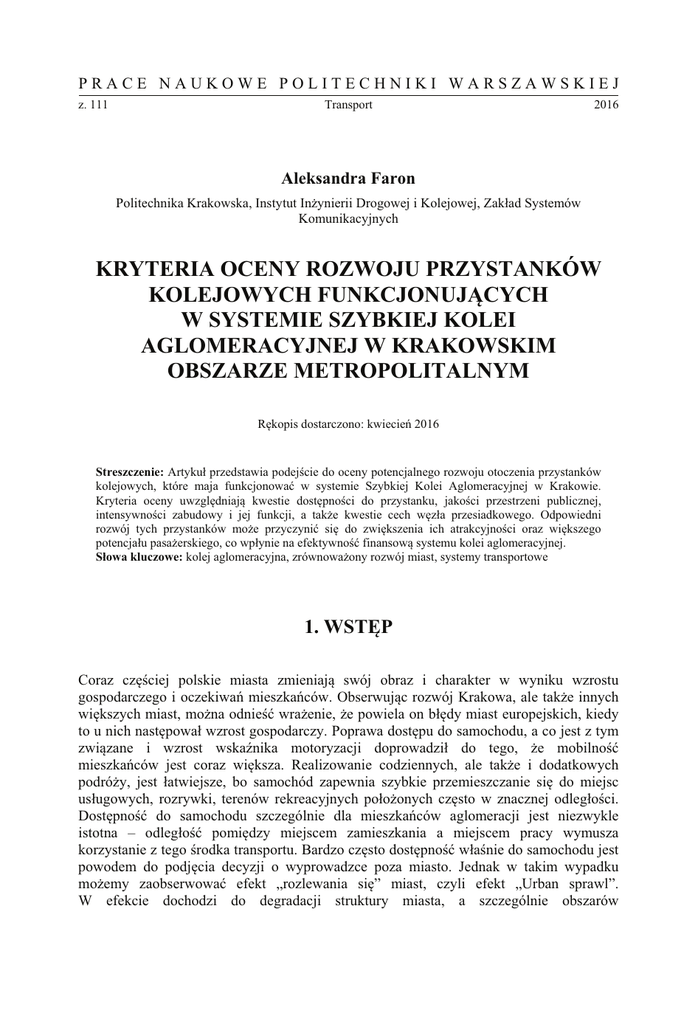 1. Faron, A.: Przystanki Szybkiej Kolei Aglomeracyjnej jako zagadnienie planowania przestrzennego.