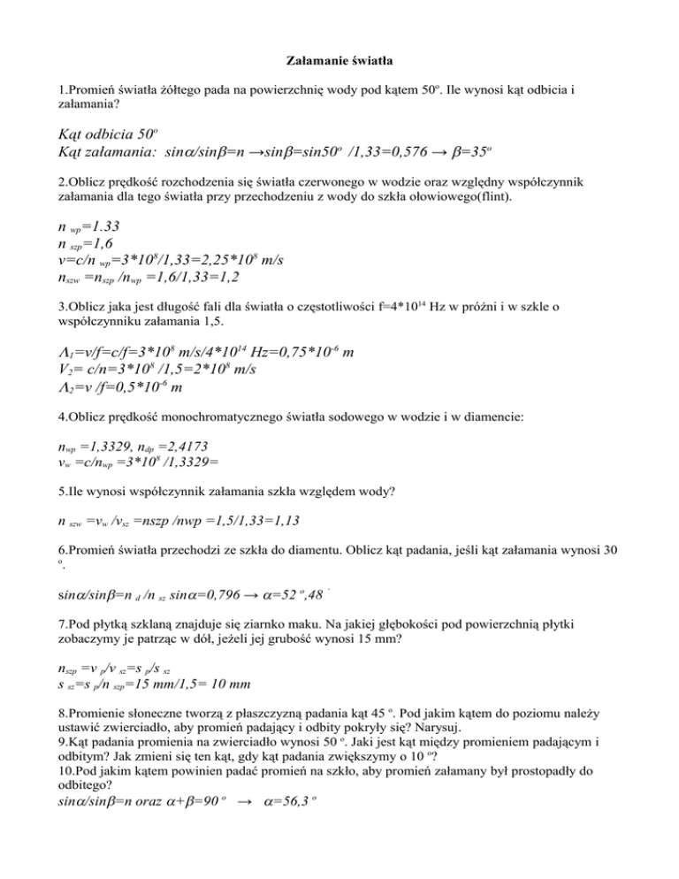 Załamanie światła 1.Promień światła żółtego pada na powierzchnię wody pod kątem 50o. Ile wynosi kąt odbicia i załamania? Kąt odbicia 50o Kąt załamania: sinα/sinβ=n →sinβ=sin50o /1,33=0,576 → β=35o 2.Oblicz prędkość rozchodzenia się światła czerwonego w wodzie oraz względny współczynnik załamania dla tego światła przy przechodzeniu z wody do szkła ołowiowego(flint). n wp=1.33 n szp=1,6 v=c/n wp=3*108/1,33=2,25*108 m/s nszw =nszp /nwp =1,6/1,33=1,2 3.Oblicz jaka jest długość fali dla światła o częstotliwości f=4*1014 Hz w próżni i w szkle o współczynniku załamania 1,5. Λ1=v/f=c/f=3*108 m/s/4*1014 Hz=0,75*10-6 m V2= c/n=3*108 /1,5=2*108 m/s Λ2=v /f=0,5*10-6 m 4.Oblicz prędkość monochromatycznego światła sodowego w wodzie i w diamencie: nwp =1,3329, ndp =2,4173 vw =c/nwp =3*108 /1,3329= 5.Ile wynosi współczynnik załamania szkła względem wody? n szw =vw /vsz =nszp /nwp =1,5/1,33=1,13 6.Promień światła przechodzi ze szkła do diamentu. Oblicz kąt padania, jeśli kąt załamania wynosi 30 o . sinα/sinβ=n d /n sz sinα=0,796 → α=52 o,48 ‘ 7.Pod płytką szklaną znajduje się ziarnko maku. Na jakiej głębokości pod powierzchnią płytki zobaczymy je patrząc w dół, jeżeli jej grubość wynosi 15 mm? nszp =v p/v sz=s p/s sz s sz=s p/n szp=15 mm/1,5= 10 mm 8.Promienie słoneczne tworzą z płaszczyzną padania kąt 45 o. Pod jakim kątem do poziomu należy ustawić zwierciadło, aby promień padający i odbity pokryły się? Narysuj. 9.Kąt padania promienia na zwierciadło wynosi 50 o. Jaki jest kąt między promieniem padającym i odbitym? Jak zmieni się ten kąt, gdy kąt padania zwiększymy o 10 o? 10.Pod jakim kątem powinien padać promień na szkło, aby promień załamany był prostopadły do odbitego? sinα/sinβ=n oraz α+β=90 o → α=56,3 o