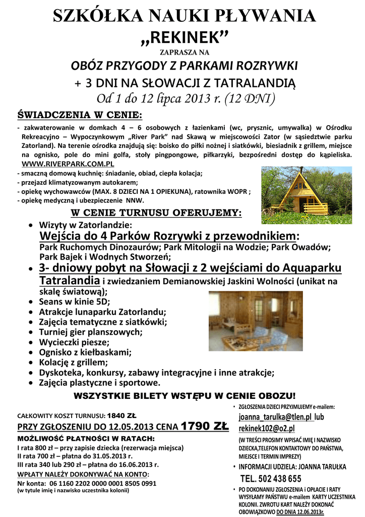 SZKÓŁKA NAUKI PŁYWANIA „REKINEK” ZAPRASZA NA OBÓZ PRZYGODY Z PARKAMI ROZRYWKI + 3 DNI NA SŁOWACJI Z TATRALANDIĄ Od 1 do 12 lipca 2013 r. (12 DNI) ŚWIADCZENIA W CENIE: - zakwaterowanie w domkach 4 – 6 osobowych z łazienkami (wc, prysznic, umywalka) w Ośrodku Rekreacyjno – Wypoczynkowym „River Park” nad Skawą w miejscowości Zator (w sąsiedztwie parku Zatorland). Na terenie ośrodka znajdują się: boisko do piłki nożnej i siatkówki, biesiadnik z grillem, miejsce na ognisko, pole do mini golfa, stoły pingpongowe, piłkarzyki, bezpośredni dostęp do kąpieliska. WWW.RIVERPARK.COM.PL - smaczną domową kuchnię: śniadanie, obiad, ciepła kolacja; - przejazd klimatyzowanym autokarem; - opiekę wychowawców (MAX. 8 DZIECI NA 1 OPIEKUNA), ratownika WOPR ; - opiekę medyczną i ubezpieczenie NNW. W CENIE TURNUSU OFERUJEMY: • Wizyty w Zatorlandzie: Wejścia do 4 Parków Rozrywki z przewodnikiem: • • • • • • • • • • Park Ruchomych Dinozaurów; Park Mitologii na Wodzie; Park Owadów; Park Bajek i Wodnych Stworzeń; 3- dniowy pobyt na Słowacji z 2 wejściami do Aquaparku Tatralandia i zwiedzaniem Demianowskiej Jaskini Wolności (unikat na skalę światową); Seans w kinie 5D; Atrakcje lunaparku Zatorlandu; Zajęcia tematyczne z siatkówki; Turniej gier planszowych; Wycieczki piesze; Ognisko z kiełbaskami; Kolację z grillem; Dyskoteka, konkursy, zabawy integracyjne i inne atrakcje; Zajęcia plastyczne i sportowe. WSZYSTKIE BILETY WSTĘPU W CENIE OBOZU! • ZGŁOSZENIA DZIECI PRZYJMUJEMY e-mailem: [email protected] lub PRZY ZGŁOSZENIU DO 12.05.2013 CENA 1790 ZŁ [email protected] CAŁKOWITY KOSZT TURNUSU: 1840 ZŁ MOŻLIWOŚĆ PŁATNOŚCI W RATACH: I rata 800 zł – przy zapisie dziecka (rezerwacja miejsca) II rata 700 zł – płatna do 31.05.2013 r. III rata 340 lub 290 zł – płatna do 16.06.2013 r. WPŁATY NALEŻY DOKONYWAĆ NA KONTO: Nr konta: 06 1160 2202 0000 0001 8505 0991 (w tytule imię i nazwisko uczestnika kolonii) (W TREŚCI PROSIMY WPISAĆ IMIĘ I NAZWISKO DZIECKA,TELEFON KONTAKTOWY DO PAŃSTWA, MIEJSCE I TERMIN IMPREZY) • INFORMACJI UDZIELA: JOANNA TARUŁKA TEL. 502 438 655 • PO DOKONANIU ZGŁOSZENIA i OPŁACIE I RATY WYSYŁAMY PAŃSTWU e-mailem KARTY UCZESTNIKA KOLONII. ZWROTU KART NALEŻY DOKONAĆ OBOWIĄZKOWO DO DNIA 12.06.2013r.
