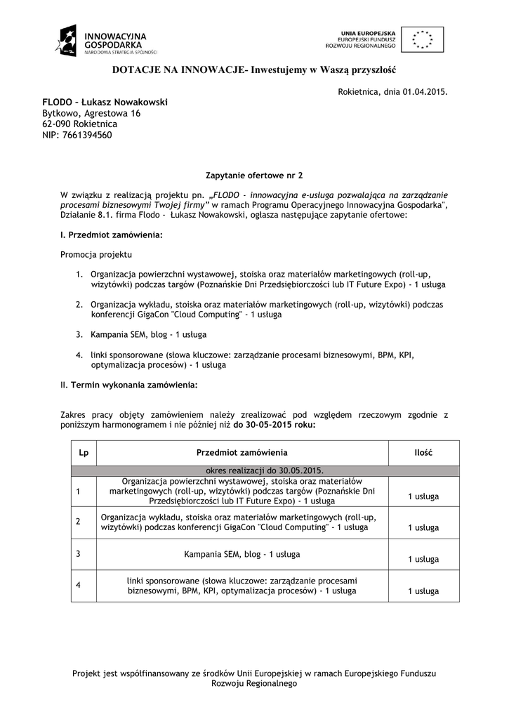 DOTACJE NA INNOWACJE- Inwestujemy w Waszą przyszłość Rokietnica, dnia 01.04.2015. FLODO – Łukasz Nowakowski Bytkowo, Agrestowa 16 62-090 Rokietnica NIP: 7661394560 Zapytanie ofertowe nr 2 W związku z realizacją projektu pn. „FLODO - innowacyjna e-usługa pozwalająca na zarządzanie procesami biznesowymi Twojej firmy” w ramach Programu Operacyjnego Innowacyjna Gospodarka", Działanie 8.1. firma Flodo - Łukasz Nowakowski, ogłasza następujące zapytanie ofertowe: I. Przedmiot zamówienia: Promocja projektu 1. Organizacja powierzchni wystawowej, stoiska oraz materiałów marketingowych (roll-up, wizytówki) podczas targów (Poznańskie Dni Przedsiębiorczości lub IT Future Expo) - 1 usługa 2. Organizacja wykładu, stoiska oraz materiałów marketingowych (roll-up, wizytówki) podczas konferencji GigaCon "Cloud Computing" - 1 usługa 3. Kampania SEM, blog - 1 usługa 4. linki sponsorowane (słowa kluczowe: zarządzanie procesami biznesowymi, BPM, KPI, optymalizacja procesów) - 1 usługa II. Termin wykonania zamówienia: Zakres pracy objęty zamówieniem należy zrealizować pod względem rzeczowym zgodnie z poniższym harmonogramem i nie później niż do 30-05-2015 roku: Lp 1 2 Przedmiot zamówienia okres realizacji do 30.05.2015. Organizacja powierzchni wystawowej, stoiska oraz materiałów marketingowych (roll-up, wizytówki) podczas targów (Poznańskie Dni Przedsiębiorczości lub IT Future Expo) - 1 usługa Organizacja wykładu, stoiska oraz materiałów marketingowych (roll-up, wizytówki) podczas konferencji GigaCon "Cloud Computing" - 1 usługa 3 Kampania SEM, blog - 1 usługa 4 linki sponsorowane (słowa kluczowe: zarządzanie procesami biznesowymi, BPM, KPI, optymalizacja procesów) - 1 usługa Ilość 1 usługa 1 usługa 1 usługa 1 usługa Projekt jest współfinansowany ze środków Unii Europejskiej w ramach Europejskiego Funduszu Rozwoju Regionalnego DOTACJE NA INNOWACJE- Inwestujemy w Waszą przyszłość III. Opis sposobu przygotowania oferty Oferty prosimy składać na formularzu ofertowym. Zamawiający nie dopuszcza składania ofert częściowych - rozpatrywane będą tylko oferty kompletne, tj. zawierać realizację wszystkich elementów zawartych w zapytaniu ofertowym. Zamawiający zastrzega sobie prawo realizacji poszczególnych zadań w ramach oddzielnych umów. Planowany termin realizacji: do 30.05.2015. IV. Miejsce oraz termin składania ofert: 1. Osobiście w siedzibie firmy : FLODO – Łukasz Nowakowski, Bytkowo ul. Agrestowa 16, 62-090 Rokietnica. 2. Pocztą, listem poleconym na adres firmy FLODO – Łukasz Nowakowski, Bytkowo ul. Agrestowa 16, 62-090 Rokietnica. 3. lub na adres mailowy [email protected] Szczegółowych informacji odnośnie zamówienia udziela Pan Łukasz Nowakowski pod numerem telefonu +48 605 109 329 oraz adresem e-mail [email protected] Termin dostarczania ofert upływa w dniu: 10.04.2015 do godz.15:00. Złożona oferta powinna zawierać: nazwę i adres oferenta, data wystawienia oferty, dane pozwalające ocenić ofertę i przyznać punkty w ramach kryteriów przewidywany czas realizacji, termin ważności oferty (minimum 30 dni). V. Sposób oceny ofert: Zamawiający dokona oceny ofert na podstawie następujących kryteriów: 1) Kryteria obligatoryjne: Wypełnienie formularza ofertowego i złożenie oświadczeń, Gotowość wykonania zlecenia w podanych w harmonogramie terminach, nie później niż do 30.05.2015 Ważność oferty minimum 30 dni. 2) Kryteria punktowe Kryteria wyboru Sumaryczna cena netto Znaczenie 100% Projekt jest współfinansowany ze środków Unii Europejskiej w ramach Europejskiego Funduszu Rozwoju Regionalnego DOTACJE NA INNOWACJE- Inwestujemy w Waszą przyszłość Sposób oceny oferty w poszczególnych kryteriach: a) Punkty w ramach kryterium ceny będą przyznawane wg następującej formuły: C min A n = ----------------- x 100 Cr C min – cena minimalna w zbiorze C r – cena oferty rozpatrywanej A n – ilość punktów przyznana ofercie Zastrzeżenia Niniejsze zapytanie ofertowe nie zobowiązuje firmy Flodo - Łukasz Nowakowski do żadnego określonego działania. Wydanie niniejszego zapytania ofertowego nie zobowiązuje firmy Flodo - Łukasz Nowakowski do akceptacji oferty, w całości lub części i nie zobowiązuje firmy Flodo Łukasz Nowakowski do składania wyjaśnień czy powodów akceptacji lub odrzucenia oferty. Flodo - Łukasz Nowakowski nie może być pociągana do odpowiedzialności za jakiekolwiek koszty czy wydatki poniesione przez oferentów w związku z przygotowaniem i dostarczeniem oferty. Flodo - Łukasz Nowakowski zastrzega sobie prawo w każdej chwili do zmian całości lub części zapytania ofertowego. ........................ Pieczęć i podpis Projekt jest współfinansowany ze środków Unii Europejskiej w ramach Europejskiego Funduszu Rozwoju Regionalnego DOTACJE NA INNOWACJE- Inwestujemy w Waszą przyszłość Załącznik Nr1 do zapytania ofertowego nr 2/formularz ofertowy Oferta dla firmy Flodo Łukasz Nowakowski Bytkowo, ul. Agrestowa 16, 62-090 Rokietnica NIP: 7661394560 W odpowiedzi na zapytanie ofertowe nr 2 dotyczące promocji projektu dotyczącego wykonania innowacyjnej e-usługi- „FLODO - innowacyjna e-usługa pozwalająca na zarządzanie procesami biznesowymi Twojej firmy” składam niniejszą ofertę na wykonanie w/w zamówienia. I. Dane wykonawcy Nazwa Wykonawcy: ........................................* Siedziba: ........................................* NIP: ........................................* Numer telefonu: ........................................* Numer faksu: ........................................* E-mail: ........................................* II. Warunki cenowe oferty Sumaryczna cena netto za wykonanie usług: ....................* Oferta ważna do: ........................* Opis szczegółowy oferty zgodny z przedmiotem zamówienia Lp Przedmiot zamówienia Ilość Cena netto wykonania usługi okres realizacji do 30.05.2015. 1 Organiza