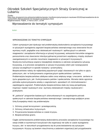 Ośrodek Szkoleń Specjalistycznych Straży Granicznej w Lubaniu Źródło: http://oss.strazgraniczna.pl/oss/osrodek/sympozja-i-konferencje/sympozjum-naukowe-03102/wprowadzenie-do-te matyk/4441,Wprowadzenie-do-tematyki-sympozjum.html Wygenerowano: Piątek, 3 marca 2017, 23:44 Wprowadzenie do tematyki sympozjum Autor: WPROWADZENIE DO TEMATYKI SYMPOZJUM Celem sympozjum jest dyskusja nad problematyką doskonalenia zarządzania kryzysowego w sytuacjach wystąpienia zagrożeń bezpieczeństwa wewnętrznego oraz stworzenie forum wymiany myśli, poglądów oraz doświadczeń naukowych i aplikacyjnych w zakresie reagowania i zarządzania informacją w sytuacji kryzysowej, wskazanie kierunków osiągania porozumienia oraz stworzenie interdyscyplinarnej przestrzeni współpracy między służbami zaangażowanymi w szeroko rozumiane reagowanie w sytuacjach kryzysowych. Skuteczna komunikacja wspiera niewątpliwie działania w zakresie zarządzania sytuacją kryzysową, a w procesie zarządzania w sytuacji kryzysowej celem jest rozwiązywanie sytuacji szczególnych w sposób rozważny i przemyślany. Bezpieczeństwo należy do najbardziej popularnych pojęć stosowanych nie tylko w ujęciu potocznym, ale i w funkcjonowaniu organizacyjnym społeczeństwa i państwa. Problematyka bezpieczeństwa zdobywa sobie coraz większą rangę i znaczenie zarówno w życiu gospodarczym, jak i funkcjonowaniu państw i społeczeństw. Wzrasta także ogromna potrzeba wykorzystywania wiedzy o zagrożeniach, sposobach ich minimalizowania i zapobiegania zagrożeń. Problematyka bezpieczeństwa stała się nową perspektywą inspiracji i badań naukowych oraz wymiany doświadczeń między naukowcami i praktykami. W „pakiecie” programów badawczych ukierunkowanych na zaspokojenie potrzeb społecznych w zakresie bezpieczeństwa wewnętrznego i zewnętrznego podjętym przez Unię Europejską mieści się problematyka: 1. Ochrony przed terroryzmem i przestępczością. 2. Ochrony infrastruktur krytycznych. 3. Przywracania bezpieczeństwa w czasie kryzysu. 4. Bezpieczeństwa granic. Ciągłe zainteresowanie problematyką doskonalenia procesów zarządzania kryzysowego ma swoje źródło w wymiernych korzyściach dla organizacji nie tylko w czasie wystąpienia kryzysu, ale i w warunkach przygotowania się do przeciwstawienia się sytuacjom kryzysowym. Kryzysy są bowiem nieuchronne,a zadaniem organizacji jest przygotowanie się do nich, skuteczne prowadzenie działań w czasie trwania kryzysu i właściwe działanie w fazie postkryzysowej. Poruszane na sympozjum dwa tematy: Zarządzanie kryzysowe w formacjach mundurowych oraz Polityka informacyjna służb mundurowych w sytuacjach kryzysowych są kluczowymi dla optymalizacji procesów zarządzania kryzysowego nie tylko dla Straży Granicznej – organizatora przedsięwzięcia, ale i innych służb zaangażowanych w proces zarządzania kryzysowego. Roli polityki informacyjnej nie da się przecenić w sytuacji, kiedy ludzie potrzebują informacji tak samo, jak wody i chleba. Dlatego uświadamiając sobie konieczność ciągłego doskonalenia procesów zarządzania kryzysowego uczestnicy sympozjum podejmą dyskusję na temat możliwości optymalizacji procesów zarządzania kryzysowego prowadzącą do zaproponowania nowych rozwiązań w tym obszarze.