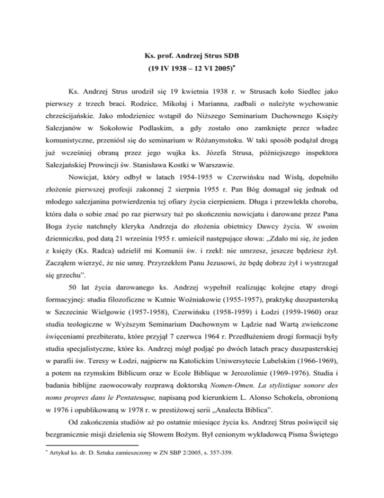 Ks. prof. Andrzej Strus SDB (19 IV 1938 – 12 VI 2005) Ks. Andrzej Strus urodził się 19 kwietnia 1938 r. w Strusach koło Siedlec jako pierwszy z trzech braci. Rodzice, Mikołaj i Marianna, zadbali o należyte wychowanie chrześcijańskie. Jako młodzieniec wstąpił do Niższego Seminarium Duchownego Księży Salezjanów w Sokołowie Podlaskim, a gdy zostało ono zamknięte przez władze komunistyczne, przeniósł się do seminarium w Różanymstoku. W taki sposób podążał drogą już wcześniej obraną przez jego wujka ks. Józefa Strusa, późniejszego inspektora Salezjańskiej Prowincji św. Stanisława Kostki w Warszawie. Nowicjat, który odbył w latach 1954-1955 w Czerwińsku nad Wisłą, dopełniło złożenie pierwszej profesji zakonnej 2 sierpnia 1955 r. Pan Bóg domagał się jednak od młodego salezjanina potwierdzenia tej ofiary życia cierpieniem. Długa i przewlekła choroba, która dała o sobie znać po raz pierwszy tuż po skończeniu nowicjatu i darowane przez Pana Boga życie natchnęły kleryka Andrzeja do złożenia obietnicy Dawcy życia. W swoim dzienniczku, pod datą 21 września 1955 r. umieścił następujące słowa: „Zdało mi się, że jeden z księży (Ks. Radca) udzielił mi Komunii św. i rzekł: nie umrzesz, jeszcze będziesz żył. Zacząłem wierzyć, że nie umrę. Przyrzekłem Panu Jezusowi, że będę dobrze żył i wystrzegał się grzechu”. 50 lat życia darowanego ks. Andrzej wypełnił realizując kolejne etapy drogi formacyjnej: studia filozoficzne w Kutnie Woźniakowie (1955-1957), praktykę duszpasterską w Szczecinie Wielgowie (1957-1958), Czerwińsku (1958-1959) i Łodzi (1959-1960) oraz studia teologiczne w Wyższym Seminarium Duchownym w Lądzie nad Wartą zwieńczone święceniami prezbiteratu, które przyjął 7 czerwca 1964 r. Przedłużeniem drogi formacji były studia specjalistyczne, które ks. Andrzej mógł podjąć po dwóch latach pracy duszpasterskiej w parafii św. Teresy w Łodzi, najpierw na Katolickim Uniwersytecie Lubelskim (1966-1969), a potem na rzymskim Biblicum oraz w Ecole Biblique w Jerozolimie (1969-1976). Studia i badania biblijne zaowocowały rozprawą doktorską Nomen-Omen. La stylistique sonore des noms propres dans le Pentateuque, napisaną pod kierunkiem L. Alonso Schokela, obronioną w 1976 i opublikowaną w 1978 r. w prestiżowej serii „Analecta Biblica”. Od zakończenia studiów aż po ostatnie miesiące życia ks. Andrzej Strus poświęcił się bezgranicznie misji dzielenia się Słowem Bożym. Był cenionym wykładowcą Pisma Świętego Artykuł ks. dr. D. Sztuka zamieszczony w ZN SBP 2/2005, s. 357-359. w salezjańskich seminariach i centrach studiów w Lądzie nad Wartą, Kutnie Woźniakowie, a potem w Cremisan koło Betlejem (1986-1990), Lubumbashi (1990-1992), Turynie (19961997) oraz na Uniwersytecie Salezjańskim (UPS) w Rzymie (1992-2005). Tam też został mianowany profesorem nadzwyczajnym (27 VII 1992), a po 12 latach pracy dydaktycznej i badawczej profesorem zwyczajnym (26 III 2004). Ks. Andrzej był członkiem-założycielem Associazione Biblica Salesiana i od 1993 do 2004 r. przewodniczył temu stowarzyszeniu, organizując i animując cykliczne sympozja biblistów salezjańskich z całego świata. Ostatnie z nich, zatytułowane Lettura orante della Bibbia: Lectio divina e vita salesiana, było przygotowane i prowadzone przez ks. Andrzeja w dniach od 27 grudnia 2004 do 3 stycznia 2005 r. w Krakowie. To wówczas komentując epizod z życia proroka Ezechiela, który spożywając zwój czuje słodycz miodu (Ez 3,3), powiedział: „Słowo wysłuchane i przyswojone jako pożywienie (...) ma smak miodu. Lecz, gdy zostaje skierowane do innych, staje się gorzkie, nie chciane, odrzucone, bo nie może się Nim delektować ten, kto tego Słowa nie pragnie (...) Jest to jedyne prawdziwe Słowo w historii, jest to jedyne autentyczne przesłanie, które powinno wybrzmiewać w sercu i uszach tego, kto Je głosi. Słuchanie Słowa powinno zawłaszczyć sobie moje serce”. Wielką pasją ks. Strusa była też archeologia. Jego wychowankowie z Cremisan zapamiętali go jako doskonałego przewodnika po miejscach związanych z biblijną historią zbawienia, a nade wszystko jako organizatora i prowadzącego prace wykopaliskowe we wskazywanym przez tradycję miejscu pochówku św. Szczepana Męczennika w Khirbet Fattir-Bet Gemal. Na prace te otrzymał pozwolenie Israel’s Antiquities Authority i prowadził je podczas kilku kampanii wykopaliskowych we współpracy z Ecole Biblique et Archéologique Francaise (1989-1991) oraz ze Studium Biblicum Franciscanum (1992-1998). Ich rezultaty zostały opublikowane w biuletynie ,,Associazione Biblica Salesiana”, a w ostatnich latach w pozycji książkowej (Khirbet Fattir-Bet Gemal. Two Ancient Jewish and Christian Sites in Israel, LAS, Roma 2003). Wielka aktywność ks. Andrzeja Strusa na polu badań biblijnych oraz archeologicznych, jak również wielka kompetencja wykładowcy przedmiotów biblijnych została potwierdzona przez jego liczne publikacje książkowe i artykuły, które ukazywały się w wielu prestiżowych czasopismach specjalistycznych. W pamięci jego studentów, współpracowników oraz osób, które mogły go poznać, ks. Andrzej zapisał się jako osoba otwarta, zawsze gotowa przyjść z pomocą. W taki sposób, najlepiej jak potrafił, realizował misję dzielenia się Słowem przez świadectwo życia, aż do ostatniego fiat – amen wypowiedzianego w obecności jednego ze swoich braci oraz salezjanów i sióstr zakonnych zgromadzonych przy nim w Rzymie, w niedzielę 12 czerwca 2005 r. Wtedy to, po długiej chorobie nowotworowej, mógł powtórzyć za św. Szczepanem, którego ziemskich śladów poszukiwał podczas prac archeologicznych: „Panie Jezu, przyjmij ducha mojego!” (Dz 7,59). Ks. Dariusz Sztuk SDB, SBP 211