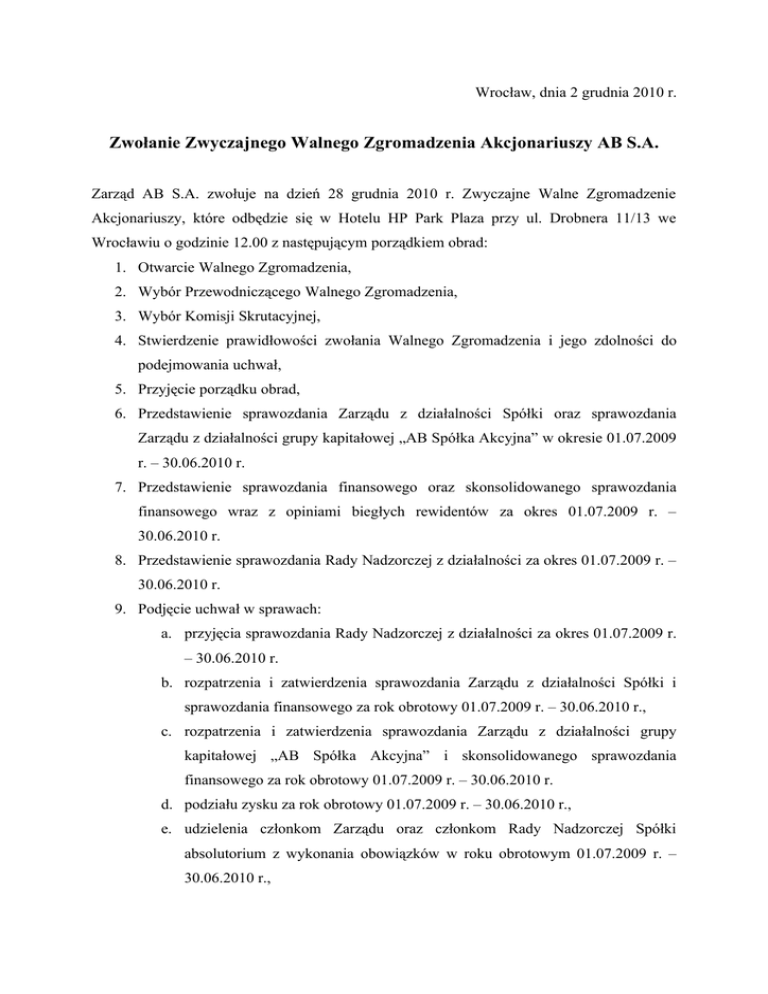 Wrocław, dnia 2 grudnia 2010 r. Zwołanie Zwyczajnego Walnego Zgromadzenia Akcjonariuszy AB S.A. Zarząd AB S.A. zwołuje na dzień 28 grudnia 2010 r. Zwyczajne Walne Zgromadzenie Akcjonariuszy, które odbędzie się w Hotelu HP Park Plaza przy ul. Drobnera 11/13 we Wrocławiu o godzinie 12.00 z następującym porządkiem obrad: 1. Otwarcie Walnego Zgromadzenia, 2. Wybór Przewodniczącego Walnego Zgromadzenia, 3. Wybór Komisji Skrutacyjnej, 4. Stwierdzenie prawidłowości zwołania Walnego Zgromadzenia i jego zdolności do podejmowania uchwał, 5. Przyjęcie porządku obrad, 6. Przedstawienie sprawozdania Zarządu z działalności Spółki oraz sprawozdania Zarządu z działalności grupy kapitałowej „AB Spółka Akcyjna” w okresie 01.07.2009 r. – 30.06.2010 r. 7. Przedstawienie sprawozdania finansowego oraz skonsolidowanego sprawozdania finansowego wraz z opiniami biegłych rewidentów za okres 01.07.2009 r. – 30.06.2010 r. 8. Przedstawienie sprawozdania Rady Nadzorczej z działalności za okres 01.07.2009 r. – 30.06.2010 r. 9. Podjęcie uchwał w sprawach: a. przyjęcia sprawozdania Rady Nadzorczej z działalności za okres 01.07.2009 r. – 30.06.2010 r. b. rozpatrzenia i zatwierdzenia sprawozdania Zarządu z działalności Spółki i sprawozdania finansowego za rok obrotowy 01.07.2009 r. – 30.06.2010 r., c. rozpatrzenia i zatwierdzenia sprawozdania Zarządu z działalności grupy kapitałowej „AB Spółka Akcyjna” i skonsolidowanego sprawozdania finansowego za rok obrotowy 01.07.2009 r. – 30.06.2010 r. d. podziału zysku za rok obrotowy 01.07.2009 r. – 30.06.2010 r., e. udzielenia członkom Zarządu oraz członkom Rady Nadzorczej Spółki absolutorium z wykonania obowiązków w roku obrotowym 01.07.2009 r. – 30.06.2010 r., f. przedłużenia terminu do wykonania pkt. 5 Uchwały nr 1/2008 Nadzwyczajnego Walnego Zgromadzenia AB Spółka Akcyjna we Wrocławiu z dnia 19 sierpnia 2008r. 10. Wolne wnioski. 11. Zamknięcie obrad Zwyczajnego Walnego Zgromadzenia Do udziału w Walnym Zgromadzeniu uprawnione będą wyłącznie osoby będące Akcjonariuszami Spółki w dniu 12 grudnia 2010 r. (dzień rejestracji uczestnictwa w walnym zgromadzeniu), jeżeli: a. będąc uprawnionymi z akcji imiennych będą wpisani do księgi akcyjnej w dniu 12 grudnia 2010 r., tj. w dniu rejestracji uczestnictwa w Zwyczajnym Walnym Zgromadzeniu. b. będąc uprawnionymi ze zdematerializowanych akcji na okaziciela zostaną umieszczeni na liście uprawnionych ze zdematerializowanych akcji na okaziciela ustalonej przez Spółkę na podstawie wykazu sporządzonego przez podmiot prowadzący depozyt papierów wartościowych. Wykaz ten sporządzany jest przez podmiot prowadzący depozyt papierów wartościowych na podstawie wykazów przekazanych przez podmioty prowadzące rachunki papierów wartościowych. Podmioty prowadzące rachunki papierów wartościowych sporządzają wykaz na podstawie wystawionych zaświadczeń o prawie uczestnictwa w ZWZA. Zaświadczenia o prawie uczestnictwa w Walnym Zgromadzeniu wydawane są wyłącznie na żądanie akcjonariusza. Akcjonariusz może złożyć żądanie nie wcześniej niż w dniu ukazania się ogłoszenia o zwołaniu Zwyczajnego Walnego Zgromadzenia oraz nie później niż w pierwszym dniu powszednim po dniu rejestracji, tj. w dniu 13 grudnia 2010 r. W razie nie złożenia przez Akcjonariusza żądania wystawienia imiennego zaświadczenia o prawie do uczestniczenia w Walnym Zgromadzeniu, Akcjonariusz nie zostanie umieszczony w wykazie oraz na liście uprawnionych ustalonej przez Spółkę. Zgodnie z art. 407 § 1 Kodeksu spółek handlowych lista akcjonariuszy uprawnionych do uczestnictwa w Walnym Zgromadzeniu będzie wyłożona do wglądu w siedzibie Spółki we Wrocławiu przy ul. Kościerzyńskiej 32 na trzy dni powszednie przed terminem Walnego Zgromadzenia. Na żądanie Akcjonariusza lista akcjonariuszy uprawnionych do uczestnictwa w ZWZA jest przesyłana na wskazany w żądaniu adres mailowy Akcjonariusza. Akcjonariuszowi lub Akcjonariuszom reprezentującym co najmniej jedną dwudziestą kapitału zakładowego przysługuje prawo do: 1. żądania umieszczenia określonych spraw w porządku obrad Walnego Zgromadzenia. Żądanie powinno zostać zgłoszone Zarządowi nie później niż na dwadzieścia jeden dni przed wyznaczonym terminem Zgromadzenia. Żądanie powinno zawierać uzasadnienie lub projekt uchwały dotyczącej proponowanego punktu porządku obrad. Żądanie może zostać złożone w postaci elektronicznej. 2. zgłaszania Spółce przed terminem Walnego Zgromadzenia na piśmie lub przy wykorzystaniu środków komunikacji elektronicznej projektów uchwał dotyczących spraw wprowadzonych do porządku obrad Walnego Zgromadzenia lub spraw, które mają zostać wprowadzone do porządku obrad. Każdy z Akcjonariuszy może również zgłaszać podczas Walnego Zgromadzenia projekty uchwał dotyczące spraw wprowadzonych do porządku obrad. Akcjonariusze mają prawo uczestniczenia w ZWZA osobiście lub przez pełnomocnika. Pełnomocnictwo do uczestnictwa w Walnym Zgromadzeniu i wykonywania prawa głosu powinno być udzielone na piśmie lub w postaci elektronicznej. Udzielenie pełnomocnictwa w postaci elektronicznej nie wymaga opatrzenia bezpiecznym podpisem elektronicznym weryfikowanym przy pomocy ważnego kwalifikowanego certyfikatu. Udzielenie pełnomocnictwa w formie elektronicznej oraz zawiadomienie o udzieleniu takiego pełnomocnictwa powinno nastąpić na adres mailowy Spółki: [email protected]. Udzielając pełnomocnictwa Akcjonariusz może skorzystać z formularza zamieszczonego na stronie internetowej spółki: www.ab.pl. Ryzyko związane użyciem elektronicznej formy komunikacji leży po stronie Akcjonariusza. Przed udzieleniem pełnomocnictwa w formie elektronicznej Akcjonariusz ma obowiązek dostarczyć osobiście lub listem poleconym nadanym na adres siedziby Spółki – ul. Kościerzyńska 32, 51-416 Wrocław, pisemne oświadcz