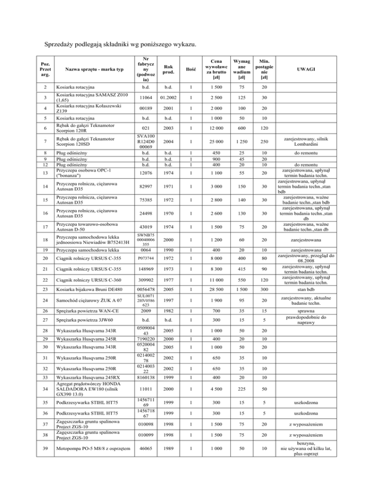 Sprzedaży podlegają składniki wg poniższego wykazu.