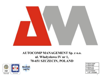 AUTOCOMP MANAGEMENT Sp. z o.o. ul. Władysława IV nr 1, 70-651 SZCZECIN, POLAND Certificate AQAP nr 698/A/2009 Certificate ISO nr 698/S/2009 Koncesja MSWiA nr B – 075/2007 1 Systemy okrętowe opracowane, produkowane i instalowane na okrętach przez ACM system dynamicznego pozycjonowania okrętu Okręt ratowniczy ORP LECH główna konsola sterowania okrętem 5 Systemy okrętowe opracowane, produkowane i instalowane na okrętach przez ACM Konsola systemu Dynamicznego Pozycjonowania ORP Lech 6 Systemy okrętowe opracowane, produkowane i instalowane na okrętach przez ACM ORP Lech. Ssystem poszukiwania obiektów na dnie HOMAR-P 7 Symulator nawigacyjny HOMAR- NAV dla Centrum Szkolenia Marynarki Wojennej w Ustce. 9 Symulator nawigacyjny HOMAR- NAV dla Centrum Szkolenia Marynarki Wojennej w Ustce. 10 Symulator nawigacyjny HOMAR- NAV dla Centrum Szkolenia Marynarki Wojennej w Ustce. 11 Symulator nawigacyjny HOMAR- NAV Stanowisko instruktora 12 Centrum Szkolenia Marynarki Wojennej Ustka Symulator grupy okrętów (2010) Centrum Szkolenia Marynarki Wojennej Ustka Symulator grupy okrętów Mostek nawigacyjny głównego okrętu Mostki nawigacyjne grupy okrętów Stanowisko instruktora Centrum Szkolenia Marynarki Wojennej Ustka Symulator okrętu wojennego (2010) Stanowisko instruktora Symulator mostka okrętu wojennego z monitorami sterowania uzbrojeniem Symulator sonarów Symulator radaru ARPA 16 Laboratorium elektryczne 17 Laboratorium elektryczne Stanowisko pomp i hydroforów 18 Stanowisko dydaktyczne synchronizacji prądnic 19 Stanowisko dydaktyczne synchronizacji prądnic 20 Laboratorium dydaktyczne automatyki urządzeń pomocniczych siłowni 21 Laboratorium dydaktyczne automatyki urządzeń pomocniczych siłowni 22 Centrum Szkolenia Marynarki Wojennej Ustka Laboratorium dydaktyczne siłowni okrętowych (2010) Centrum Szkolenia Marynarki Wojennej Ustka Symulator walki z ogniem i wodą na okręcie Symulator jest nowoczesnym narzędziem przeznaczonym do szkolenia załóg okrętów do walki z zagrożeniami jakie stwarza ogniem i woda. Symulator zapewnia możliwość treningu w walce z ogniem i woda: Używania odpowiednich narzędzi do walki z ogniem i wodą • Trening procedur walki wodą i ogniem Centrum Szkolenia Marynarki Wojennej Ustka Symulator Obrony Przeciwawaryjnej Okrętu Symulator ma modułową strukturę i składa się ze stanowiska dowódcy akcji (z dużym ekranem i stanowisk poszczególnych członków grupy ratowniczej Centrum Szkolenia Marynarki Wojennej Ustka Symulator Obrony Przeciwawaryjnej Okrętu Centrum Szkolenia Marynarki Wojennej Ustka Symulator Obrony Przeciwawaryjnej Okrętu Centrum Szkolenia Marynarki Wojennej Ustka Symulator Obrony Przeciwawaryjnej Okrętu Do wizualizacji zagrożeń na okręcie w symulatorze zastosowano grafikę 3D wykorzystującą wszystkie najnowsze rozwiązania sprzętowe i programowe Centrum Szkolenia Marynarki Wojennej Ustka Symulator Obrony Przeciwawaryjnej Okrętu Centrum Szkolenia Marynarki Wojennej Ustka Emergency simulator for ship ( fire and water fight) Centrum Szkolenia Marynarki Wojennej Ustka Symulator Obrony Przeciwawaryjnej Okrętu Centrum Szkolenia Marynarki Wojennej Ustka Symulator do treningu strzelań rakiet z RBS15. Symulator jest nowoczesnym urządzeniem przeznaczonym do treningu załóg okrętów w przygotowaniu i w prowadzeniu artyleryjsko-rakietowych ataków. Symulator jest urządzeniem do treningu w podejmowaniu decyzji w którym szkoleni podejmują decyzję w oparciu o następujące informacje: • Wybór celu i sposobu śledzenia celu. • Wybór rodzaju ognia • Przygotowania rakiet do startu • Organizacja obserwacji i ocena rezultatów ognia wraz z organizacja obserwacji rezultatów ognia oraz jago kontynuacją lub przerwaniem. • W podejmowaniu wszelkich decyzji związanych ze strzelaniem Centrum Szkolenia Marynarki Wojennej Ustka Trenażer przyrządów kierowania strzelaniem systemu rakietowego RBS-15 Trenażer ma konstrukcję modułową, dzięki czemu możliwe jest skonstruowanie na jego bazie konfiguracji o dowolnej liczbie stanowisk ćwiczących Centrum Szkolenia Marynarki Wojennej Ustka Trenażer przyrządów kierowania strzelaniem systemu rakietowego RBS-15 Symulator został wyposażony w moduły programowe pozwalające na naukę budowy i obsługi systemów artylerii pokładowej wykonany w technologii zobrazowania stereoskopowego 3D. Centrum Szkolenia Marynarki Wojennej Ustka Trenażer przyrządów kierowania strzelaniem systemu rakietowego RBS-15 Centrum Szkolenia Marynarki Wojennej Ustka Trenażer przyrządów kierowania strzelaniem systemu rakietowego RBS-15 Autocomp Management Symulatory dla Wojsk Lądowych 45 45 Symulatory do nauki jazdy pojazdami wojskowymi SYMULATOR “TNJ-21 – PANCERNIK” DO NAUKI JAZDY BWP-1. 47 Symulatory do nauki jazdy pojazdami wojskowymi SYMULATOR “TNJ-21 – PANCERNIK” DO NAUKI JAZDY BWP-1, wnętrze symulatora 48 Symulatory do nauki jazdy pojazdami wojskowymi SYMULATOR “TNJ-21 – PANCERNIK” DO NAUKI JAZDY BWP-1, przykład zobrazowania 49 SYMULATOR “TNJ-21 – PANCERNIK” DO NAUKI JAZDY BWP-1 50 Symulatory do nauki jazdy pojazdami wojskowymi SYMULATOR JAGUAR 4M DO NAUKI JAZDY CZOŁGIEM T-72. 51 Symulatory do nauki jazdy pojazdami wojskowymi SYMULATOR JAGUAR 4M DO NAUKI JAZDY CZOŁGIEM T-72, bez obudowy zewnętrznej. 52 Symulatory do nauki jazdy pojazdami wojskowymi LEOPARD 1A-5, wykonano na zamówienia firmy Kraus-Maffei Wegmann 53 LEOPARD 1A-5, wykonano na zamówienia KMW 54 Symulatory do nauki jazdy pojazdami wojskowymi Jaskier kompleksowy symulator jazdy KTO ROSOMAK 55 Symulatory do nauki jazdy pojazdami wojskowymi Jaskier kompleksowy symulator jazdy KTO ROSOMAK 56 Tasznik, Armoured vehicle ROSOMAK (PATRIA) turret simulator. 60 Tasznik, Armoured vehicle ROSOMAK (PATRIA) turret simulator. 61 Oto Melera HITFIST 30m turret simulator 65 Oto Melera HITFIST 30m turret simulator 66 Oto Melera HITFIST 30m turret simulator 67 Oto Melera HITFIST 30m turret simulator 68 Oto M