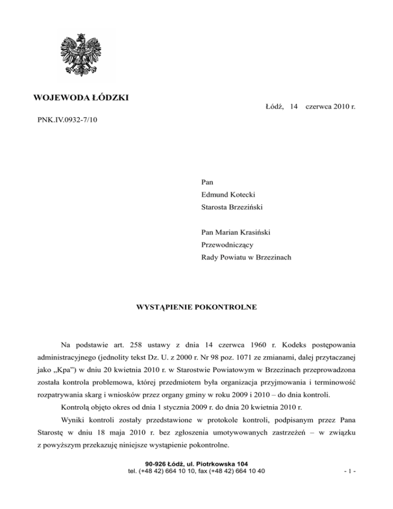WOJEWODA ŁÓDZKI Wojewoda Łódzki Łódź, 14 czerwca 2010 r. PNK.IV.0932-7/10 Pan Edmund Kotecki Starosta Brzeziński Pan Marian Krasiński Przewodniczący Rady Powiatu w Brzezinach WYSTĄPIENIE POKONTROLNE Na podstawie art. 258 ustawy z dnia 14 czerwca 1960 r. Kodeks postępowania administracyjnego (jednolity tekst Dz. U. z 2000 r. Nr 98 poz. 1071 ze zmianami, dalej przytaczanej jako „Kpa”) w dniu 20 kwietnia 2010 r. w Starostwie Powiatowym w Brzezinach przeprowadzona została kontrola problemowa, której przedmiotem była organizacja przyjmowania i terminowość rozpatrywania skarg i wniosków przez organy gminy w roku 2009 i 2010 – do dnia kontroli. Kontrolą objęto okres od dnia 1 stycznia 2009 r. do dnia 20 kwietnia 2010 r. Wyniki kontroli zostały przedstawione w protokole kontroli, podpisanym przez Pana Starostę w dniu 18 maja 2010 r. bez zgłoszenia umotywowanych zastrzeżeń – w związku z powyższym przekazuję niniejsze wystąpienie pokontrolne. 90-926 Łódź, ul. Piotrkowska 104 tel. (+48 42) 664 10 10, fax (+48 42) 664 10 40 -1- Przeprowadzona kontrola wykazała następujące nieprawidłowości w zakresie działalności Starostwa Powiatowego w Brzezinach: 1. Skarga z 18 lutego 2009 r. nie została wpisana do rejestru skarg i wniosków oraz nie udzielono skarżącemu pisemnej odpowiedzi. Jak wynika z zebranego materiału dowodowego, skarga ta nie została wpisana do rejestru (wbrew postanowieniom Instrukcji kancelaryjnej oraz przepisu art. 254 Kpa) z uwagi na to, że nie została skierowana do komórki zajmującej się skargami i wnioskami. Ponadto ww. skarga mimo że skierowana była do Starosty Brzezińskiego, została rozpatrzona przez Komisję Rewizyjną Rady Powiatu w Brzezinach bez powiadomienia skarżącego o fakcie jej przekazania, co stanowi naruszenie przepisu art. 231 Kpa. Komisja Rewizyjna rozpatrywała skargę na posiedzeniu, na którym udzielono obecnemu skarżącemu ustnej informacji o sposobie jej załatwienia. Brak odpowiedzi na skargę jest niedopuszczalny w świetle brzmienia przepisu art. 238 § 1 Kpa (obowiązek skierowania do skarżącego zawiadomienia o sposobie załatwienia skargi). W przedmiotowej sprawie nie można ponadto doszukać się przesłanek opisanych w przepisie art. 14 § 2 Kpa, warunkujących możliwość odstąpienia od zasady pisemności postępowania. Ponadto, zgodnie z przepisem art. 229 Kpa, odpowiedzi na skargę udziela organ, co w przypadku organu kolegialnego, jakim jest Rada Powiatu w Brzezinach, oznacza konieczność zajęcia stanowiska w drodze uchwały. W konsekwencji, w ocenie zarządzającego kontrolę, skarga nie została załatwiona przez organ. 2. Skarga z 4 sierpnia 2009 r. stanowi w istocie zażalenie na niezałatwienie w terminie skargi, o której mowa w punkcie 1, skierowanej do Starosty Brzezińskiego. Nadawca nie oznaczył, jakiego organu dotyczy zażalenie, jednak w dacie jego skierowania skarga rozpatrywana była przez Starostę Brzezińskiego (brak bowiem pisma przekazującego sprawę na podstawie przepisu art. 231 Kpa). Przedmiotowe zażalenie rozpatrzyła Rada Powiatu w Brzezinach wydając uchwałę. Stanowi to naruszenie przepisu art. 37 Kpa, zgodnie z którym zażalenie na niezałatwienie sprawy w terminie rozpoznawane jest przez organ administracji publicznej wyższego stopnia, którym w powyższym przypadku jest Samorządowe Kolegium Odwoławcze w Łodzi. Nie ma przy tym znaczenia, do jakiego organu skarga została skierowana, bowiem organ administracji publicznej zobowiązany jest badać swoją właściwość z urzędu na każdym etapie postępowania. 3. W sprawie skargi dotyczącej niezałatwienia wniosku w przedmiocie wydania dokumentacji geodezyjno-kartograficznej nowy termin załatwienia sprawy wyznaczono 90-926 Łódź, ul. Piotrkowska 104 tel. (+48 42) 664 10 10, fax (+48 42) 664 10 40 -2- wydając w tym zakresie postanowienie, w którym znalazło się pouczenie o możliwości wniesienia zażalenia do Łódzkiego Wojewódzkiego Inspektora Nadzoru Geodezyjnego i Kartograficznego. Wydanie w tym przedmiocie postanowienia nie stanowi nieprawidłowości, gdyż doktryna dopuszcza taką formę dokonania tej czynności. Za nieprawidłowość należy jednak uznać umieszczenie w ww. postanowieniu pouczenia o możliwości jego zaskarżenia. Zgodnie bowiem z przepisem art. 141 § 1 Kpa na wydane w toku postępowania postanowienia służy stronie zażalenie, gdy Kodeks tak stanowi, nie ma to zaś miejsca w omawianym przypadku. Ponadto dla zadania określonego w ustawie z 17 maja 1989 r. Prawo geodezyjne i kartograficzne (j. t. Dz. U. z 2005 r. Nr 240 poz. 2027 ze zm.) jako prowadzenie państwowego zasobu geodezyjnego i kartograficznego organem nadzoru nad działalnością Starosty jest Wojewódzki Inspektor Nadzoru Geodezyjnego i Kartograficznego (zgodnie z przepisem art. 40 ust. 3a ustawy). Komentatorzy wskazują, że w przypadku, gdy przepisy szczególne wskazują organ nadzorujący daną sferę działalności innego organu, wyłącza to stosowanie ogólnych zasad określonych w przepisie art. 229 Kpa, dotyczących właściwości organów do rozpoznania skarg. Należy zauważyć, że dyspozycja przepisu art. 229 Kpa brzmi „jeżeli przepisy szczególne nie określają innych organów właściwych do rozpatrywania skarg [...]” co wskazuje na prymat uregulowań specjalnych nad Kodeksem. 4. Skarga z dnia 29 marca 2010 r. została przez Starostę Brzezińskiego przekazana według właściwości Wójtowi Gminy Rogów. Skarga stanowiła zażalenie na niezałatwienie sprawy w terminie przez Wójta Gminy Rogów i powinna zostać skierowana, zgodnie z przepisem art. 37 Kpa, do organu administracji publicznej wyższego stopnia. Przyczyną powstania powyższych nieprawidłowości jest niedostateczna znajomość przepisów Kodeksu postępowania administracyjnego w części dotyczącej skarg i wniosków oraz w zakresie instytucji zażalenia na niezałatwienie sprawy w terminie. W odniesieniu do niewpisania 