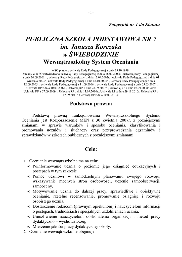 -1- Załącznik nr 1 do Statutu PUBLICZNA SZKOŁA PODSTAWOWA NR 7 im. Janusza Korczaka w ŚWIEBODZINIE Wewnątrzszkolny System Oceniania WSO przyjęty uchwałą Rady Pedagogicznej z dnia 25.10.1999r. Zmiany w WSO zatwierdzono uchwałą Rady Pedagogicznej z dnia 18.09.2000r. , uchwałą Rady Pedagogicznej z dnia 24.09.2001r. , uchwałą Rady Pedagogicznej z dnia 12.09.2002r. , uchwałą Rady Pedagogcznej z dnia 01 września 2003r., uchwałą Rady Pedagogicznej z dnia 18.10.2004r. , uchwałą Rady Pedagogicznej z dnia 12.09.2005r., uchwałą Rady Pedagogicznej z 11.09.2006r., uchwałą Rady Pedagogicznej z dnia 05.03.2007r., Uchwałą RP z dnia 10.09.2007r., Uchwałą RP z dnia 28.09.2007r. , Uchwałą RP z dnia 08.09.2008r. oraz Uchwałą RP z 07.09.2009r., Uchwałą RP z dnia 13.09.2010r., Uchwałą RP z dnia 29.11.2010r. Uchwałą RP z 12.09.2011r. Uchwałą RP z dnia 10.09.2012r. Podstawa prawna Podstawą prawną funkcjonowania Wewnątrzszkolnego Systemu Oceniania jest Rozporządzenie MEN z 30 kwietnia 2007r. z późniejszymi zmianami w sprawie warunków i sposobu oceniania, klasyfikowania i promowania uczniów i słuchaczy oraz przeprowadzania egzaminów i sprawdzianów w szkołach publicznych z późniejszymi zmianami. Cele: 1. Ocenianie wewnątrzszkolne ma na celu: • Poinformowanie ucznia o poziomie jego osiągnięć edukacyjnych i postępach w tym zakresie • Pomoc uczniowi w samodzielnym planowaniu swojego rozwoju, wskazywanie mocnych stron osobowości, uczenie samoobserwacji, samooceny, • Motywowanie ucznia do dalszej pracy, sprawiedliwe i obiektywne ocenianie, rzetelne recenzowanie, promowanie osiągnięć i rozwoju osobistego ucznia, • Dostarczenie rodzicom (prawnym opiekunom) i nauczycielom informacji o postępach, trudnościach i specjalnych uzdolnieniach ucznia, • Umożliwienie nauczycielom doskonalenia organizacji i metod pracy dydaktyczno – wychowawczej, • Mierzenie jakości pracy dydaktycznej szkoły. 2. Ocenianie wewnątrzszkolne obejmuje: -2- • Formułowanie przez nauczycieli wymagań edukacyjnych oraz informowanie o nich uczniów i rodziców (prawnych opiekunów), • Bieżące ocenianie i śródroczne klasyfikowanie, według skali i w formach przyjętych w szkole oraz zaliczanie niektórych zajęć edukacyjnych, • Przeprowadzanie egzaminów klasyfikacyjnych, • Ustalanie ocen klasyfikacyjnych na koniec roku szkolnego (semestru) i warunki ich poprawiania. 3. Nauczyciele na początku każdego roku szkolnego informują uczniów oraz ich rodziców (prawnych opiekunów) o: • wymaganiach edukacyjnych niezbędnych do uzyskania poszczególnych śródrocznych i rocznych (semestralnych) ocen klasyfikacyjnych z obowiązkowych i dodatkowych zajęć edukacyjnych, wynikających z realizowanego przez siebie programu nauczania; • sposobach sprawdzania osiągnięć edukacyjnych uczniów; • warunkach i trybie uzyskania wyższej niż przewidywana rocznej (semestralnej) oceny klasyfikacyjnej z obowiązkowych i dodatkowych zajęć edukacyjnych. Zbiór wymagań edukacyjnych jest udostępniany przez nauczycieli przedmiotów na comiesięcznych dyżurach. 4. Wychowawca klasy na początku każdego roku szkolnego informuje 5. 6. 7. 8. uczniów oraz ich rodziców (prawnych opiekunów) o warunkach i sposobie oraz kryteriach oceniania zachowania oraz o warunkach i trybie uzyskania wyższej niż przewidywana rocznej oceny klasyfikacyjnej zachowania. Oceny są jawne dla ucznia i jego rodziców (prawnych opiekunów). Na wniosek ucznia lub jego rodziców (prawnych opiekunów) nauczyciel uzasadnia ustaloną ocenę. Na wniosek ucznia lub jego rodziców (prawnych opiekunów), sprawdzone i ocenione pisemne prace kontrolne oraz inna dokumentacja dotycząca oceniania ucznia jest udostępniana uczniowi lub jego rodzicom (prawnym opiekunom). Nauczyciel jest obowiązany, na podstawie opinii publicznej poradni psychologiczno-pedagogicznej, w tym publicznej poradni specjalistycznej, dostosować wymagania edukacyjne, o których mowa w § 4 ust. 1 pkt 1, do indywidualnych potrzeb psychofizycznych i edukacyjnych ucznia, u którego stwierdzono zaburzenia i odchylenia rozwojowe lub specyficzne trudności w uczeniu się, uniemożliwiające sprostanie tym wymaganiom, z zastrzeżeniem ust. 2 i 3. zgodnie z procedurą udzielania pomocy psychologiczno - pedagogicznej w PSP 7 w Świebodzinie. -3- 9. Dostosowanie wymagań edukacyjnych, o których mowa w § 4 ust. 1 pkt 1, do indywidualnych potrzeb psychofizycznych i edukacyjnych ucznia, u którego stwierdzono specyficzne trudności w uczeniu się, uniemożliwiające sprostanie tym wymaganiom, następuje także na podstawie opinii niepublicznej poradni psychologiczno-pedagogicznej, w tym niepublicznej poradni specjalistycznej, o której mowa w art. 71b ust. 3b ustawy z dnia 7 września 1991 r. o systemie oświaty, zwanej dalej "ustawą", z zastrzeżeniem ust. 3. zgodnie z procedurą udzielania pomocy psychologiczno - pedagogicznej w PSP 7 w Świebodzinie. 10. W przypadku ucznia posiadającego orzeczenie o potrzebie kształcenia specjalnego albo indywidualnego nauczania dostosowanie wymagań edukacyjnych, o których mowa w § 4 ust. 1 pkt 1, do indywidualnych potrzeb psychofizycznych i edukacyjnych ucznia następuje na podstawie tego orzeczenia zgodnie z procedurą udzielania pomocy psychologiczno pedagogicznej w PSP 7 w Świebodzinie. 11. Przy ustalaniu oceny z wychowania fizycznego, techniki, plastyki i muzyki należy w szczególności brać pod uwagę wysiłek wkładany przez ucznia w wywiązywanie się z obowiązków wynikających ze specyfiki tych zajęć. 12. Dyrektor szkoły zwalnia ucznia z zajęć wychowania fizycznego, zajęć komputerowych, informatyki lub technologii informacyjnej na podstawie opinii o ograniczonych możliwościach uczestniczenia ucznia w tych zajęciach wydanej przez lekarza, na czas określony w tej opinii. Jeżeli okres zwolnienia ucznia z zajęć wychowania fizycznego, zajęć komputerowych, informatyki lub technologii 