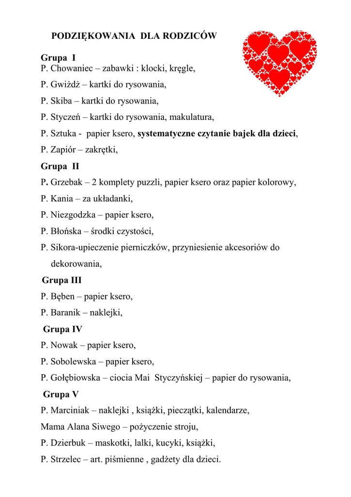 PODZIĘKOWANIA DLA RODZICÓW Grupa I P. Chowaniec – zabawki : klocki, kręgle, P. Gwiżdż – kartki do rysowania, P. Skiba – kartki do rysowania, P. Styczeń – kartki do rysowania, makulatura, P. Sztuka - papier ksero, systematyczne czytanie bajek dla dzieci, P. Zapiór – zakrętki, Grupa II P. Grzebak – 2 komplety puzzli, papier ksero oraz papier kolorowy, P. Kania – za układanki, P. Niezgodzka – papier ksero, P. Błońska – środki czystości, P. Sikora-upieczenie pierniczków, przyniesienie akcesoriów do dekorowania, Grupa III P. Bęben – papier ksero, P. Baranik – naklejki, Grupa IV P. Nowak – papier ksero, P. Sobolewska – papier ksero, P. Gołębiowska – ciocia Mai Styczyńskiej – papier do rysowania, Grupa V P. Marciniak – naklejki , książki, pieczątki, kalendarze, Mama Alana Siwego – pożyczenie stroju, P. Dzierbuk – maskotki, lalki, kucyki, książki, P. Strzelec – art. piśmienne , gadżety dla dzieci. Szczególne podziękowania kierujemy do: P. Grabowski – gr. II – pomoc p. ogrodnikowi w uprzątnięciu liści w ogrodzie przedszkolnym. P. Strzelec tata Marysi oraz ciocia – gr. V hobby naszych najbliższych : żeglarstwo ; prezentacja multimedialna podróży do kolejnych krajów, opowiadanie ciekawotek oraz śpiewanie szantów. Uświetnienie wieczoru kolęd dla dzieci oraz rodziców Mama Karola Kurczaba – gr. V - gra na skrzypcach, Mama Leny Wójcik oraz Lenka – gr. IV , - występ wokalny. DZIĘKUJEMY !!! Przypominamy Rodzicom o Akcji „ Cała Polska czyta dzieciom” i serdecznie zapraszamy do czytania dzieciom w swoich grupach.