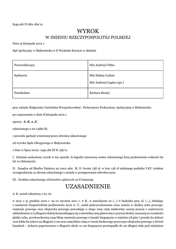 Sygn.akt II AKa 189/12 WYROK W IMIENIU RZECZYPOSPOLITEJ POLSKIEJ Dnia 15 listopada 2012 r. Sąd Apelacyjny w Białymstoku w II Wydziale Karnym w składzie Przewodniczący SSA Andrzej Ulitko Sędziowie SSA Halina Czaban SSA Andrzej Czapka (spr.) Protokolant Barbara Mosiej przy udziale Małgorzaty Gasińskiej-Werpachowskiej - Prokuratora Prokuratury Apelacyjnej w Białymstoku po rozpoznaniu w dniu 8 listopada 2012 r. sprawy A. K. s. Z. oskarżonego z art.148§1 kk z powodu apelacji wniesionej przez obrońcę oskarżonego od wyroku Sądu Okręgowego w Białymstoku z dnia 11 lipca 2012r. sygn.akt III K 158/11 I. Zmienia zaskarżony wyrok w ten sposób, że łagodzi orzeczoną wobec oskarżonego karę pozbawienia wolności do lat 10 (dziesięciu). II. Zasądza od Skarbu Państwa na rzecz adw. M. D. kwotę 738 zł, w tym 138 zł należnego podatku VAT, tytułem wynagrodzenia za obronę oskarżonego z urzędu w postępowaniu odwoławczym. III. Zwalnia oskarżonego od kosztów sądowych za II instancję. UZASADNIENIE A. K. został oskarżony o to, że: w nocy z 31 grudnia 2010 r. na 01 stycznia 2011 r. w B., w mieszkaniu nr (...) w budynku przy ul. (...), działając z zamiarem bezpośrednim pozbawienia życia A. T., zadał pokrzywdzonemu ciosy nożem w okolicę ucha prawego, ramienia prawego oraz obojczyka prawego powodując u niego ranę ciętą małżowiny usznej prawej z częściowym oddzieleniem 2/3 długości dolnej komunikująca się z niewielką raną płatowatą w prawej okolicy zausznej na wysokości płatka ucha, powierzchowną ranę kłutą ramienia prawego o kanale biegnącym w mięśniu od góry i przodu ku dołowi oraz lekko ku tyłowi na długości 2 cm oraz ranę kłuto-ciętą w rzucie barkowego przyczepu obojczyka prawego o dwóch kanałach – jednym poprzecznym o długości około 10 cm biegnącym prostopadle do osi długiej ciała pod mięśniem mostkowoobpojczykowosutkowym prawym do mięśni podgnykowych po stronie prawej oraz – drugim równoległym do osi długiej ciała o długości 5,5 cm położonym od przodu i góry ku dołowi oraz lekko ku tyłowi, biegnącego w tkance podskórnej i mięśniach, przeszywającego tętnicę podobojczykową prawą i gubiącego się w mięśniach poniżej tętnicy, z której to rany nastąpił krwotok powodujący w konsekwencji wstrząs krwotoczny u pokrzywdzonego A. T. skutkujący jego zgonem, tj. o czyn z art. 148 § 1 k.k. Sąd Okręgowy w Białymstoku wyrokiem z dnia 11 lipca 2012r. w sprawie III K 158/11: I. Oskarżonego A. K. uznał za winnego tego, że w nocy z 31 grudnia 2010 r. na 01 stycznia 2011 r. w B., w mieszkaniu nr (...) w budynku przy ul. (...), działając z zamiarem ewentualnym pozbawienia życia A. T., zadał pokrzywdzonemu ciosy nożem w okolicę ucha prawego, ramienia prawego oraz obojczyka prawego powodując u niego ranę ciętą małżowiny usznej prawej z częściowym oddzieleniem 2/3 długości dolnej komunikująca się z niewielką raną płatowatą w prawej okolicy zausznej na wysokości płatka ucha, powierzchowną ranę kłutą ramienia prawego o kanale biegnącym w mięśniu od góry i przodu ku dołowi oraz lekko ku tyłowi na długości 2 cm oraz ranę kłuto-ciętą w rzucie barkowego przyczepu obojczyka prawego o dwóch kanałach – jednym poprzecznym o długości około 10 cm biegnącym prostopadle do osi długiej ciała pod mięśniem mostkowoobpojczykowosutkowym prawym do mięśni podgnykowych po stronie prawej oraz – drugim równoległym do osi długiej ciała o długości 5,5 cm położonym od przodu i góry ku dołowi oraz lekko ku tyłowi, biegnącego w tkance podskórnej i mięśniach, przeszywającego tętnicę podobojczykową prawą i gubiącego się w mięśniach poniżej tętnicy, z której to rany nastąpił krwotok powodujący w konsekwencji wstrząs krwotoczny u pokrzywdzonego A. T. skutkujący jego zgonem, tj. czynu z art. 148 § 1 k.k. i za to na mocy art.148 § 1 k.k. skazuje go karę 15 (piętnastu) lat pozbawienia wolności. II. Na mocy art. 63 § 1 k.k. na poczet orzeczonej kary pozbawienia wolności zaliczył oskarżonemu A. K. okres rzeczywistego pozbawienia wolności w sprawie od dnia 11 kwietnia 2011 r. do dnia 15 września 2011 r. oraz od dnia 5 kwietnia 2012 r. do dnia 11 lipca 2012 r. V. Zasądził od Skarbu Państwa na rzecz adwokata M. D. kwotę 1620 zł (tysiąc sześćset dwadzieścia złotych) oraz 23 % podatku VAT od wyżej wymienionej kwoty tytułem kosztów obrony z urzędu. VI. Zasądził od Skarbu Państwa na rzecz adwokata B. G. kwotę 1620 zł (tysiąc sześćset dwadzieścia złotych) oraz 23 % podatku VAT od wyżej wymienionej kwoty tytułem kosztów obrony z urzędu. VII. Zwolnił oskarżonych A. K. od kosztów sądowych. Apelację od powyższego wyroku złożył obrońca oskarżonego A. K. na zasadzie art. 438 pkt 2 i 3 kk zarzucił mu: I. obrazę przepisów postępowania, która miała istotny wpływ na treść rozstrzygnięcia w zaskarżonej części, w tym: - art. 4, 7 i 366§1 kpk, w związku z zaniechaniem wszechstronnego rozważenia materiału dowodowego sprawy i a) pominięciem istotnych okoliczności przemawiających na korzyść oskarżonego, w szczególności: - zachowania oskarżonego w chwilę po upadku pokrzywdzonego, w tym wypowiedziane słowa („ja nie chciałem” – wyjaśnienia oskarżonej), zainteresowanie się stanem pokrzywdzonego, - niekwestionowanego zachowania pokrzywdzonego w toku zdarzenia, który odepchnął oskarżoną dążąc do zwarcia z oskarżonym, jak również zachowania pokrzywdzonego wcześniej, który jak twierdzi P. S. po spożyciu alkoholu był „zaczepliwy”, - miejsca, w którym znajdowała się oskarżona w momencie otrzymania przez pokrzywdzonego śmiertelnego ciosu (stała tuż obok obydwu mężczyzn, a nie jak twierdziła nie było jej w kuchni), - umiejscowienie noża – na suszarce za plecami pokrzywdzonego, umiejscowienia oskarżonego, który za plecami miał tylko parapet okna, nie miał odwrotu, - lo