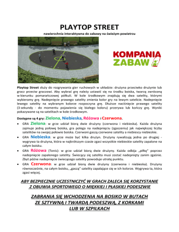 PLAYTOP STREET nawierzchnia interaktywna do zabawy na świeżym powietrzu Playtop Street służy do rozgrywania gier ruchowych w układzie: drużyna przeciwko drużynie lub gracz przeciw graczowi. Aby wybrać grę należy ustawić się na środku boiska, twarzą zwróconą w kierunku pomarańczowej półkuli. W kole środkowym znajdują się dwa satelity, którymi wybieramy grę. Nadepnięcie prawego satelity zmienia kolor gry na lewym satelicie. Nadepnięcie lewego satelity na wybranym kolorze rozpoczyna grę. Dłuższe naciśnięcie prawego satelity (3 sekundy - do momentu pojawienia się białego koloru) przerywa lub kończy grę. Wyniki pokazywane są na satelitach w kole środkowym. Dostępne są 4 gry: Zielona, Niebieska, Różowa i Czerwona. GRA Zielona: w grze udział biorą dwie drużyny (czerwona i niebieska). Każda drużyna zajmuje jedną połowę boiska, gra polega na nadepnięciu (zgaszeniu) jak największej liczby satelitów na swojej połowie boiska. Czerwoni gaszą czerwone satelity a niebiescy niebieskie. GRA Niebieska: w grze może być kilka drużyn. Drużyny rywalizują jedna po drugiej wygrywa ta drużyna, która w najkrótszym czasie zgasi wszystkie niebieskie satelity zapalone na całym boisku. GRA Różowa (Tenis): w grze udział biorą dwie drużyny. Każda odbija „piłkę” poprzez nadepnięcie zapalonego satelity. Świecący się satelita musi zostać nadepnięty zanim zgaśnie. Zbyt późne nadepnięcie świecącego satelity powoduje utratę punktu. GRA Czerwona: w grze udział biorą dwie drużyny (czerwona i niebieska). Drużyny równocześnie, na całym boisku, „gaszą” satelity zapalające się w ich kolorze. Wygrywa ta, która zgasi więcej. ABY BEZPIECZNIE UCZESTNICZYĆ W GRACH ZALECA SIĘ KORZYSTANIE Z OBUWIA SPORTOWEGO O MIĘKKIEJ I PŁASKIEJ PODESZWIE ZABRANIA SIĘ WCHODZENIA NA BOSIKO W BUTACH ZE SZTYWNĄ I TWARDĄ PODESZWĄ, Z KORKAMI LUB W SZPILKACH