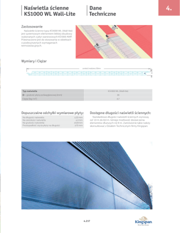 Naświetla ścienne KS1000 WL Wall-Lite 4. Dane Techniczne Zastosowanie Naświetle ścienne typu KS1000 WL (Wall-lite) jest systemowym elementem lekkiej obudowy wykonanych z płyt warstwowych KS1000 AWP. Przeznaczone jest do stosowania w obiektach o podwyższonych wymaganiach termoizolacyjnych. Wymiary i Ciężar szerokość modularna 100mm 38 Typ naświetla KS1000 WL (Wall-lite) D – grubość płyty poliwęglanowej [mm] 38 Ciężar [kg / m²] 4,7 Dopuszczalne odchyłki wymiarowe płyty: Na długości naświetla: Na szerokości naświetla: Na grubości naświetla: Prostopadłość cięcia płyty na długości ±20 mm ±2 mm ±0,8 mm ±10 mm Dostępne długości naświetli ściennych: Standardowe długości naświetli ściennych wynoszą od 1,0 m do 8,0 m. Istnieje możliwość dostarczenia elementów dłuższych niż 8 m. Zamówienie takie należy skonsultować z Działem Technicznym firmy Kingspan. 4.217 4. Naświetla ścienne KS1000 WL Wall-Lite Dane Techniczne Materiały: Pakowanie Wielokomorowa płyta poliwęglanowa o grubości 38 mm zakończona z obu stron zamkiem o kształcie umożliwiającym połączenie z płytą warstwową KS1000 AWP. Standardowe pakowanie naświetli – transport drogowy. Naświetla ścienne KS1000 WL układane są w stosy na drewniane palety. Góra, dół, boki oraz końce poszczególnych pakietów są zabezpieczone styropianowymi przekładkami a cały pakiet jest owinięty folią polietylenową. Uszczelnienia: Naświetle KS1000WL jest wyposażone w taśmę uszczelniającą (PCV) fabrycznie montowaną w złączu bocznym płyty oraz taśmę paro-przepuszczalną aplikowaną na montażu na obu krańcach świetlika. Dostawa Dostawa jest dokonywana transportem drogowym (jeśli w umowie nie jest zapisane inaczej). Za rozładunek płyt jest odpowiedzialny odbiorca/klient. Aluminiowe profile dystansowe: Razem z naświetlem, w komplecie dostarczane są aluminiowe profile dystansowe umożliwiające połączenie z płytą warstwową z ukrytym mocowaniem: KS1000 WL150 - KS1000 AWP150 Montaż na placu budowy Instrukcje montażu dostępne są w Dziale Technicznym firmy Kingspan. Firma Kingspan, na życzenie klienta, zapewnia szkolenie firm montażowych. KS1000 WL120 - KS1000 AWP120 KS1000 WL100 – KS1000 AWP100 Dobór łączników KS1000 WL080 – KS1000 AWP 80 Łączniki do montażu naświetli KS1000 WL należy dobierać w oparciu o wytyczne przedstawione w rozdziale dotyczącym płyty KS1000 AWP. KS1000 WL060 – KS1000 AWP 60 Parametry techniczne Przepuszczalność światła Naświetla ścienne KS1000 WL przepuszczają ok. 55% światła i są nieprzezroczyste. Izolacyjność cieplna Naświetla KS1000 WL mają współczynnik przenikania ciepła U=1,23 W/(m2K). Czynniki biologiczne Świetliki ścienne firmy Kingspan są generalnie odporne na działanie pleśni, grzybów oraz robactwa. Bezpieczeństwo konstrukcji Maksymalny rozstaw podpór dla elementów układanych jako pojedyncze pasma naświetli wynosi 6m. Dla świetlików układanych szeregowo maksymalny dopuszczalny rozstaw podpór wynosi 3m. Przepisy budowlane Naświetla ścienne KS1000WL firmy Kingspan spełniają wymagania krajowych przepisów i norm budowlanych. Jakość Naświetla ścienne firmy Kingspan produkowane są z najwyższej jakości materiałów, w nowoczesnym procesie technologicznym, z przestrzeganiem rygorystycznych wymagań norm kontroli jakości ISO 9001:2008 co gwarantuje ich długą i niezawodną eksploatację. 4.218 110,5 4.219 60,5 50 60,5 80 WL060PD_B 40 60 WL080PD_B 60 WL120PD_B 110.5 mm 80.5 mm 38 mm 38 mm 40,5 mm 20,5 mm 38 mm 38 mm 60,5 mm Wysokość profili dystansowych 38 mm zamek żeński 8 46 12 60 mm 80 mm 100 mm 120 mm 150 mm Grubość płyty KS1000 AWP Dostępne warianty naświetla z płytą AWP uszczelka montowana fabrycznie zamek męski Grubość naświetla KS1000WL 8 42 Szczegół zamka 38 WL060PD_A 110,5 60 80,5 WL080PD_A 40 WL120PD_A 80,5 40 WL100PD_B WL100PD_A WL150PD_B 60 20,5 40 WL150PD_A 20 Aluminiowe profile dystansowe szerokość całkowita 14 6 3 9 35 6 szerokość modularna 100mm Naświetla ścienne KS1000 WL Wall-Lite Wymiary Płyty 4. 40,5 40,5 20,5