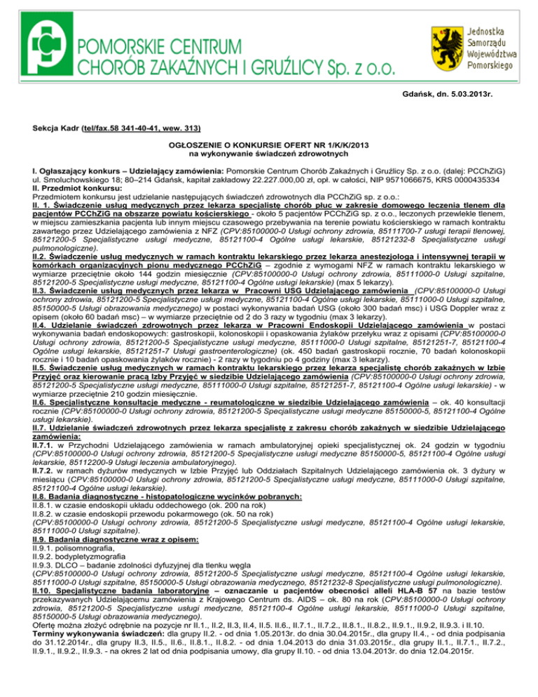 Gdańsk, dn. 5.03.2013r. Sekcja Kadr (tel/fax.58 341-40-41, wew. 313) OGŁOSZENIE O KONKURSIE OFERT NR 1/K/K/2013 na wykonywanie świadczeń zdrowotnych I. Ogłaszający konkurs – Udzielający zamówienia: Pomorskie Centrum Chorób Zakaźnych i Gruźlicy Sp. z o.o. (dalej: PCChZiG) ul. Smoluchowskiego 18; 80–214 Gdańsk, kapitał zakładowy 22.227.000,00 zł, opł. w całości, NIP 9571066675, KRS 0000435334 II. Przedmiot konkursu: Przedmiotem konkursu jest udzielanie następujących świadczeń zdrowotnych dla PCChZiG sp. z o.o.: II. 1. Świadczenie usług medycznych przez lekarza specjalistę chorób płuc w zakresie domowego leczenia tlenem dla pacjentów PCChZiG na obszarze powiatu kościerskiego - około 5 pacjentów PCChZiG sp. z o.o., leczonych przewlekle tlenem, w miejscu zamieszkania pacjenta lub innym miejscu czasowego przebywania na terenie powiatu kościerskiego w ramach kontraktu zawartego przez Udzielającego zamówienia z NFZ (CPV:85100000-0 Usługi ochrony zdrowia, 85111700-7 usługi terapii tlenowej, 85121200-5 Specjalistyczne usługi medyczne, 85121100-4 Ogólne usługi lekarskie, 85121232-8 Specjalistyczne usługi pulmonologiczne). II.2. Świadczenie usług medycznych w ramach kontraktu lekarskiego przez lekarza anestezjologa i intensywnej terapii w komórkach organizacyjnych pionu medycznego PCChZiG – zgodnie z wymogami NFZ w ramach kontraktu lekarskiego w wymiarze przeciętnie około 144 godzin miesięcznie (CPV:85100000-0 Usługi ochrony zdrowia, 85111000-0 Usługi szpitalne, 85121200-5 Specjalistyczne usługi medyczne, 85121100-4 Ogólne usługi lekarskie) (max 5 lekarzy). II.3. Świadczenie usług medycznych przez lekarza w Pracowni USG Udzielającego zamówienia (CPV:85100000-0 Usługi ochrony zdrowia, 85121200-5 Specjalistyczne usługi medyczne, 85121100-4 Ogólne usługi lekarskie, 85111000-0 Usługi szpitalne, 85150000-5 Usługi obrazowania medycznego) w postaci wykonywania badań USG (około 300 badań msc) i USG Doppler wraz z opisem (około 60 badań msc) – w wymiarze przeciętnie od 2 do 3 razy w tygodniu (max 3 lekarzy). II.4. Udzielanie świadczeń zdrowotnych przez lekarza w Pracowni Endoskopii Udzielającego zamówienia w postaci wykonywania badań endoskopowych: gastroskopii, kolonoskopii i opaskowania żylaków przełyku wraz z opisami (CPV:85100000-0 Usługi ochrony zdrowia, 85121200-5 Specjalistyczne usługi medyczne, 85111000-0 Usługi szpitalne, 85121251-7, 85121100-4 Ogólne usługi lekarskie, 85121251-7 Usługi gastroenterologiczne) (ok. 450 badań gastroskopii rocznie, 70 badań kolonoskopii rocznie i 10 badań opaskowania żylaków rocznie) - 2 razy w tygodniu po 4 godziny (max 3 lekarzy). II.5. Świadczenie usług medycznych w ramach kontraktu lekarskiego przez lekarza specjalistę chorób zakaźnych w Izbie Przyjęć oraz kierowanie pracą Izby Przyjęć w siedzibie Udzielającego zamówienia (CPV:85100000-0 Usługi ochrony zdrowia, 85121200-5 Specjalistyczne usługi medyczne, 85111000-0 Usługi szpitalne, 85121251-7, 85121100-4 Ogólne usługi lekarskie) - w wymiarze przeciętnie 210 godzin miesięcznie. II.6. Specjalistyczne konsultacje medyczne - reumatologiczne w siedzibie Udzielającego zamówienia – ok. 40 konsultacji rocznie (CPV:85100000-0 Usługi ochrony zdrowia, 85121200-5 Specjalistyczne usługi medyczne 85150000-5, 85121100-4 Ogólne usługi lekarskie). II.7. Udzielanie świadczeń zdrowotnych przez lekarza specjalistę z zakresu chorób zakaźnych w siedzibie Udzielającego zamówienia: II.7.1. w Przychodni Udzielającego zamówienia w ramach ambulatoryjnej opieki specjalistycznej ok. 24 godzin w tygodniu (CPV:85100000-0 Usługi ochrony zdrowia, 85121200-5 Specjalistyczne usługi medyczne 85150000-5, 85121100-4 Ogólne usługi lekarskie, 85112200-9 Usługi leczenia ambulatoryjnego). II.7.2. w ramach dyżurów medycznych w Izbie Przyjęć lub Oddziałach Szpitalnych Udzielającego zamówienia ok. 3 dyżury w miesiącu (CPV:85100000-0 Usługi ochrony zdrowia, 85121200-5 Specjalistyczne usługi medyczne, 85111000-0 Usługi szpitalne, 85121100-4 Ogólne usługi lekarskie). II.8. Badania diagnostyczne - histopatologiczne wycinków pobranych: II.8.1. w czasie endoskopii układu oddechowego (ok. 200 na rok) II.8.2. w czasie endoskopii przewodu pokarmowego (ok. 50 na rok) (CPV:85100000-0 Usługi ochrony zdrowia, 85121200-5 Specjalistyczne usługi medyczne, 85121100-4 Ogólne usługi lekarskie, 85111000-0 Usługi szpitalne). II.9. Badania diagnostyczne wraz z opisem: II.9.1. polisomnografia, II.9.2. bodypletyzmografia II.9.3. DLCO – badanie zdolności dyfuzyjnej dla tlenku węgla (CPV:85100000-0 Usługi ochrony zdrowia, 85121200-5 Specjalistyczne usługi medyczne, 85121100-4 Ogólne usługi lekarskie, 85111000-0 Usługi szpitalne, 85150000-5 Usługi obrazowania medycznego, 85121232-8 Specjalistyczne usługi pulmonologiczne). II.10. Specjalistyczne badania laboratoryjne – oznaczanie u pacjentów obecności alleli HLA-B 57 na bazie testów przekazywanych Udzielającemu zamówienia z Krajowego Centrum ds. AIDS – ok. 80 na rok (CPV:85100000-0 Usługi ochrony zdrowia, 85121200-5 Specjalistyczne usługi medyczne, 85121100-4 Ogólne usługi lekarskie, 85111000-0 Usługi szpitalne, 85150000-5 Usługi obrazowania medycznego). Ofertę można złożyć odrębnie na pozycje nr II.1., II.2, II.3, II.4, II.5. II.6., II.7.1., II.7.2., II.8.1., II.8.2., II.9.1., II.9.2, II.9.3. i II.10. Terminy wykonywania świadczeń: dla grupy II.2. - od dnia 1.05.2013r. do dnia 30.04.2015r., dla grupy II.4., - od dnia podpisania do 31.12.2014r., dla grupy II.3, II.5., II.6., II.8.1., II.8.2. - od dnia 1.04.2013 do dnia 31.03.2015r., dla grupy II.1., II.7.1., II.7.2., II.9.1., II.9.2., II.9.3. - na okres 2 lat od dnia podpisania umowy, dla grupy II.10. - od dnia 13.04.2013r. do dnia 12.04.2015r. III. Kwalifikacje zawodowe osób udzielających świadczeń opieki zdrowotnej oraz pozostałe warunki udziału w postępowaniu konkursowym wymagane od oferent