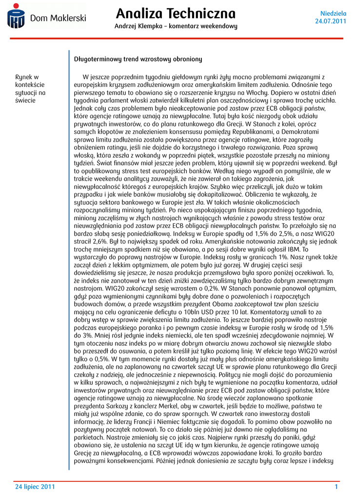 Analiza Techniczna Andrzej Klempka – komentarz weekendowy Niedziela 24.07.2011 Długoterminowy trend wzrostowy obroniony Rynek w kontekście sytuacji na świecie 24 lipiec 2011 W jeszcze poprzednim tygodniu giełdowym rynki żyły mocno problemami związanymi z europejskim kryzysem zadłużeniowym oraz amerykańskim limitem zadłużenia. Odnośnie tego pierwszego tematu to obawiano się o rozszerzenie kryzysu na Włochy. Dopiero w ostatni dzień tygodnia parlament włoski zatwierdził kilkuletni plan oszczędnościowy i sprawa trochę ucichła. Jednak cały czas problemem było nieakceptowanie pod zastaw przez ECB obligacji państw, które agencje ratingowe uznają za niewypłacalne. Tutaj była kość niezgody obok udziału prywatnych inwestorów, co do planu ratunkowego dla Grecji. W Stanach z kolei, oprócz samych kłopotów ze znalezieniem konsensusu pomiędzy Republikanami, a Demokratami sprawa limitu zadłużenia została powiększona przez agencje ratingowe, które zagroziły obniżeniem ratingu, jeśli nie dojdzie do korzystnego i trwałego rozwiązania. Poza sprawą włoską, która zeszła z wokandy w poprzedni piątek, wszystkie pozostałe przeszły na miniony tydzień. Świat finansów miał jeszcze jeden problem, który ujawnił się w poprzedni weekend. Był to opublikowany stress test europejskich banków. Według niego wypadł on pomyślnie, ale w trakcie weekendu analitycy zauważyli, że nie zawierał on takiego zagrożenia, jak niewypłacalność któregoś z europejskich krajów. Szybko więc przeliczyli, jak dużo w takim przypadku i jak wiele banków musiałoby się dokapitalizować. Obliczenia te wykazały, że sytuacja sektora bankowego w Europie jest zła. W takich właśnie okolicznościach rozpoczynaliśmy miniony tydzień. Po nieco uspokajającym finiszu poprzedniego tygodnia, miniony zaczęliśmy w złych nastrojach wynikających właśnie z powodu stress testów oraz nieuwzględniania pod zastaw przez ECB obligacji niewypłacalnych państw. To przełożyło się na bardzo słabą sesję poniedziałkową. Indeksy w Europie spadły od 1,5% do 2,5%, a nasz WIG20 stracił 2,6%. Był to największy spadek od roku. Amerykańskie notowania zakończyły się jednak trochę mniejszym spadkiem niż się obawiano, a po sesji dobre wyniki ogłosił IBM. To wystarczyło do poprawy nastrojów w Europie. Indeksy rosły w granicach 1%. Nasz rynek także zaczął dzień z lekkim optymizmem, ale potem było już gorzej. W drugiej części sesji dowiedzieliśmy się jeszcze, że nasza produkcja przemysłowa była sporo poniżej oczekiwań. To, że indeks nie zanotował w ten dzień zniżki zawdzięczaliśmy tylko bardzo dobrym zewnętrznym nastrojom. WIG20 zakończył sesję wzrostem o 0,2%. W Stanach ponownie panował optymizm, gdyż poza wymienionymi czynnikami były dobre dane o pozwoleniach i rozpoczętych budowach domów, a przede wszystkim prezydent Obama zaakceptował tzw plan sześciu mający na celu ograniczenie deficytu o 10bln USD przez 10 lat. Komentatorzy uznali to za dobry wstęp w sprawie zwiększenia limitu zadłużenia. To jeszcze bardziej poprawiło nastroje podczas europejskiego poranka i po pewnym czasie indeksy w Europie rosły w środę od 1,5% do 3%. Mniej rósł jedynie indeks niemiecki, ale ten spadł wcześniej zdecydowanie najmniej. W tym otoczeniu nasz indeks po w miarę dobrym otwarciu znowu zachował się niezwykle słabo bo przeszedł do osuwania, a potem kreślił już tylko poziomą linię. W efekcie tego WIG20 wzrósł tylko o 0,5%. W tym momencie rynki dostały już mały plus odnośnie amerykańskiego limitu zadłużenia, ale na zaplanowany na czwartek szczyt UE w sprawie planu ratunkowego dla Grecji czekały z nadzieją, ale jednocześnie z niepewnością. Politycy nie mogli dojść do porozumienia w kilku sprawach, a najważniejszymi z nich były te wymienione na początku komentarza, udział inwestorów prywatnych oraz nieuwzględnianie przez ECB pod zastaw obligacji państw, które agencje ratingowe uznają za niewypłacalne. Na środę wieczór zaplanowano spotkanie prezydenta Sarkozy z kanclerz Merkel, aby w czwartek, jeśli będzie to możliwe, państwa te miały już wspólne zdanie, co do spraw spornych. W czwartek rano inwestorzy dostali informację, że liderzy Francji i Niemiec faktycznie się dogadali. To pomimo obaw pozwoliło na pozytywny początek notowań. To co działo się później już dawno nie oglądaliśmy na parkietach. Nastroje zmieniały się co jakiś czas. Najpierw rynki przeszły do paniki, gdyż obawiano się, że ustalenia na szczyt UE idą w tym kierunku, że agencje ratingowe uznają Grecję za niewypłacalną, a ECB wprowadzi wówczas zapowiadane kroki. To groziło bardzo poważnymi konsekwencjami. Później jednak doniesienia ze szczytu były coraz lepsze i indeksy 1 Analiza Techniczna Andrzej Klempka – komentarz weekendowy Niedziela 24.07.2011 zaczęły powoli marsz w drugą stronę. Całkowitą odmianę nastrojów wprowadziły informacje, że ECB będzie jednak akceptował pod zastaw obligacje niewypłacalnych państw oraz, że Grecja zostanie objęta planem Marshalla. To doprowadziło już do prawdziwej euforii i wzrosty indeksów sięgnęły od 1,5% do 2,5%. Nasz słaby rynek musiał na to wszystko zareagować zwłaszcza, że włączyła się spora presja rynku terminowego. Tam w trzy dni otwarło się 8tys pozycji i chęć zareagowania na występujące zmiany wymuszało również odpowiednie ruchy kursowe. Indeks WIG20 wzrósł o 1,35%. Warto tu jeszcze przypomnieć o jeszcze jednym szczególe czwartkowej sesji, który został szybko zapomniany. Otóż rano poznaliśmy chiński indeks PMI dla przemysłu, który spadł poniżej wartości 50 i był poniżej oczekiwań, a później europejskie indeksy PMI dla przemysłu i usług również okazały się być wyraźnie poniżej prognoz i coraz bliżej wartości 50. Koniunktura na świecie jest więc coraz słabsza i lepiej, aby szef FED miał rację, 
