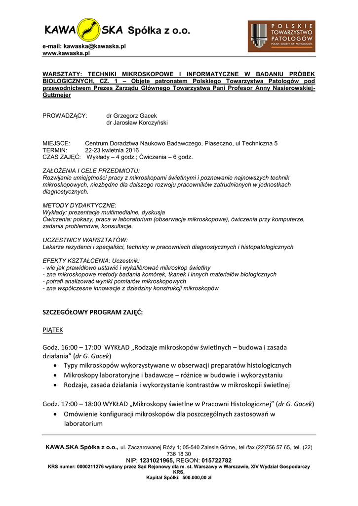 Spółka z o.o. e-mail: [email protected] www.kawaska.pl WARSZTATY: TECHNIKI MIKROSKOPOWE I INFORMATYCZNE W BADANIU PRÓBEK BIOLOGICZNYCH, CZ. 1 – Objęte patronatem Polskiego Towarzystwa Patologów pod przewodnictwem Prezes Zarządu Głównego Towarzystwa Pani Profesor Anny NasierowskiejGuttmejer PROWADZĄCY: dr Grzegorz Gacek dr Jarosław Korczyński MIEJSCE: Centrum Doradztwa Naukowo Badawczego, Piaseczno, ul Techniczna 5 TERMIN: 22-23 kwietnia 2016 CZAS ZAJĘĆ: Wykłady – 4 godz.; Ćwiczenia – 6 godz. ZAŁOŻENIA I CELE PRZEDMIOTU: Rozwijanie umiejętności pracy z mikroskopami świetlnymi i poznawanie najnowszych technik mikroskopowych, niezbędne dla dalszego rozwoju pracowników zatrudnionych w jednostkach diagnostycznych. METODY DYDAKTYCZNE: Wykłady: prezentacje multimedialne, dyskusja Ćwiczenia: pokazy, praca w laboratorium (obserwacje mikroskopowe), ćwiczenia przy komputerze, zadania problemowe, konsultacje. UCZESTNICY WARSZTATÓW: Lekarze rezydenci i specjaliści, technicy w pracowniach diagnostycznych i histopatologicznych EFEKTY KSZTAŁCENIA: Uczestnik: - wie jak prawidłowo ustawić i wykalibrować mikroskop świetlny - zna mikroskopowe metody badania komórek, tkanek i innych materiałów biologicznych - potrafi analizować wyniki pomiarów mikroskopowych - zna współczesne innowacje z dziedziny konstrukcji mikroskopów SZCZEGÓŁOWY PROGRAM ZAJĘĆ: PIĄTEK Godz. 16:00 – 17:00 WYKŁAD „Rodzaje mikroskopów świetlnych – budowa i zasada działania” (dr G. Gacek) Typy mikroskopów wykorzystywane w obserwacji preparatów histologicznych Mikroskopy laboratoryjne i badawcze – różnice w budowie i wykorzystaniu Rodzaje, zasada działania i wykorzystanie kontrastów w mikroskopii świetlnej Godz. 17:00 – 18:00 WYKŁAD „Mikroskopy świetlne w Pracowni Histologicznej” (dr G. Gacek) Omówienie konfiguracji mikroskopów dla poszczególnych zastosowań w laboratorium KAWA.SKA Spółka z o.o., ul. Zaczarowanej Róży 1; 05-540 Zalesie Górne, tel./fax (22)756 57 65, tel. (22) 736 18 30 NIP: 1231021965, REGON: 015722782 KRS numer: 0000211276 wydany przez Sąd Rejonowy dla m. st. Warszawy w Warszawie, XIV Wydział Gospodarczy KRS, Kapitał Spółki: 500.000,00 zł Spółka z o.o. e-mail: [email protected] www.kawaska.pl Parametry istotne podczas wyboru mikroskopu świetlnego Godz. 18:00 – 19:00 ĆWICZENIA „Obserwacje preparatów histologicznych w mikroskopii świetlnej” (dr G. Gacek; dr J. Korczyński) Prezentacja mikroskopów świetlnych w różnych konfiguracjach Obserwacje próbek biologicznych w poszczególnych kontrastach mikroskopowych Rola oświetlenia Kohlera w prawidłowym ustawieniu mikroskopu SOBOTA Godz. 9:00 – 10:00 WYKŁAD „Mikroskopia fluorescencyjna – działanie i zastosowanie” (dr J. Korczyński) Zjawisko fluorescencji – fizyczne podstawy Dostępne znaczniki fluorescencyjne Budowa i zasada działania mikroskopu fluorescencyjnego Zaawansowane aplikacje biologiczne w mikroskopii fluorescencyjnej Mikroskopia konfokalna – działanie i zastosowanie Godz. 10:00 – 12:00 ĆWICZENIA „Mikroskopia fluorescencyjna – działanie i zastosowanie” (dr G. Gacek; dr J. Korczyński) Obsługa mikroskopu fluorescencyjnego i obserwacje preparatów Wykonywanie zdjęć, zaawansowane programy do obsługi mikroskopów fluorescencyjnych Analiza i obróbka zdjęć – pomiary wykonywane na preparatach znakowanych fluorescencyjnie Wykonywanie serii XYZ, zapoznanie z oprogramowaniem do dekonwolucji Godz. 12:00 – 12:30 Dyskusje przy kawie (przerwa) Godz. 12:30 – 13:00 WYKŁAD „Mikroskopia stereoskopowa” (dr G. Gacek) Rodzaje mikroskopów stereoskopowych Budowa i działanie mikroskopów stereoskopowych Zastosowanie i dostępne aplikacje dla mikroskopii stereoskopowej Godz. 13:00 – 14:00 ĆWICZENIA „Mikroskopia stereoskopowa” (dr G. Gacek; dr J. Korczyński) Obsługa mikroskopu stereoskopowego Praca z różnymi typami mikroskopów (w tym mikroskopy z Fusion Optics). Obrazowanie w świetle padającym i przechodzącym Sekcjonowanie optyczne obrazów z wykorzystaniem cyfrowej obróbki obrazu Godz. 14:00 – 14:30 WYKŁAD „Podstawy cyfrowego obrazowania mikroskopowego” (dr J. Korczyński) Typy detektorów w mikroskopii – wady i zalety KAWA.SKA Spółka z o.o., ul. Zaczarowanej Róży 1; 05-540 Zalesie Górne, tel./fax (22)756 57 65, tel. (22) 736 18 30 NIP: 1231021965, REGON: 015722782 KRS numer: 0000211276 wydany przez Sąd Rejonowy dla m. st. Warszawy w Warszawie, XIV Wydział Gospodarczy KRS, Kapitał Spółki: 500.000,00 zł Spółka z o.o. e-mail: [email protected] www.kawaska.pl Działanie cyfrowych kamer mikroskopowych Zasady cyfrowego obrazowania próbek biologicznych w mikroskopie (intensywność światła, czas naświetlania, czułość kamery) Godz. 14:30 – 15:30 ĆWICZENIA „Podstawy cyfrowego obrazowania mikroskopowego” (dr G. Gacek; dr J. Korczyński) Obsługa oprogramowania do akwizycji obrazu Zajęcia praktyczne z wykonywania zdjęć spod mikroskopu Pomiary ilościowe i jakościowe wykonywane na zdjęciach mikroskopowych Obrazowanie przyżyciowe preparatów – filmy i serie czasowe poklatkowe Godz. 15:30 – 16:00 TEST WIEDZY – pisemne kolokwium zaliczeniowe. Podsumowanie kursu. WARSZTATY: NOWOCZESNE TECHNIKI W PREPARATYCE HISTOLOGICZNEJ, CZ. 2 – Objęte patronatem Polskiego Towarzystwa Patologów pod przewodnictwem Prezes Zarządu Głównego Towarzystwa Pani Profesor Anny Nasierowskiej-Guttmejer PROWADZĄCY: dr Grzegorz Gacek dr Jarosław Korczyński mgr Cezary Kozłowski MIEJSCE: Centrum Doradztwa Naukowo Badawczego, Piaseczno, ul Techniczna 5 TERMINY: 20-21 maja 2016 CZAS ZAJĘĆ: Wykłady – 4,5 godz.; Ćwiczenia – 5,5 godz. ZAŁOŻENIA I CELE PRZEDMIOTU: Zapoznanie się z najnowszymi technikami preparatyki histologicznej. Przekazanie niezbędnej wiedzy dotyczącej zastosowania metod znakowania immunohistochemicznego materiału. Przedstawienie podstawowych metod analizy danych z mikroskopu świetlnego.