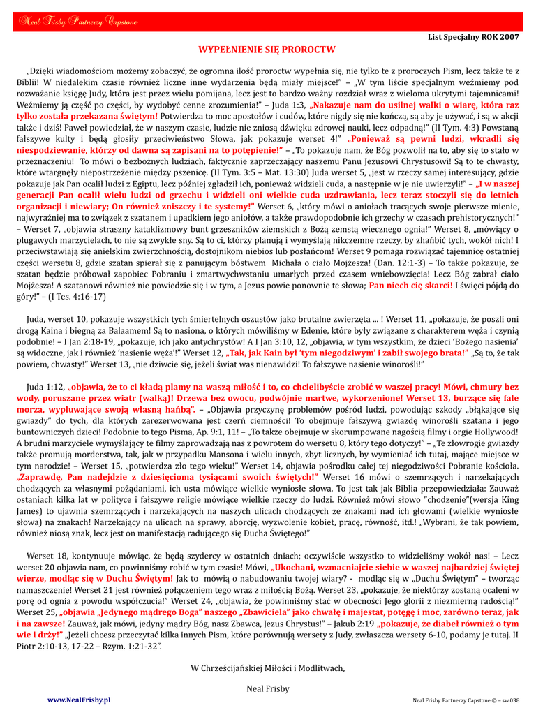 1. Neal Frisby Partnerzy Capstone List Specjalny ROK 2007 WYPEŁNIENIE SIĘ PROROCTW „Dzięki wiadomościom możemy zobaczyć, że ogromna ilość proroctw wypełnia się, nie tylko te z proroczych Pism, lecz także te z Biblii! W niedalekim czasie również liczne inne wydarzenia będą miały miejsce!” – „W tym liście specjalnym weźmiemy pod rozważanie księgę Judy, która jest przez wielu pomijana, lecz jest to bardzo ważny rozdział wraz z wieloma ukrytymi tajemnicami! Weźmiemy ją część po części, by wydobyć cenne zrozumienia!” – Juda 1:3, „Nakazuje nam do usilnej walki o wiarę, która raz tylko została przekazana świętym! Potwierdza to moc apostołów i cudów, które nigdy się nie kończą, są aby je używać, i są w akcji także i dziś! Paweł powiedział, że w naszym czasie, ludzie nie zniosą dźwięku zdrowej nauki, lecz odpadną!” (II Tym. 4:3) Powstaną fałszywe kulty i będą głosiły przeciwieństwo Słowa, jak pokazuje werset 4!” „Ponieważ są pewni ludzi, wkradli się niespodziewanie, którzy od dawna są zapisani na to potępienie!” – „To pokazuje nam, że Bóg pozwolił na to, aby się to stało w przeznaczeniu! To mówi o bezbożnych ludziach, faktycznie zaprzeczający naszemu Panu Jezusowi Chrystusowi! Są to te chwasty, które wtargnęły niepostrzeżenie między pszenicę. (II Tym. 3:5 – Mat. 13:30) Juda werset 5, „jest w rzeczy samej interesujący, gdzie pokazuje jak Pan ocalił ludzi z Egiptu, lecz później zgładził ich, ponieważ widzieli cuda, a następnie w je nie uwierzyli!” – „I w naszej generacji Pan ocalił wielu ludzi od grzechu i widzieli oni wielkie cuda uzdrawiania, lecz teraz stoczyli się do letnich organizacji i niewiary; On również zniszczy i te systemy!” Werset 6, „który mówi o aniołach tracących swoje pierwsze mienie, najwyraźniej ma to związek z szatanem i upadkiem jego aniołów, a także prawdopodobnie ich grzechy w czasach prehistorycznych!” – Werset 7, „objawia straszny kataklizmowy bunt grzeszników ziemskich z Bożą zemstą wiecznego ognia!” Werset 8, „mówiący o plugawych marzycielach, to nie są zwykłe sny. Są to ci, którzy planują i wymyślają nikczemne rzeczy, by zhańbić tych, wokół nich! I przeciwstawiają się anielskim zwierzchnością, dostojnikom niebios lub posłańcom! Werset 9 pomaga rozwiązać tajemnicę ostatniej części wersetu 8, gdzie szatan spierał się z panującym bóstwem Michała o ciało Mojżesza! (Dan. 12:1-3) – To także pokazuje, że szatan będzie próbował zapobiec Pobraniu i zmartwychwstaniu umarłych przed czasem wniebowzięcia! Lecz Bóg zabrał ciało Mojżesza! A szatanowi również nie powiedzie się i w tym, a Jezus powie ponownie te słowa; Pan niech cię skarci! I święci pójdą do góry!” – (I Tes. 4:16-17) Juda, werset 10, pokazuje wszystkich tych śmiertelnych oszustów jako brutalne zwierzęta ... ! Werset 11, „pokazuje, że poszli oni drogą Kaina i biegną za Balaamem! Są to nasiona, o których mówiliśmy w Edenie, które były związane z charakterem węża i czynią podobnie! – I Jan 2:18-19, „pokazuje, ich jako antychrystów! A I Jan 3:10, 12, „objawia, w tym wszystkim, że dzieci ‘Bożego nasienia’ są widoczne, jak i również ‘nasienie węża’!” Werset 12, „Tak, jak Kain był ‘tym niegodziwym’ i zabił swojego brata!” „Są to, że tak powiem, chwasty!” Werset 13, „nie dziwcie się, jeżeli świat was nienawidzi! To fałszywe nasienie winorośli!” Juda 1:12, „objawia, że to ci kładą plamy na waszą miłość i to, co chcielibyście zrobić w waszej pracy! Mówi, chmury bez wody, poruszane przez wiatr (walką)! Drzewa bez owocu, podwójnie martwe, wykorzenione! Werset 13, burzące się fale morza, wypluwające swoją własną hańbą”. – „Objawia przyczynę problemów pośród ludzi, powodując szkody „błąkające się gwiazdy” do tych, dla których zarezerwowana jest czerń ciemności! To obejmuje fałszywą gwiazdę winorośli szatana i jego buntowniczych dzieci! Podobnie to tego Pisma, Ap. 9:1, 11! – „To także obejmuje w skorumpowane nagością filmy i orgie Hollywood! A brudni marzyciele wymyślający te filmy zaprowadzają nas z powrotem do wersetu 8, który tego dotyczy!” – „Te złowrogie gwiazdy także promują morderstwa, tak, jak w przypadku Mansona i wielu innych, zbyt licznych, by wymieniać ich tutaj, mające miejsce w tym narodzie! – Werset 15, „potwierdza zło tego wieku!” Werset 14, objawia pośrodku całej tej niegodziwości Pobranie kościoła. „Zaprawdę, Pan nadejdzie z dziesięcioma tysiącami swoich świętych!” Werset 16 mówi o szemrzących i narzekających chodzących za własnymi pożądaniami, ich usta mówiące wielkie wyniosłe słowa. To jest tak jak Biblia przepowiedziała: Zauważ ostaniach kilka lat w polityce i fałszywe religie mówiące wielkie rzeczy do ludzi. Również mówi słowo ”chodzenie”(wersja King James) to ujawnia szemrzących i narzekających na naszych ulicach chodzących ze znakami nad ich głowami (wielkie wyniosłe słowa) na znakach! Narzekający na ulicach na sprawy, aborcję, wyzwolenie kobiet, pracę, równość, itd.! „Wybrani, że tak powiem, również niosą znak, lecz jest on manifestacją radującego się Ducha Świętego!” Werset 18, kontynuuje mówiąc, że będą szydercy w ostatnich dniach; oczywiście wszystko to widzieliśmy wokół nas! – Lecz werset 20 objawia nam, co powinniśmy robić w tym czasie! Mówi, „Ukochani, wzmacniajcie siebie w waszej najbardziej świętej wierze, modląc się w Duchu Świętym! Jak to mówią o nabudowaniu twojej wiary? - modląc się w „Duchu Świętym” – tworząc namaszczenie! Werset 21 jest również połączeniem tego wraz z miłością Bożą. Werset 23, „pokazuje, że niektórzy zostaną ocaleni w porę od ognia z powodu współczucia!” Werset 24, „objawia, że powinniśmy stać w obecnoś
