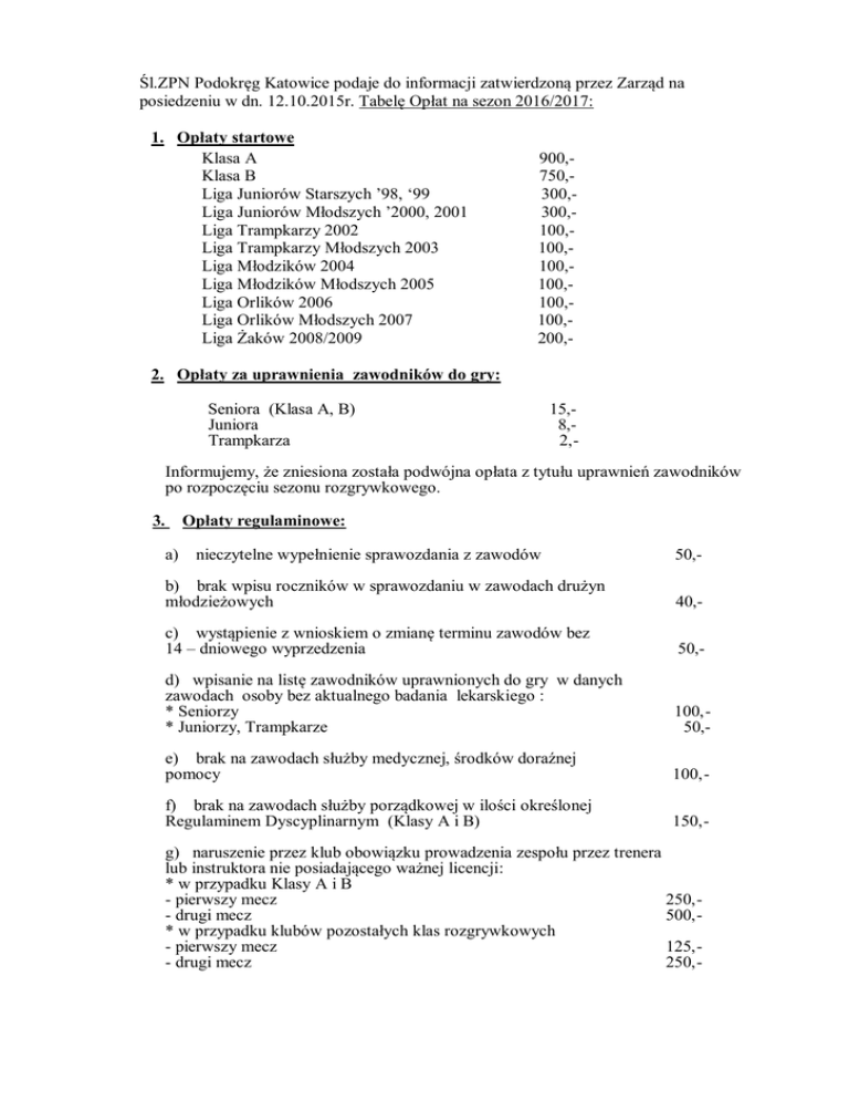Śl.ZPN Podokręg Katowice podaje do informacji zatwierdzoną przez Zarząd na posiedzeniu w dn. 12.10.2015r. Tabelę Opłat na sezon 2016/2017: 1. Opłaty startowe Klasa A Klasa B Liga Juniorów Starszych ’98, ‘99 Liga Juniorów Młodszych ’2000, 2001 Liga Trampkarzy 2002 Liga Trampkarzy Młodszych 2003 Liga Młodzików 2004 Liga Młodzików Młodszych 2005 Liga Orlików 2006 Liga Orlików Młodszych 2007 Liga Żaków 2008/2009 900,750,300,300,100,100,100,100,100,100,200,- 2. Opłaty za uprawnienia zawodników do gry: Seniora (Klasa A, B) Juniora Trampkarza 15,8,2,- Informujemy, że zniesiona została podwójna opłata z tytułu uprawnień zawodników po rozpoczęciu sezonu rozgrywkowego. Opłaty regulaminowe: 3. a) nieczytelne wypełnienie sprawozdania z zawodów 50,- b) brak wpisu roczników w sprawozdaniu w zawodach drużyn młodzieżowych 40,- c) wystąpienie z wnioskiem o zmianę terminu zawodów bez 14 – dniowego wyprzedzenia 50,- d) wpisanie na listę zawodników uprawnionych do gry w danych zawodach osoby bez aktualnego badania lekarskiego : * Seniorzy * Juniorzy, Trampkarze 100,50,- e) brak na zawodach służby medycznej, środków doraźnej pomocy 100,- f) brak na zawodach służby porządkowej w ilości określonej Regulaminem Dyscyplinarnym (Klasy A i B) 150,- g) naruszenie przez klub obowiązku prowadzenia zespołu przez trenera lub instruktora nie posiadającego ważnej licencji: * w przypadku Klasy A i B - pierwszy mecz 250,- drugi mecz 500,* w przypadku klubów pozostałych klas rozgrywkowych - pierwszy mecz 125,- drugi mecz 250,- 4. 5. Wystawienie do zawodów zawodnika nieuprawnionego do gry - Seniorzy - Juniorzy - Trampkarze 600,200,200,- Nieusprawiedliwione niestawienie się drużyny na zawody - Klasa A do - Klasa B do - Liga Juniorów do - Trampkarze do 700,350,200,100,- 6. - 7. 8. do do do do 1 100,900,700,200,- Wycofanie drużyny po zgłoszeniu do rozgrywek oraz w trakcie sezonu Klasa A do 700,Klasa B do 500,Liga Juniorów do 200,Trampkarze do 100,- - Kaucja za protest: Klasa A Klasa B Liga Juniorów Trampkarze - Kaucja za odwołanie się od decyzji I Instancji: Klasa A Klasa B Liga Juniorów Trampkarze dla osób fizycznych 9. 10. Samowolne zejście drużyny z boiska w czasie zawodów: Klasa A Klasa B Liga Juniorów Trampkarze Odbiór boiska 200,150,100,50,- 350,300,150,100,200,- 60,- 11. Żółte kartki Zawodnik, który w czasie zawodów mistrzowskich lub pucharowych otrzyma upomnienie (ż.k) zostanie automatycznie ukarany: Klasa A Klasa B a) po trzecim napomnieniu – kara finansowa 50,40,b) po szóstym napomnieniu - kara finansowa 80,60,c) po dziewiątym napomnieniu - kara finansowa 120,90,d) jeżeli wykonanie kary dyskwalifikacji orzeczonej w związku z udzielonymi ostrzeżeniami (ż.k.) nie nastąpiło w sezonie rozgrywkowym, w którym popełniono przewinienie, to zawodnik zobowiązany jest do wniesienia opłaty, w wysokości kolejnej opłaty za żółte kartki, lecz po dwunastym i każdym co czwartym napomnieniu w wysokości 12. Obsługa rachunków sędziowskich 120,- 90,- 2,-/szt.