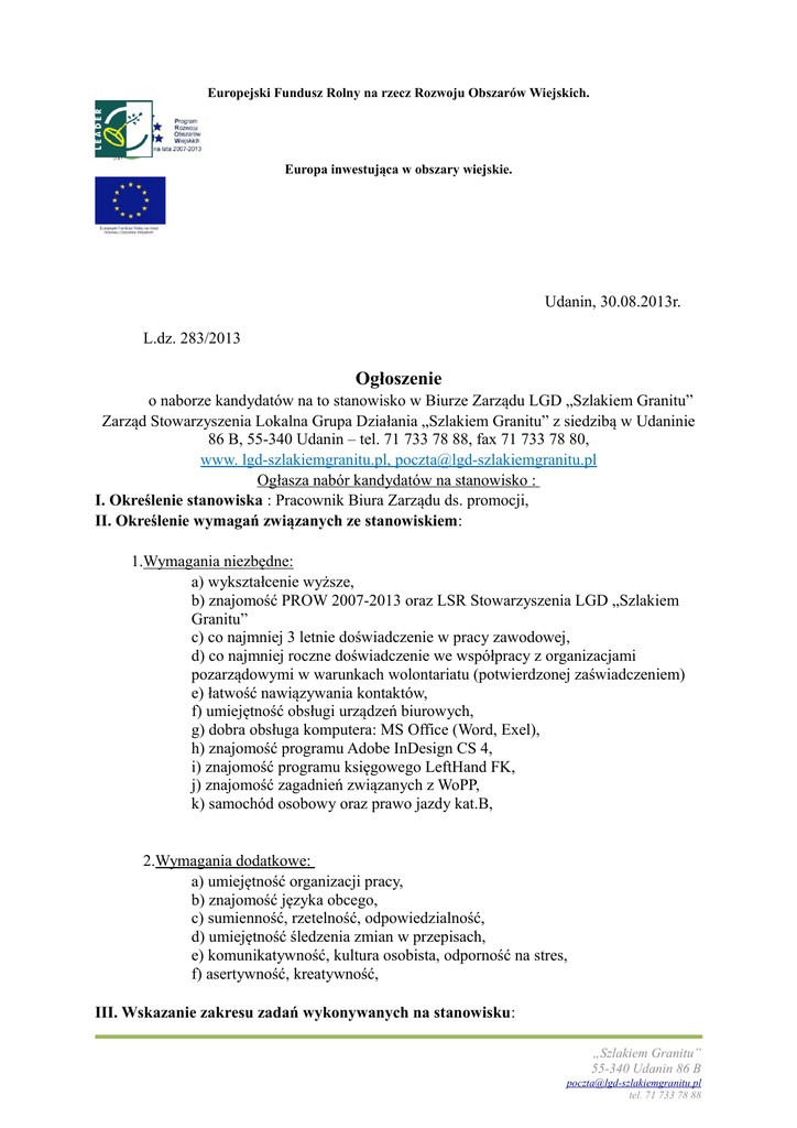 Europejski Fundusz Rolny na rzecz Rozwoju Obszarów Wiejskich. Europa inwestująca w obszary wiejskie. Udanin, 30.08.2013r. L.dz. 283/2013 Ogłoszenie o naborze kandydatów na to stanowisko w Biurze Zarządu LGD „Szlakiem Granitu” Zarząd Stowarzyszenia Lokalna Grupa Działania „Szlakiem Granitu” z siedzibą w Udaninie 86 B, 55-340 Udanin – tel. 71 733 78 88, fax 71 733 78 80, www. lgd-szlakiemgranitu.pl, [email protected] Ogłasza nabór kandydatów na stanowisko : I. Określenie stanowiska : Pracownik Biura Zarządu ds. promocji, II. Określenie wymagań związanych ze stanowiskiem: 1.Wymagania niezbędne: a) wykształcenie wyższe, b) znajomość PROW 2007-2013 oraz LSR Stowarzyszenia LGD „Szlakiem Granitu” c) co najmniej 3 letnie doświadczenie w pracy zawodowej, d) co najmniej roczne doświadczenie we współpracy z organizacjami pozarządowymi w warunkach wolontariatu (potwierdzonej zaświadczeniem) e) łatwość nawiązywania kontaktów, f) umiejętność obsługi urządzeń biurowych, g) dobra obsługa komputera: MS Office (Word, Exel), h) znajomość programu Adobe InDesign CS 4, i) znajomość programu księgowego LeftHand FK, j) znajomość zagadnień związanych z WoPP, k) samochód osobowy oraz prawo jazdy kat.B, 2.Wymagania dodatkowe: a) umiejętność organizacji pracy, b) znajomość języka obcego, c) sumienność, rzetelność, odpowiedzialność, d) umiejętność śledzenia zmian w przepisach, e) komunikatywność, kultura osobista, odporność na stres, f) asertywność, kreatywność, III. Wskazanie zakresu zadań wykonywanych na stanowisku: „Szlakiem Granitu” 55-340 Udanin 86 B [email protected] tel. 71 733 78 88 1. przygotowywanie działań informacyjnych, promocyjnych i kulturalnych związanych z obszarem i działalnością LGD oraz realizacją LSR, 2. zarządzanie treścią merytoryczną materiałów promocyjnych i informacyjnych LGD, 3. nadzór nad realizacją strategii promocyjnej projektów realizowanych przez Stowarzyszenie, 4. redagowanie strony internetowej Stowarzyszenia, 5. przygotowywanie i prezentowanie informacji na temat projektów, 6. prowadzenie działalności promocyjnej Stowarzyszenia, 7. przygotowywanie udziału LGD w targach, konferencjach, szkoleniach, imprezach społeczno - kulturalnych i innych wydarzeniach mających na celu promocję LGD, 8. obsługa fotograficzna spotkań, narad, konferencji, targów oraz innych imprez organizowanych przez LGD, 9. organizowanie spotkań, szkoleń i konferencji, 10. redagowanie notatek prasowych oraz przedkładanie ich do akceptacji Kierownika Biura, prowadzenie dokumentacji prasowej, 11. realizacja projektów Stowarzyszenia, w szczególności w zakresie organizacyjnopromocyjnym, 12. prowadzenie działań związanych ze współpracą międzyregionalną, 13. organizacja spotkań dla mieszkańców obszaru LGD „Szlakiem Granitu”, 14. przygotowywanie i realizacja przedsięwzięć określonych w LSR, w tym związanych z informowaniem i promocją działań wdrażanych przez LGD, 15. wykonywanie innych prac zleconych przez Kierownika Biura, wynikających z bieżących działań Biura, IV. Wskazanie wymaganych dokumentów: 1. list motywacyjny CV opatrzone klauzula "Wyrażam zgodę na przetwarzanie danych osobowych zawartych w ofercie pracy dla potrzeb niezbędnych do realizacji procesu rekrutacji zgodnie z ustawa z dnia 29 sierpnia 1997r o ochronie danych osobowych. (dz. U. Z 2002r. Nr 101, poz. 926 z pózn. zm)", 2. kserokopie dokumentów potwierdzających wykształcenie i staż pracy (oryginały do wglądu), 3. zaświadczenie lekarskie o braku przeciwskazań do pracy na stanowisku Pracownik Biura Zarządu ds. promocji, 4. kserokopie prawa jazdy oraz kserokopie dowodu rejestracyjnego samochodu osobowego (oryginały do wglądu), 5.zaświadczenie o współpracy z organizacjami pozarządowymi w warunkach wolontariatu, 6.oświadczenie o pełnej zdolności do czynności prawnych, 7.oświadczenie o korzystaniu z pełni praw publicznych i niekaralności za przestępstwa popełnione umyślnie. V. Zakres odpowiedzialności: 1. administracyjna, 2. za powierzone wyposażenie stanowiska pracy, 3. za powierzoną dokumentację. VI. Warunki zatrudnienia : „Szlakiem Granitu” 55-340 Udanin 86 B [email protected] tel. 71 733 78 88 Umowa o pracę na pełny etat od poniedziałku do piątku. Umowa na czas określony do 30 czerwca 2015 roku. VII. Procedura naboru: Oferty należy składać w zamkniętych kopertach z dopiskiem "Dotyczy Pracownik Biura Zarządu ds. promocji " w terminie od 02.09.2013 do 16.09.2013 r. do godz. 15.00 osobiście w biurze Stowarzyszenia Lokalna Grupa Działania „Szlakiem Granitu” Udanin 86 B, 55340 Udanin. Oferty, które wpłyną po upływie określonego terminu nie będą rozpatrywane. Procedura rekrutacyjna składa się z IV etapów: Etap I – zamieszczenie ogłoszenia o naborze na stanowisko na stronie internetowej LGD Szlakiem Granitu oraz gmin – członków LGD Szlakiem Granitu i na tablicy informacyjnej w siedzibie LGD Szlakiem Granitu. Etap II – przeprowadzenie weryfikacji formalnej dokumentów złożonych przez kandydatów na stanowisko. Etap III – zakwalifikowanie kandydatów do kolejnego etapu naboru – rozmowy kwalifikacyjnej. Etap IV – dokonanie naboru na stanowisko. Informacja o wyniku naboru będzie ogłoszona na tablicach ogłoszeniowych gmin Dobromierz, Jaworzyna Śląska, Kostomłoty, Strzegom, Świdnica, Udanin i Żarów oraz na stronie internetowej LGD - www.lgd-szlakiemgranitu.pl. Prezes Zarządu LGD „Szlakiem Granitu” 55-340 Udanin 86 B [email protected] tel. 71 733 78 88