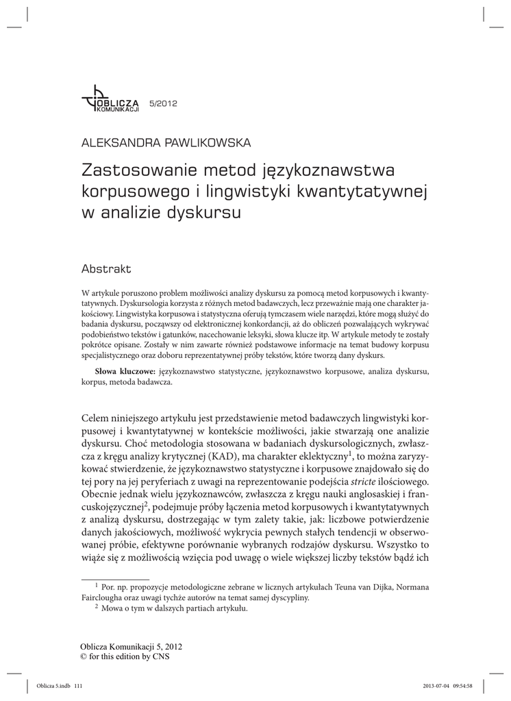 5/2012 ALEKSANDRA PAWLIKOWSKA Zastosowanie metod językoznawstwa korpusowego i lingwistyki kwantytatywnej w analizie dyskursu Abstrakt W artykule poruszono problem możliwości analizy dyskursu za pomocą metod korpusowych i kwantytatywnych. Dyskursologia korzysta z różnych metod badawczych, lecz przeważnie mają one charakter jakościowy. Lingwistyka korpusowa i statystyczna oferują tymczasem wiele narzędzi, które mogą służyć do badania dyskursu, począwszy od elektronicznej konkordancji, aż do obliczeń pozwalających wykrywać podobieństwo tekstów i gatunków, nacechowanie leksyki, słowa klucze itp. W artykule metody te zostały pokrótce opisane. Zostały w nim zawarte również podstawowe informacje na temat budowy korpusu specjalistycznego oraz doboru reprezentatywnej próby tekstów, które tworzą dany dyskurs. Słowa kluczowe: językoznawstwo statystyczne, językoznawstwo korpusowe, analiza dyskursu, korpus, metoda badawcza. Celem niniejszego artykułu jest przedstawienie metod badawczych lingwistyki korpusowej i kwantytatywnej w kontekście możliwości, jakie stwarzają one analizie dyskursu. Choć metodologia stosowana w badaniach dyskursologicznych, zwłaszcza z kręgu analizy krytycznej (KAD), ma charakter eklektyczny1, to można zaryzykować stwierdzenie, że językoznawstwo statystyczne i korpusowe znajdowało się do tej pory na jej peryferiach z uwagi na reprezentowanie podejścia stricte ilościowego. Obecnie jednak wielu językoznawców, zwłaszcza z kręgu nauki anglosaskiej i francuskojęzycznej2, podejmuje próby łączenia metod korpusowych i kwantytatywnych z analizą dyskursu, dostrzegając w tym zalety takie, jak: liczbowe potwierdzenie danych jakościowych, możliwość wykrycia pewnych stałych tendencji w obserwowanej próbie, efektywne porównanie wybranych rodzajów dyskursu. Wszystko to wiąże się z możliwością wzięcia pod uwagę o wiele większej liczby tekstów bądź ich 1 Por. np. propozycje metodologiczne zebrane w licznych artykułach Teuna van Dijka, Normana Fairclougha oraz uwagi tychże autorów na temat samej dyscypliny. 2 Mowa o tym w dalszych partiach artykułu. Oblicza Komunikacji 5, 2012 © for this edition by CNS Oblicza 5.indb 111 2013-07-04 09:54:58 112 ALEKSANDRA PAWLIKOWSKA fragmentów niż w przypadku analizy niewykorzystującej narzędzi inżynierii lingwistycznej. W dalszej części pracy przedstawię stosunek, w jakim pozostają do siebie: lingwistyka korpusowa, kwantytatywna oraz analiza dyskursu, opiszę narzędzia i metody badań ilościowych przydatne dla dyskursologii oraz omówię pokrótce (na wybranych przykładach) dotychczasowe badania łączące wymienione podejścia. 1. Lingwistyka korpusowa, językoznawstwo statystyczne, analiza dyskursu — paradygmaty, metodologie czy metody? Pytanie postawione w tytule powyższego punktu ma duże znaczenie z perspektywy metodologicznej. O ile bowiem można łączyć metody ilościowe z jakościowymi, tworząc globalną metodę eklektyczną, o tyle nie należy stosować metodologii pochodzących z odmiennych paradygmatów w imię spójności badań i prawomocności wyników. Jak zauważa tymczasem Adam Pawłowski (Pawłowski 2003), pojawiają się definicje językoznawstwa korpusowego ujmujące je niejawnie jako zjawisko na kształt paradygmatu w lingwistyce. Pojęcie analizy dyskursu oraz termin dyskursologia presuponują pewną dyscyplinę (naukę o dyskursie, por. też pojęcie discourse studies), natomiast lingwistyka kwantytatywna (statystyczna) charakteryzowana jest jako „językoznawstwo wykorzystujące do badań rachunek prawdopodobieństwa i statystykę matematyczną” (Sambor 1972: 13). Stwarza to wrażenie, jakoby mowa była kolejno o paradygmacie, dziale nauki oraz zbiorze metod. Ponadto, zdaniem niektórych badaczy amerykańskich (np. Virtanen 2009), analiza dyskursu i podejście korpusowe wykazują trudne do pogodzenia sprzeczności natury ontologicznej — pojawiają się one, gdy dyskurs rozumiany jest jako tekst mówiony, konwersacja będąca dynamicznym zdarzeniem komunikacyjnym, natomiast korpus zawiera teksty-wytwory (istnieje więc opozycja proces–produkt)3. Konieczne jest zatem ujednolicenie terminologii. Należy zacząć od analizy dyskursu jako centralnego zagadnienia niniejszego artykułu. Samo pojęcie dyskurs ma wiele definicji, jak choćby powyższa, na co zwracają uwagę badacze w licznych pracach4. Nie wdając się w szczegółowe rozważania 3 W takim ujęciu dyskurs ma pięć wymiarów (Virtanen 2009): wymiar strukturalny, retoryczny, kognitywny, interakcyjny, socjokulturowy. Zdaniem autorki nie wszystkie z tych pięciu wymiarów dadzą się jednakowo objąć przez metody korpusowe. Najbardziej podatny na analizę jest wymiar pierwszy i drugi. 4 Dla przykładu można przytoczyć uwagi Bożeny Witosz (Witosz 2009: 57), która po analizie zbioru polskich prac rekonstruuje następujące definicje dyskursu: • konkretną wypowiedź, • zjawisko na poziomie stylu indywidualnego (Zbigniewa Herberta dyskurs o sztuce), • zjawisko na poziomie gatunkowym (dyskurs powieściowy), Oblicza Komunikacji 5, 2012 © for this edition by CNS Oblicza 5.indb 112 2013-07-04 09:54:58 JĘZYKOZNAWSTWO KORPUSOWE I LINGWISTYKA KWANTYTATYWNA W ANALIZIE DYSKURSU 113 na ten temat, można uznać, iż dyskurs jest formą działania społecznego polegającą na wytwarzaniu i nadawaniu znaczeń — por. Fairclough 2003; Krzyżanowski, Wodak 2011 (dyskurs nie jest tu zatem tożsamy z tekstem-wytworem ani tekstem-wypowiedzią/procesem, lecz traktowany jest szerzej, natomiast konkretne teksty stanowią jego przejaw. W ten sposób zdefiniowany, stanowi on przedmiot badań, a analiza dyskursu jest dyscypliną naukową o charakterze interdyscyplinarnym (Krzyżanowski, Wodak 2011: 13)5. Jeśli chodzi o lingwistykę korpusową i kwantytatywną, Pawłowski umieszcza je w obszarze metod badawczych, a nie paradygmatów czy działów językoznawstwa (Pawłowski 2003: 21