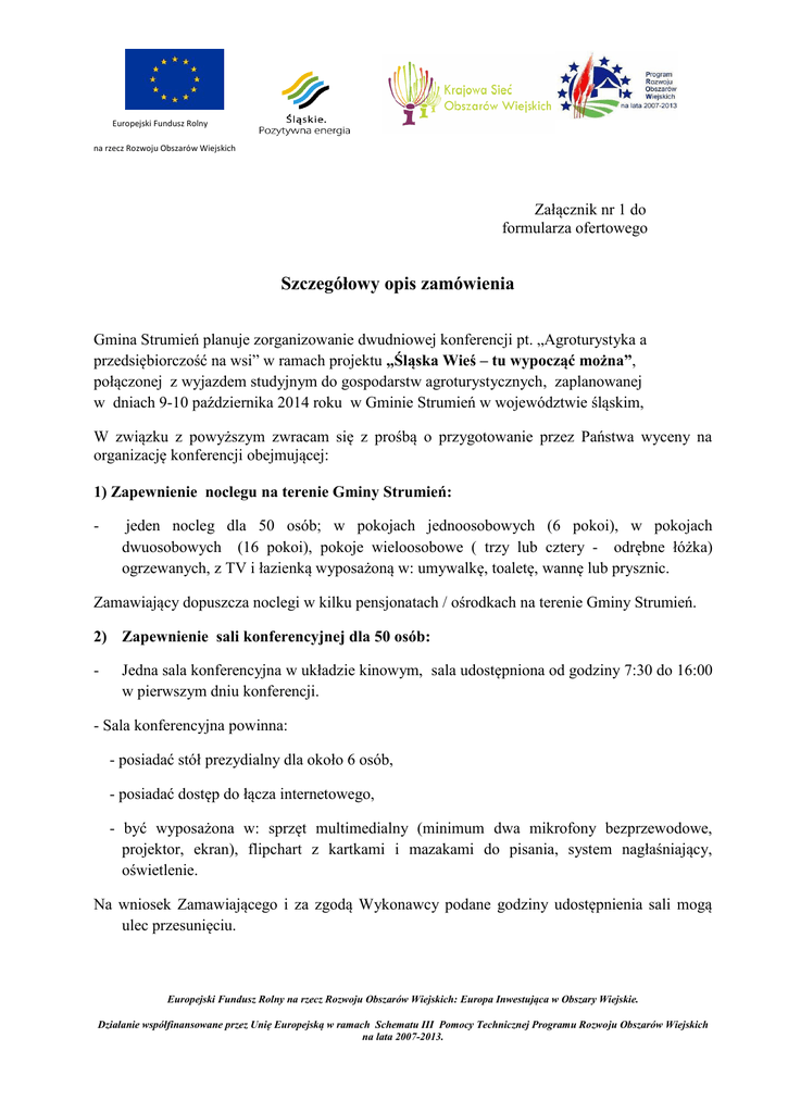 Europejski Fundusz Rolny na rzecz Rozwoju Obszarów Wiejskich Załącznik nr 1 do formularza ofertowego Szczegółowy opis zamówienia Gmina Strumień planuje zorganizowanie dwudniowej konferencji pt. „Agroturystyka a przedsiębiorczość na wsi” w ramach projektu „Śląska Wieś – tu wypocząć można”, połączonej z wyjazdem studyjnym do gospodarstw agroturystycznych, zaplanowanej w dniach 9-10 października 2014 roku w Gminie Strumień w województwie śląskim, W związku z powyższym zwracam się z prośbą o przygotowanie przez Państwa wyceny na organizację konferencji obejmującej: 1) Zapewnienie noclegu na terenie Gminy Strumień: - jeden nocleg dla 50 osób; w pokojach jednoosobowych (6 pokoi), w pokojach dwuosobowych (16 pokoi), pokoje wieloosobowe ( trzy lub cztery - odrębne łóżka) ogrzewanych, z TV i łazienką wyposażoną w: umywalkę, toaletę, wannę lub prysznic. Zamawiający dopuszcza noclegi w kilku pensjonatach / ośrodkach na terenie Gminy Strumień. 2) Zapewnienie sali konferencyjnej dla 50 osób: - Jedna sala konferencyjna w układzie kinowym, sala udostępniona od godziny 7:30 do 16:00 w pierwszym dniu konferencji. - Sala konferencyjna powinna: - posiadać stół prezydialny dla około 6 osób, - posiadać dostęp do łącza internetowego, - być wyposażona w: sprzęt multimedialny (minimum dwa mikrofony bezprzewodowe, projektor, ekran), flipchart z kartkami i mazakami do pisania, system nagłaśniający, oświetlenie. Na wniosek Zamawiającego i za zgodą Wykonawcy podane godziny udostępnienia sali mogą ulec przesunięciu. Europejski Fundusz Rolny na rzecz Rozwoju Obszarów Wiejskich: Europa Inwestująca w Obszary Wiejskie. Działanie współfinansowane przez Unię Europejską w ramach Schematu III Pomocy Technicznej Programu Rozwoju Obszarów Wiejskich na lata 2007-2013. Europejski Fundusz Rolny na rzecz Rozwoju Obszarów Wiejskich Sala nie musi znajdować się w obrębie ośrodka, w którym zakwaterowani będą uczestnicy spotkania. 3) Zapewnienie usługi restauracyjnej: Pierwszy dzień pobytu: - dwie przerwy kawowe w miejscu konferencji (około 11:00 i 12:45) – składające się z co najmniej kawy, herbaty, wody mineralnej gazowanej/niegazowanej (500 ml na osobę), poczęstunku na słodko (kruche ciasteczka, 2 rodzaje ciasta - 100 g każdego na osobę), cukier podany w cukiernicach, catering dostarczony przy/lub w sali konferencyjnej. - obiad w sali OSP w Bąkowie – składający się z dwóch dań ( zupa, drugie danie, zestaw surówek) + deser, napoje zimne (woda mineralna gazowana, niegazowana 500 ml na osobę), 2 rodzaje soków, kawa+ mleczko, herbata, cytryna, cukier.  Kolacja uroczysta w sali OSP w Bąkowie - zorganizowana w formie bufetu szwedzkiego (gorąca kolacja jednodaniowa, zimny bufet, napoje zimne i gorące). Drugi dzień pobytu: - śniadanie - zorganizowane w formie bufetu szwedzkiego w miejscu noclegu. - przerwa kawowa podczas wizyty w gospodarstwie agroturystycznym „Na Połomiu” w Istebnej składająca się z co najmniej kawy, herbaty, wody mineralnej gazowanej/niegazowanej, poczęstunku na słodko (kruche ciasteczka, ciasto - 100g na osobę), cukier.  obiad podczas wizyty w ośrodku „ Karina” w Wiśle – składający się z dwóch dań ( zupa, drugie danie, zestaw surówek) + deser, napoje zimne (woda mineralna gazowana, niegazowana 500 ml na osobę), 2 rodzaje soków, kawa+ mleczko, herbata + cytryna, cukier, poczęstunek na słodko. Europejski Fundusz Rolny na rzecz Rozwoju Obszarów Wiejskich: Europa Inwestująca w Obszary Wiejskie. Działanie współfinansowane przez Unię Europejską w ramach Schematu III Pomocy Technicznej Programu Rozwoju Obszarów Wiejskich na lata 2007-2013. Europejski Fundusz Rolny na rzecz Rozwoju Obszarów Wiejskich 4 ) Zapewnienie transportu uczestników konferencji - dla 50 osób: Usługa transportowa powinna być wykonana 1 autokarem klasy LUX, wyposażony w sprawną klimatyzację, uchylne fotele o liczbie miejsc pasażerskich nie mniej niż 50 miejsc + kierowca . - pierwszy dzień - około 14:00 przejazd uczestników konferencji ze Strumienia do OSP w Bąkowie - około 15:150 przejazd uczestników konferencji ze Strumienia do gospodarstwa agroturystycznego „ Wodna Dolina” w Pruchnej (gmina Strumień) - około 16:30 – wyjazd uczestników konferencji z Pruchnej do Zagrody Rolnej – Skansen Ochaby w Ochabach Wielkich (gmina Skoczów) - około 18:00 - powrót do miejsc zakwaterowania uczestników konferencji - około 18:45 wyjazd uczestników konferencji na kolację do OSP Bąków - drugi dzień - około 9:00 wyjazd uczestników konferencji do gospodarstwa agroturystycznego „Na Połomiu” w Istebnej (podczas wizyty poczęstunek w gospodarstwie) - około 11:30 – przejazd do ośrodka „Karina” w Wiśle ( obiad dla 50 osób w ośrodku) - około 14:00 przejazd do Chlebowej Chaty w Górkach Małych - około 15:30 wyjazd do Strumienia. Uwaga!! Wykonawca zobowiązany będzie do uzgodnienia godzin poszczególnych spotkań. Godziny, które będą obowiązywać w w/w programie Wykonawca ustali z Zamawiającym. Dopuszcza się możliwość zmiany kolejności poszczególnych punktów i godzin programu. UWAGA!!!! Koszty związane z prelekcjami – wykładowcami pokrywa Zamawiający. Europejski Fundusz Rolny na rzecz Rozwoju Obszarów Wiejskich: Europa Inwestująca w Obszary Wiejskie. Działanie współfinansowane przez Unię Europejską w ramach Schematu III Pomocy Technicznej Programu Rozwoju Obszarów Wiejskich na lata 2007-2013.
