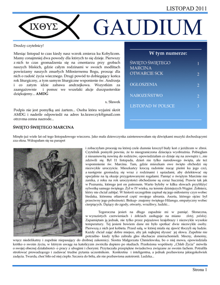 LISTOPAD 2011 GAUDIUM Drodzy czytelnicy! Miesiąc listopad to czas kiedy nasz wzrok zmierza ku Kobylicom. Mamy conajmniej dwa powody dla których to się dzieje. Pierwszy z nich to czas gromadzenia się na cmentarzu przy grobach naszych bliskich, gdzie całym rodzinami w swoich modlitach powieżamy naszych zmarłych Miłosiernemu Bogu, prosząc dla nich o radość życia wiecznego. Drugi powód to dobiegający końca rok liturgiczny, a tym samym liturgiczne wsponienie św. Andrzeja i co zatym idzie zabawa andrzejkowa. Wszystkim za zaangażownie i pomoc we wszelaki akcje duszpasterskie dziękujemy... AMDG x. Sławek Podpis nie jest pomyłką ani żartem... Osoba która wyjaśni skrót AMDG i nadeśle odpowiedź na adres [email protected] POWRÓT DOnagrodę... PRZESZŁOŚC otrzyma cenną . W tym numerze: ŚWIĘTO ŚWIĘTEGO MARCINA OTWARCIE SCK 1 OGŁOSZENIA 2 NABOZEŃSTWO 2 LISTOPAD W POLSCE 3 2 ŚWIĘTO ŚWIĘTEGO MARCINA Minęło już wiele lat od tego listopadowego wieczoru. Jako mała dziewczynka zainteresowałam się dźwiękami muzyki dochodzącymi zza okna. Wdrapałam się na parapet i zobaczyłam procesję na której czele dumnie kroczył biały koń z jeźdźcem w zbroi. Czytelnik pomyśli pewnie, że to nieograniczona dziecięca wyobraźnia. Pobiegłam z niesamowitą nowiną do rodziców, opowiedziałam co dzieje się na zewnątrz i...nie zdziwili się. Był 11 listopada, dzień nie tylko narodowego święta, ale też wspomnienie św. Marcina. Tam, gdzie mieszkam owe święto obchodzi się niezwykle uroczyście. Mieszkańcy kroczą radośnie nucąc pieśni ku jego czci, a następnie gromadzą się wraz z rodzinami i sąsiadami, aby delektować się specjalnie na tą okazje przygotowanymi rogalami. Pamięć o świętym Marcinie nie zanika, z roku na rok uroczystości obchodzone są coraz huczniej. Prawie tak jak w Poznaniu, którego jest on patronem. Warto byłoby w kilku słowach przybliżyć sylwetkę samego świętego. Żył w IV wieku, na terenie dzisiejszych Węgier. Żołnierz, który nie chciał zabijać. W historii szczególnie zapisał się jego miłosierny czyn wobec biedaka, któremu ofiarował część swojego ubrania. Asceta, którego ojciec był przeciwny jego pobożności. Biskup- znajomy świętego Hilarego, empatyczny wobec cierpiących. Dążący do zgody, otwarty, wrażliwy, ludzki... Tegoroczna jesień na długo zapadnie mi w pamięć. Słoneczna, w wyrazistych czerwieniach i żółciach zasługuje na miano złotej, polskiej. Zapamiętam ją jednak, nie tylko przez pejzażowe krajobrazy i niezwykle wysokie temperatury. Tej jesieni bowiem dane mi było spotkać dwie niezwykłe osoby. Pierwszą z nich jest kobieta. Przed salą, w której miała się zjawić tłoczyli się ludzie. Każdy chciał zająć dobre miejsce, aby jak najlepiej słyszeć jej słowa. Zupełnie nie potrzebie- kiedy tylko zabrała głos słuchacze znieruchomieli. Mocny, donośny, wręcz niedelikatny i zupełnie niepasujący do drobnej zakonnicy. Siostra Małgorzata Chmielewska, bo o niej mowa, opowiedziała krótko o swoim życiu, w którym uwagę na katolicyzm zwróciła dopiero po studiach. Przełożona wspólnoty „Chleb Życia” mówiła o swojej obecnej działalności- o pracy z ubogimi i chorymi. Przytaczała przepiękne świadectwa związane ze swoim fachem. Potrafiła strofować prowadzącego i zadawać trudne pytania uczestnikom. Konkretna i inteligentna, a jednak pozbawiona jakiegokolwiek zadęcia. Twarda, choć biło od niej ciepło. Szczera do bólu, ale nie pozbawiona autoironii. Ludzka... Strona 1 LISTOPAD 2011 Kolejną osobą był człowiek noszący na swojej piersi ogromny krzyż. Ojciec redemptorysta. Nawet nie poznałam jego imienia. Niezwykle zaangażowany w swoją misyjną działalność. Żywo gestykulujący i bardzo emocjonalny. Każdemu chciałby ukazać prawdę Ewangelii czasem stosując niecodzienne metody. Urodzony optymista, człowiek z którego twarzy nie znikał uśmiech, a jednak obciążony fizycznym cierpieniem . Ludzki... Przedstawiłam te dwie osobiste historie, bo w ludziach tych dostrzec można Boga-tak jak w świętym Marcinie. On też mimo, że było to szesnaście wieków temu stawał na drodze zwykłych ludzi. Nie przeoczmy współczesnych świętych- normalnych, ludzkich... Magda Maj P.S. Redakcja pragnie złożyć serdeczne życzenia każdemu Marcinowi-szczególnie Księdzu noszącemu imię miłosiernego świętego:) OTWARCIE SCK Kultura w życiu każdego człowieka jest ważnym czynnikiem kształtującym jego osobowość. Dlatego też w Opolu powstało Centrum Kultury Studenta, by każdy, szczególnie w tym wypadku człowiek młody, miał okazję poszerzyć swoje horyzonty. Wielkie otwarcie tego miejsca miało odbyło się 20 października 2011 roku. Zorganizowany został wtedy koncert. Rozpoczął go zespół Qsz będący kontynuacja twórczości Sławka Kusza, który od lat 90-tych był obecny na scenach piosenki literackiej. Jego twórczość była wielokrotnie nagradzana na festiwalach piosenki studenckiej, autorskiej, literackiej i poezji śpiewanej. Zaraz po nim wystąpił znany widzom zespół Love Story pochodzący z Raciborza i śpiewający o pięknej i czystej miłości. Promował swoją niedawną płytę Talitha kum a na występie pojawiło się wielu jego fanów. Uwieńczeniem wydarzenia był pokaz Mietka Szcześniaka, na który czekali wszyscy. Pan Szcześniak oczywiście nie zawiódł swoich widzów, a koncert zakończył już na bisie piosenką W Tobie jest światło. Koncert zakończył się o godzinie 22.30 i każdy z optymistycznym nastrojem zadumy wrócił do domu. Ania Litwinowicz OGŁOSZENIA Zabawa andrzejkowa – 26.11.2011r. godz. 19.00 Dom Kultury w Kobylicach, wejściówki u x. Marcina i x. Sławka. Roraty rozpoczynają się od 28.11.2011r. (od poniedziałku do piątku o 18:00, w sobotę o 8:00), zapraszamy młodzież do uczestnictwa i robienia serduszek z dobrymi uczynkami. Wzór na ostatniej stronie. W adwencie nie ma Ms