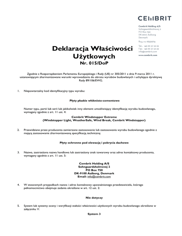 Deklaracja Właściwości Użytkowych Nr. 015/DoP Zgodnie z Rozporządzeniem Parlamentu Europejskiego i Rady (UE) nr 305/2011 z dnia 9 marca 2011 r. ustanawiającym zharmonizowane warunki wprowadzania do obrotu wyrobów budowlanych i uchylające dyrektywę Rady 89/106/EWG. 1. Niepowtarzalny kod identyfikacyjny typu wyrobu: Płyty płaskie włóknisto-cementowe Numer typu, partii lub serii lub jakikolwiek inny element umożliwiający identyfikację wyrobu budowlanego, wymagany zgodnie z art. 11 ust. 4: Cembrit Windstopper Extreme (Windstopper Light, WeatherSafe, Wind Break, Cembrit Windstopper) 2. Przewidziane przez producenta zamierzone zastosowanie lub zastosowania wyrobu budowlanego zgodnie z mającą zastosowanie zharmonizowaną specyfikacją techniczną: Płyty ochronne pod elewację i pokrycia dachowe 3. Nazwa, zastrzeżona nazwa handlowa lub zastrzeżony znak towarowy oraz adres kontaktowy producenta, wymagany zgodnie z art. 11 ust. 5: Cembrit Holding A/S Sohngaardsholmsvej 2 PO Box 750 DK-9100 Aalborg, Denmark Email: [email protected] 4. W stosownych przypadkach nazwa i adres kontaktowy upoważnionego przedstawiciela, którego pełnomocnictwo obejmuje zadania określone w art. 12 ust. 2: Nie dotyczy 5. System lub systemy oceny i weryfikacji stałości właściwości użytkowych wyrobu budowlanego określone w załączniku V: System 3 6a. W przypadku deklaracji właściwości użytkowych dotyczącej wyrobu budowlanego objętego normą zharmonizowaną: MPA Bau Hannover Notified body No. 0764 Nienburger Straße 3, D-30167 Hannover, Germany Wstępne badania typu oraz zgodności wykonano w ramach systemu 3 w oparciu o normę EN 12467:2013. Nr. raportu 154443, data 26 styczeń 2016. Badanie reakcji na ogień oraz klasyfikację wykonano w oparciu o EN 13501-1. Nr raportu 155797, data 13 styczeń 2016. 6b. W przypadku deklaracji właściwości użytkowych dotyczącej wyrobu budowlanego, dla którego wydana została europejska ocena techniczna: Nie dotyczy 7. Deklarowane właściwości użytkowe Zasadnicze charakterystyki Typ płyt Przeznaczone do kategorii użytkowania Klasa wytrzymałościowa Wytrzymałość mechaniczna Wytrzymałość na zginanie w warunkach otoczenia Gęstość pozorna Reakcja na ogień Przesiąkliwość Wymiary Odziaływanie substancji niebezpiecznych Odporność na działanie ciepłej wody Odporność na kąpiel-suszenie Odporność na zamrażanie-rozmrażanie Odporność na grzanie-deszczowanie 8. Właściwości użytkowe Zharmonizowana specyfikacja techniczna NT D 3 Min. 10 MPa Min. 1,30 g/m3 A2-s1, d0 Spełniają wymagania poziom 1 Właściwość użytkowa nieokreślona RL ≥ 0,75 RL ≥ 0,75 RL ≥ 0,75 Nie dotyczy EN 12467:2012+A1:2016 Płyty płaskie włóknistocementowe. Charakterystyka wyrobu i metody badań Stosowna dokumentacja techniczna i /lub specjalnej dokumentacja techniczna: EN 12467:2012+A1:2016 Płyty płaskie włóknisto-cementowe. Charakterystyka wyrobu i metody badań Właściwości użytkowe wyrobu określone w pkt 1 i 2 są zgodne z właściwościami użytkowymi deklarowanymi w pkt 7. Niniejsza deklaracja właściwości użytkowych wydana zostaje na wyłączną odpowiedzialność producenta określonego w pkt 3. W imieniu producenta podpisał Esben Moos, Group Technical Manager Aalborg, 31. Styczeń 2016 …………………………………………..