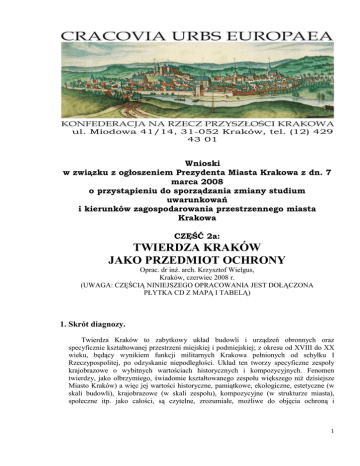 ul. Miodowa 41/14, 31-052 Kraków, tel. (12) 429 43 01 Wnioski w związku z ogłoszeniem Prezydenta Miasta Krakowa z dn. 7 marca 2008 o przystąpieniu do sporządzania zmiany studium uwarunkowań i kierunków zagospodarowania przestrzennego miasta Krakowa CZĘŚĆ 2a: TWIERDZA KRAKÓW JAKO PRZEDMIOT OCHRONY Oprac. dr inŜ. arch. Krzysztof Wielgus, Kraków, czerwiec 2008 r. (UWAGA: CZĘŚCIĄ NINIEJSZEGO OPRACOWANIA JEST DOŁĄCZONA PŁYTKA CD Z MAPĄ I TABELĄ) 1. Skrót diagnozy. Twierdza Kraków to zabytkowy układ budowli i urządzeń obronnych oraz specyficznie kształtowanej przestrzeni miejskiej i podmiejskiej; z okresu od XVIII do XX wieku, będący wynikiem funkcji militarnych Krakowa pełnionych od schyłku I Rzeczypospolitej, po odzyskanie niepodległości. Układ ten tworzy specyficzne zespoły krajobrazowe o wybitnych wartościach historycznych i kompozycyjnych. Fenomen twierdzy, jako olbrzymiego, świadomie kształtowanego zespołu większego niŜ dzisiejsze Miasto Kraków) a więc jej wartości historyczne, pamiątkowe, ekologiczne, estetyczne (w skali budowli), krajobrazowe (w skali zespołu), kompozycyjne (w strukturze miasta), społeczne itp. jako całości, są czytelne, zrozumiałe, moŜliwe do objęcia ochroną i 1 procesem dobrej kontynuacji - tylko jako zabytkowy krajobraz warowny. Pojecie to jest kluczem do niniejszego opracowania.1 Przedmiotem ochrony jest kompleks XIX-XX-wiecznej twierdzy pierścieniowej, która miała istotne znaczenie strategiczne i była realizowana etapami w latach 1849-1916 na kanwie wcześniejszych załoŜeń obronnych. Do dziś zachowało się ponad 140 zabytkowych obiektów fortyfikacji głównie stałej oraz fragmentów fortyfikacji polowej, rozmieszczonych wokół miasta. W części znajdują się one równieŜ poza granicami administracyjnymi Gminy Kraków: np. w Zielonkach, Węgrzcach, Rząsce, w rejonie Wieliczki. To takŜe kilkadziesiąt niefortyfikacyjnych dzieł twierdzy: koszar, magazynów, składów, warsztatów artyleryjskich, strzelnic itp. Twierdza Kraków to wielki zabytek sztuki obronnej, pod względem wielkości czytelny w skali regionu, natomiast pod względem znaczenia – istotny dla horyzontu kulturowego epoki industrialnej – w skali świata. Ukazuje cechy reprezentatywne dla okresów swego powstawania. Stanowi kontynuację roli Krakowa, jako waŜnego węzła obronnego na przestrzeni wieków. WiąŜe się ściśle z historią rozwoju miasta i okolic; takŜe z istnieniem i funkcjonowaniem garnizonu krakowskiego: armii austriackiej – z duŜym udziałem Polaków; a następnie Wojska Polskiego. Jest dzięki temu materialnym dowodem udziału polskich i europejskich postaci historycznych: inŜynierów, techników i robotników w tworzeniu fortyfikacji. Istotną rolę w kształtowaniu architektury krakowskiej twierdzy odegrali m.in. znany krakowski arch. Feliks KsięŜarski oraz twórca wojsk technicznych odrodzonej Rzeczypospolitej, gen. Emil Gołogórski, a takŜe waŜna postać dla rozwoju XIX-wiecznej myśli techniczno-fortyfikacyjnej, Szwajcar gen. Daniel SalisSoglio. Twierdza Kraków wiąŜe się równieŜ z bezpośrednim udziałem miasta w działaniach wojennych w 1914, 1939 i 1945 r. Dokumentuje ponadto postęp inŜynierii budowlanej epoki. Stosowano tu i doskonalono konstrukcje budowlane ceglane, pierwsze na tak duŜą skalę w Europie konstrukcje betonowe oraz konstrukcje stalobetonowe i pancerne. Tym samym twierdza jest świadectwem tworzenia się rzeczywistości epoki techniczno-przemysłowej, elementem „korzeni współczesności”, rozumianych zarówno w skali lokalnej, jak i globalnej. W wymiarze urbanistycznym stanowi walor przestrzenny i ekologiczny, gdyŜ zorganizowany krajobraz warowny – z udziałem dróg, mostów i załoŜeń zieleni fortecznej – jest organicznie zrośnięty z koncentryczno-promienistym układem miejskim Krakowa. W wymiarze ekonomicznym, wartość twierdzy przekłada się na moŜliwość integracji zespołu (jako wciąŜ istniejącego systemu zieleni i przestrzeni otwartych) dla podniesienia standardów Ŝycia w mieście, atrakcyjności turystycznej (w aspekcie turystyki kulturowej) oraz na potencjał adaptacyjny poszczególnych obiektów. Dla zobrazowania powyŜszej 1 Pojęcie krajobraz warowny wprowadził do języka polskiego profesor Janusz Bogdanowski na przełomie lat 70. i 80. XX wieku. Odpowiada ono niemieckiemu: „Wehrlandschaft” i angielskiemu: „Strategic Landscape”. Oznacza całościową postać ukształtowania i pokrycia terenu, świadomie wybranego i przystosowanego do celów obronnych. Jest to rozszerzenie powszechnie stosowanego terminu „Architectura Militaris”, utoŜsamianego przede wszystkim z budowlami, uzbrojeniem i wyposaŜeniem obiektów bojowych. Krajobraz warowny uwzględnia ponadto wszelkie niebojowe budowle, słuŜące obronie: inŜynieryjne, logistyczne, koszarowe, drogowe, hydrotechniczne, kolejowe, zieleń (maskującą, przeszkodową, uŜytkową i ozdobną), a takŜe podziały gruntowe, w tym rezultaty systemu ograniczeń budowlanych, kształtujących strukturę urbanistyczną oraz powiązania ogniowe i sygnalizacyjne, przekładające się dziś na powiązania widokowe. Pierwszą publikacja w której uŜył tego terminu J. Bogdanowski to: Krajobraz warowny XIX/XX o w. Dzieje i rewaloryzacja, Kraków 1993; rozwija to w monumentalnej monografii Architektura obronna w krajobrazie Polski, Warszawa-Kraków, 1996 r. 2 tezy zestawiono powierzchnie działek zadrzewionych urządzeń obronnych Twierdzy Kraków (nie wliczając zieleni dział zaplecza). Są to: powierzchnie historyczne stan na rok 1919 (ha), bez części fortów pierścienia wewnętrznego, szańców i baterii, oraz powierzchnie współczesne, stan na rok 2004 - łączna, uwzględniające takŜe obiekty nieujęte w zestawieniu z roku 1919 (ha) Działki fortówDziałki masek międzypolowych Działki zadrzewień dróg fortecznych (szacunkowo) Łącznie 223 21 ok. 222 ok. 10 200 444 ok. 50 o