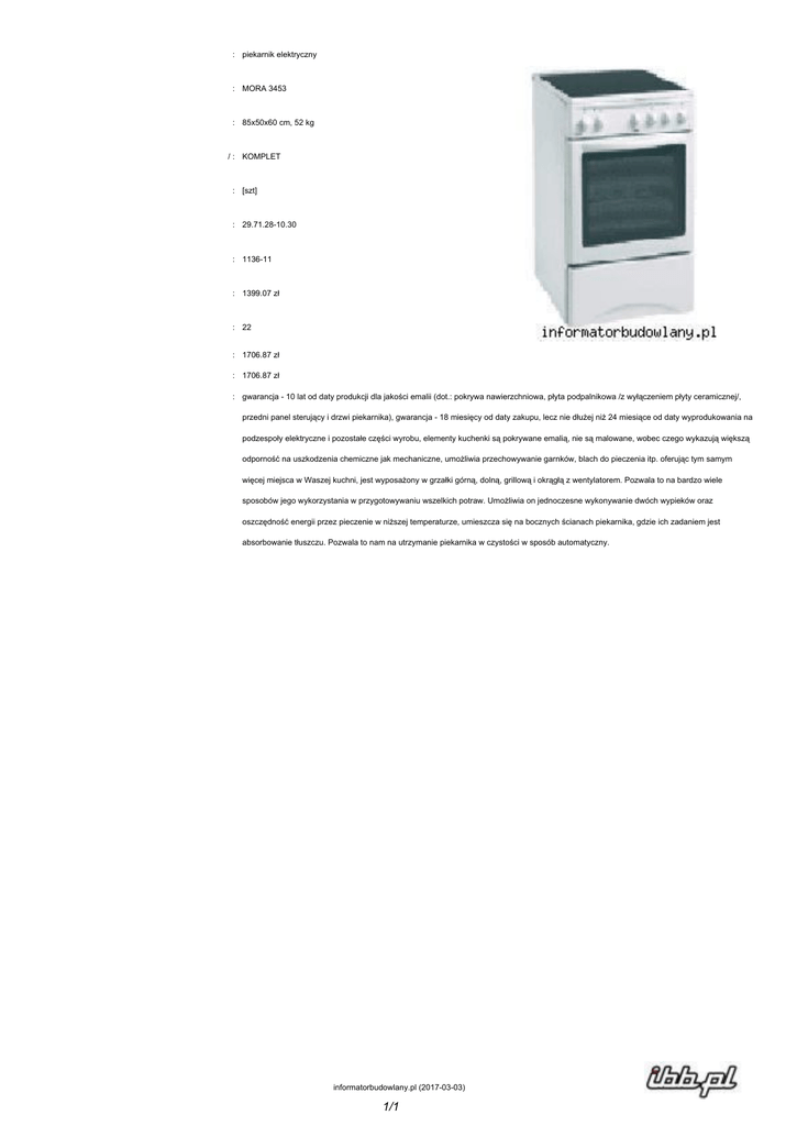 : piekarnik elektryczny : MORA 3453 : 85x50x60 cm, 52 kg / : KOMPLET : [szt] : 29.71.28-10.30 : 1136-11 : 1399.07 zł : 22 : 1706.87 zł : 1706.87 zł : gwarancja - 10 lat od daty produkcji dla jakości emalii (dot.: pokrywa nawierzchniowa, płyta podpalnikowa /z wyłączeniem płyty ceramicznej/, przedni panel sterujący i drzwi piekarnika), gwarancja - 18 miesięcy od daty zakupu, lecz nie dłużej niż 24 miesiące od daty wyprodukowania na podzespoły elektryczne i pozostałe części wyrobu, elementy kuchenki są pokrywane emalią, nie są malowane, wobec czego wykazują większą odporność na uszkodzenia chemiczne jak mechaniczne, umożliwia przechowywanie garnków, blach do pieczenia itp. oferując tym samym więcej miejsca w Waszej kuchni, jest wyposażony w grzałki górną, dolną, grillową i okrągłą z wentylatorem. Pozwala to na bardzo wiele sposobów jego wykorzystania w przygotowywaniu wszelkich potraw. Umożliwia on jednoczesne wykonywanie dwóch wypieków oraz oszczędność energii przez pieczenie w niższej temperaturze, umieszcza się na bocznych ścianach piekarnika, gdzie ich zadaniem jest absorbowanie tłuszczu. Pozwala to nam na utrzymanie piekarnika w czystości w sposób automatyczny. informatorbudowlany.pl (2017-03-03) 1/1