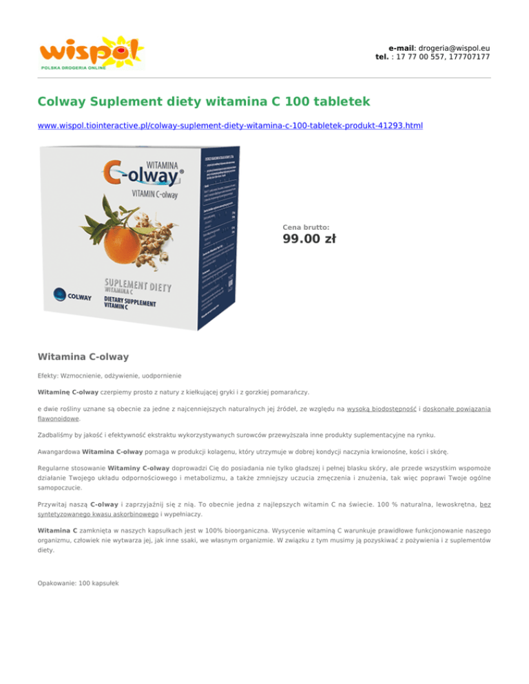 e-mail: [email protected] tel. : 17 77 00 557, 177707177 Colway Suplement diety witamina C 100 tabletek www.wispol.tiointeractive.pl/colway-suplement-diety-witamina-c-100-tabletek-produkt-41293.html Cena brutto: 99.00 zł Witamina C-olway Efekty: Wzmocnienie, odżywienie, uodpornienie Witaminę C-olway czerpiemy prosto z natury z kiełkującej gryki i z gorzkiej pomarańczy. e dwie rośliny uznane są obecnie za jedne z najcenniejszych naturalnych jej źródeł, ze względu na wysoką biodostępność i doskonałe powiązania flawonoidowe. Zadbaliśmy by jakość i efektywność ekstraktu wykorzystywanych surowców przewyższała inne produkty suplementacyjne na rynku. Awangardowa Witamina C-olway pomaga w produkcji kolagenu, który utrzymuje w dobrej kondycji naczynia krwionośne, kości i skórę. Regularne stosowanie Witaminy C-olway doprowadzi Cię do posiadania nie tylko gładszej i pełnej blasku skóry, ale przede wszystkim wspomoże działanie Twojego układu odpornościowego i metabolizmu, a także zmniejszy uczucia zmęczenia i znużenia, tak więc poprawi Twoje ogólne samopoczucie. Przywitaj naszą C-olway i zaprzyjaźnij się z nią. To obecnie jedna z najlepszych witamin C na świecie. 100 % naturalna, lewoskrętna, bez syntetyzowanego kwasu askorbinowego i wypełniaczy. Witamina C zamknięta w naszych kapsułkach jest w 100% bioorganiczna. Wysycenie witaminą C warunkuje prawidłowe funkcjonowanie naszego organizmu, człowiek nie wytwarza jej, jak inne ssaki, we własnym organizmie. W związku z tym musimy ją pozyskiwać z pożywienia i z suplementów diety. Opakowanie: 100 kapsułek *Ceny obowiązują wyłącznie przy składaniu zamówień przez sklep internetowy. Ceny w sklepach mogą nieznacznie różnić się od cen prezentowanych na stronach sklepu internetowego. Przedstawiona oferta w sklepie internetowym nie stanowi oferty w rozumieniu Kodeksu Cywilnego, i jest jedynie zaproszeniem do rozpoczęcia rokowań (zgodnie z art. 71 k.c.). Zastrzegamy sobie prawo do niezrealizowania zamówień z ważnych przyczyn ekonomicznych.