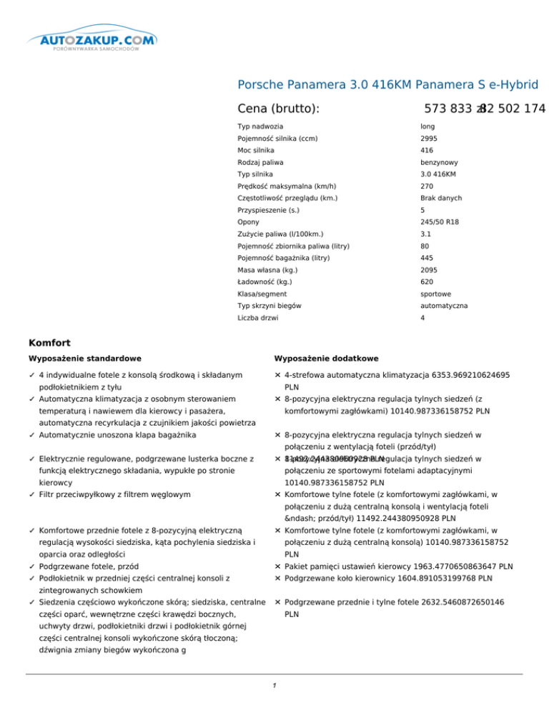 Porsche Panamera 3.0 416KM Panamera S e-Hybrid Cena (brutto): 573 833 .82 zł 502 174 Typ nadwozia long Pojemność silnika (ccm) 2995 Moc silnika 416 Rodzaj paliwa benzynowy Typ silnika 3.0 416KM Prędkość maksymalna (km/h) 270 Częstotliwość przeglądu (km.) Brak danych Przyspieszenie (s.) 5 Opony 245/50 R18 Zużycie paliwa (l/100km.) 3.1 Pojemność zbiornika paliwa (litry) 80 Pojemność bagażnika (litry) 445 Masa własna (kg.) 2095 Ładowność (kg.) 620 Klasa/segment sportowe Typ skrzyni biegów automatyczna Liczba drzwi 4 Komfort Wyposażenie standardowe Wyposażenie dodatkowe ✓ 4 indywidualne fotele z konsolą środkową i składanym ✕ 4-strefowa automatyczna klimatyzacja 6353.969210624695 podłokietnikiem z tyłu ✓ Automatyczna klimatyzacja z osobnym sterowaniem PLN ✕ 8-pozycyjna elektryczna regulacja tylnych siedzeń (z temperaturą i nawiewem dla kierowcy i pasażera, komfortowymi zagłówkami) 10140.987336158752 PLN automatyczna recyrkulacja z czujnikiem jakości powietrza ✓ Automatycznie unoszona klapa bagażnika ✕ 8-pozycyjna elektryczna regulacja tylnych siedzeń w ✓ Elektrycznie regulowane, podgrzewane lusterka boczne z ✕ 8-pozycyjna 11492.244380950928 elektryczna PLN regulacja tylnych siedzeń w połączeniu z wentylacją foteli (przód/tył) funkcją elektrycznego składania, wypukłe po stronie połączeniu ze sportowymi fotelami adaptacyjnymi kierowcy 10140.987336158752 PLN ✓ Filtr przeciwpyłkowy z filtrem węglowym ✕ Komfortowe tylne fotele (z komfortowymi zagłówkami, w połączeniu z dużą centralną konsolą i wentylacją foteli – przód/tył) 11492.244380950928 PLN ✓ Komfortowe przednie fotele z 8-pozycyjną elektryczną ✕ Komfortowe tylne fotele (z komfortowymi zagłówkami, w regulacją wysokości siedziska, kąta pochylenia siedziska i połączeniu z dużą centralną konsolą) 10140.987336158752 oparcia oraz odległości PLN ✓ Podgrzewane fotele, przód ✕ Pakiet pamięci ustawień kierowcy 1963.4770650863647 PLN ✓ Podłokietnik w przedniej części centralnej konsoli z ✕ Podgrzewane koło kierownicy 1604.891053199768 PLN zintegrowanych schowkiem ✓ Siedzenia częściowo wykończone skórą; siedziska, centralne ✕ Podgrzewane przednie i tylne fotele 2632.5460872650146 części oparć, wewnętrzne części krawędzi bocznych, PLN uchwyty drzwi, podłokietniki drzwi i podłokietnik górnej części centralnej konsoli wykończone skórą tłoczoną; dźwignia zmiany biegów wykończona g 1 ✓ Tempomat\n Bezpieczeństwo Wyposażenie standardowe Wyposażenie dodatkowe ✓ 3-punktowe automatyczne pasy bezpieczeństwa z ✕ Apteczka pierwszej pomocy i trójkąt ostrzegawczy napinaczami (przód/tył) i ograniczniki napięcia na przednich ✓ 4-tłoczkowe fotelach stałe aluminiowe zaciski monobloc z tyłu, 65.59500217437744 PLN ✕ Gaśnica 804.6320266723633 PLN wewnętrznie wentylowane i żłobione tarcze hamulcowe ✓ 6-tłoczkowe stałe aluminiowe zaciski monobloc z przodu, ✕ Mocowanie fotelika dziecięcego ISOFIX na przednim fotelu wewnętrznie wentylowane i żłobione tarcze hamulcowe ✓ Aktywna pokrywa silnika pasażera 966.4330320358276 PLN ✕ Wskazanie ograniczenia prędkości 1792.9300594329834 ✓ Dwukomorowe boczne poduszki powietrzne zintegrowane w PLN przednich fotelach\n ✓ Elektryczny hamulec postojowy\n ✓ Immobilizer silnika (z transponderem), elektryczna blokada kolumny kierowniczej, dwustopniowe zamykanie, system alarmowy z ultradźwiękowym monitoringiem wnętrza\n ✓ Kurtyny powietrzne obejmujące ramę dachu i szyby boczne od słupka A do C (lewa i prawa)\n ✓ Poduszki powietrznego chroniące kolana kierowcy i pasażera przedniego fotela\n ✓ Światła cofania\n ✓ System przeciwdziałający blokowaniu kół podczas hamowania (ABS zintegrowany w PSM)\n ✓ Zintegrowane zagłówki przednich i tylnych foteli\n Dodatki Wyposażenie standardowe Wyposażenie dodatkowe ✓ 12-woltowy akumulator rozruchowy o pojemności 75 Ah ✕ 14-pozycyjna elektryczna regulacja foteli z pakietem pamięci ✓ 4 drzwi z zintegrowanymi wzmocnieniami ✕ 18-calowe obręcze kół Panamera 0 PLN ✓ 4 gniazda 12 V: w przedniej i tylnej centralnej konsoli, w ✕ 19-calowe obręcze kół Panamera Design II ustawień 9694.941321372986 PLN schowku podręcznym i bagażniku 9633.719319343567 PLN ✓ 4 zawory na cylinder ✕ 19-calowe obręcze kół Panamera Turbo 7700.853255271912 ✓ 5 okrągłych zegarów ze srebrnymi obwódkami, czarnymi ✕ 19-calowe obręcze Panamera Turbo II 7700.853255271912 PLN tarczami i srebrną tarczą obrotomierza: w Panamerze GTS z PLN logo „GTS", w Panamerze S e-Hybrid z logo ✓ 6-cylindrowy „e-hybrid" silnik w układzie V, pojemność 3,0 l, moc ✕ 20-calowe obręcze kół 911 Turbo II 16691.74155330658 PLN maksymalna 245 kW (333 KM), maksymalny moment obrotowy 440 Nm, kompresor doładowującysilnik elektryczny o mocy maksymalnej 70 kW (95 KM), maksymalny moment obrotowy 310 Nm. Moc maksymalna ✓ 8-biegowa napędu hybry skrzynia Tiptronic S z przełącznikami sterowania ✕ 20-calowe obręcze kół Panamera Sport na kierownicy 16276.306539535522 PLN 2 ✓ 80-litrowy zbiornik paliwa z rezerwą ✕ 20-calowe obręcze kół Panamera Sport, malowane 22144.872734069824 PLN ✓ Adaptacyjne zawieszenie pneumatyczne z poziomowaniem i ✕ 20-calowe obręcze kół Panamera Sport, malowane w kolorze regulacją prześwitu (w Panamerze GTS 0 10 mm niżej na czarnym, błyszczącym 23426.161776542664 PLN poziomie normalnym) ✓ Adaptacyjny tylny spojler (2 pozycje) ✕ 20-calowe obręcze kół RS Spyder Design ✓ Akumulator litowo-jonowy (Li-ion) z kontrolą ładowania ✕ 5-milimetrowe przekładki dystansowe 1858.5250616073608 15406.079510688782 PLN PLN ✓ Aluminiowe głowice cylindrów ✕ 6-płytowa zmieniarka CD 2824.9580936431885 PLN ✓ Aluminiowe podwójne wahacze przedniej osi ✕ 6-płytowa zmieniarka CD/DVD 3533.384117126465 PLN ✓ Aluminiowe wielodrążkowe zawieszenie tylnej osi ✕ Ad