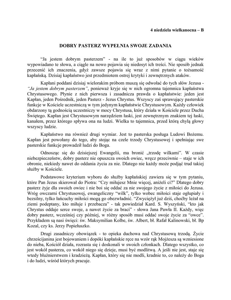 4 niedziela wielkanocna – B DOBRY PASTERZ WYPEŁNIA SWOJE ZADANIA “Ja jestem dobrym pasterzem” - na ile to już sposobów w ciągu wieków wypowiadano te słowa, a ciągle na nowo pojawia się niedosyt ich treści. Nie sposób jednak przecenić ich znaczenia, gdyż zawsze pojawia się wraz z nimi pytanie o tożsamość kapłańską. Dzisiaj kapłaństwo jest przedmiotem ostrej krytyki i zewnętrznych ataków. Kapłani poddani dzisiaj wielorakim próbom muszą się odwołać do tych słów Jezusa “Ja jestem dobrym pasterzem”, ponieważ kryje się w nich ogromna tajemnica kapłaństwa Chrystusowego. Płynie z nich pierwsza i zasadnicza prawda o kapłaństwie: jeden jest Kapłan, jeden Pośrednik, jeden Pasterz - Jezus Chrystus. Wszyscy zaś sprawujący pasterskie funkcje w Kościele uczestniczą w tym jedynym kapłaństwie Chrystusowym. Każdy człowiek obdarzony tą godnością uczestniczy w mocy Chrystusa, który działa w Kościele przez Ducha Świętego. Kapłan jest Chrystusowym narzędziem łaski, jest zewnętrznym znakiem tej łaski, kanałem, przez którego spływa ona na ludzi. Wielka to tajemnica, przed którą chylą głowy wszyscy ludzie. Kapłaństwo ma również drugi wymiar. Jest to pasterska posługa Ludowi Bożemu. Kapłan jest powołany do tego, aby stojąc na czele trzody Chrystusowej i spełniając swe pasterskie funkcje prowadził ludzi do Boga. Odnosząc się do dzisiejszej Ewangelii, ma bronić „trzodę wilkami”. W czasie niebezpieczeństw, dobry pasterz nie opuszcza swoich owiec, wręcz przeciwnie – staje w ich obronie, niekiedy nawet do oddania życia za nie. Dlatego nie każdy może podjąć trud takiej służby w Kościele. Podstawowe kryterium wyboru do służby kapłańskiej zawiera się w tym pytaniu, które Pan Jezus skierował do Piotra: “Czy miłujesz Mnie więcej, aniżeli ci?” Dlatego dobry pasterz żyje dla swoich owiec i nie boi się oddać za nie swojego życie z miłości do Jezusa. Wróg owczarni Chrystusowej, ewangeliczny “wilk”, tylko wobec miłości staje ogłupiały i bezsilny, tylko łańcuchy miłości mogą go obezwładnić. “Zwyciężył już dziś, choćby leżał na ziemi podeptany, kto miłuje i przebacza” - tak powiedział Kard. S. Wyszyński, “kto jak Chrystus oddaje serce swoje, a nawet życie za braci” - słowa Jana Pawła II. Każdy, więc dobry pasterz, wcześniej czy później, w różny sposób musi oddać swoje życie za “owce”. Przykładem są nasi święci: św. Maksymilian Kolbe, św. Albert, bł. Rafał Kalinowski, bł. Bp Kozal, czy ks. Jerzy Popiełuszko. Drugi zasadniczy obowiązek - to opieka duchowa nad Chrystusową trzodą. Życie chrześcijanina jest bojowaniem i dopóki kapłańskie ręce na wzór rąk Mojżesza są wzniesione do nieba, Kościół działa, rozrasta się i doskonali w swoich członkach. Dlatego wszystko, co jest wokół pasterza, co wokół niego się dzieje, musi być modlitwą. A jeśli nie jest, staje się wtedy bluźnierstwem i kradzieżą. Kapłan, który się nie modli, kradnie to, co należy do Boga i do ludzi, wśród których pracuje. I wreszcie trzeci obowiązek kapłana - to solidarność z trzodą Chrystusową, która objawia się, jako odpowiedzialność za wspólne dobro wszystkich wierzących. Pasterz musi być najpierw solidarny z tymi, którzy cierpią. Nie może jednak zapomnieć o tych, którzy cierpienia zadają, według słów Chrystusa: “Mam także inne owce, które nie są z tej owczarni. I te muszę przyprowadzić i będą słuchać głosu mego, i nastanie jedna owczarnia i jeden pasterz”. Kapłaństwo we wszystkich swoich wymiarach to jednak przede wszystkim SŁUŻBA. Prawdziwa zaś radość z kapłańskiej posługi polega na bezmiarze miłości w sercu Jedynego Kapłana – Jezusa Chrystusa, która nakazuje mu czynić z siebie ofiarę. Dlatego każdy kapłan powinien być otwartą raną na Sercu Zbawiciela, aby z tego Serca mogły spływać ożywcze zdroje miłości i miłosierdzia; aby krew i woda przyniosły ludziom zbawienie przez obmycie ich dusz z grzechów. SiL-1997