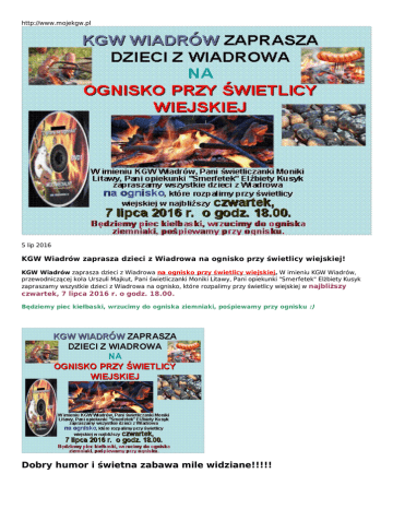 http://www.mojekgw.pl 5 lip 2016 KGW Wiadrów zaprasza dzieci z Wiadrowa na ognisko przy świetlicy wiejskiej! KGW Wiadrów zaprasza dzieci z Wiadrowa na ognisko przy świetlicy wiejskiej. W imieniu KGW Wiadrów, przewodniczącej koła Urszuli Majkut, Pani świetliczanki Moniki Litawy, Pani opiekunki "Smerfetek" Elżbiety Kusyk zapraszamy wszystkie dzieci z Wiadrowa na ognisko, które rozpalimy przy świetlicy wiejskiej w najbliższy czwartek, 7 lipca 2016 r. o godz. 18.00. Będziemy piec kiełbaski, wrzucimy do ogniska ziemniaki, pośpiewamy przy ognisku :) Dobry humor i świetna zabawa mile widziane!!!!! ZAPRASZAMY! Dariusz T. z KGW Wiadrów - Koło Gospodyń Wiejskich w Wiadrowie