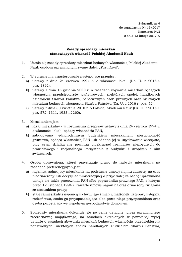 Załącznik nr 4 do zarządzenia Nr 15/2017 Kanclerza PAN z dnia 13 lutego 2017 r. Zasady sprzedaży mieszkań stanowiących własność Polskiej Akademii Nauk 1. Ustala się zasady sprzedaży mieszkań będących własnością Polskiej Akademii Nauk osobom uprawnionym zwane dalej: „Zasadami”. 2. W sprawie mają zastosowanie następujące przepisy: a) ustawy z dnia 24 czerwca 1994 r. o własności lokali (Dz. U. z 2015 r. poz. 1892), b) ustawy z dnia 15 grudnia 2000 r. o zasadach zbywania mieszkań będących własnością przedsiębiorstw państwowych, niektórych spółek handlowych z udziałem Skarbu Państwa, państwowych osób prawnych oraz niektórych mieszkań będących własnością Skarbu Państwa (Dz. U. z 2016 r. poz. 52), c) ustawy z dnia 30 kwietnia 2010 r. o Polskiej Akademii Nauk (Dz. U. z 2016 r. poz. 572, 1311, 1933 i 2260). 3. Mieszkaniem jest: a) lokal mieszkalny - w rozumieniu przepisów ustawy z dnia 24 czerwca 1994 r. o własności lokali, będący własnością PAN, b) zabudowana jednorodzinnym budynkiem mieszkalnym nieruchomość gruntowa, będącą własnością PAN lub oddana jej w użytkowanie wieczyste, przy czym działka nie powinna przekraczać rozmiarów niezbędnych do prawidłowego i racjonalnego korzystania z budynku i urządzeń z nim związanych. 4. Osobą uprawnioną, której przysługuje prawo do nabycia mieszkania na zasadach preferencyjnych jest: a) najemca, zajmujący mieszkanie na podstawie umowy najmu zawartej na czas nieoznaczony lub decyzji administracyjnej o przydziale; za osobę uprawnioną uznaje się także pracownika PAN albo poprzednika prawnego PAN, z którym przed 12 listopada 1994 r. zawarto umowę najmu na czas oznaczony związaną ze stosunkiem pracy; b) stale zamieszkały z najemcą w chwili jego śmierci, małżonek, zstępny, wstępny, rodzeństwo, osoba go przysposabiająca albo przez niego przysposobiona oraz osoba pozostająca we wspólnym gospodarstwie domowym. 5. Sprzedaży mieszkania dokonuje się po cenie ustalonej przez uprawnionego rzeczoznawcę majątkowego, na zasadach określonych w powołanej wyżej ustawie o zasadach zbywania mieszkań będących własnością przedsiębiorstw państwowych, niektórych spółek handlowych z udziałem Skarbu Państwa, 1 państwowych osób prawnych oraz niektórych mieszkań będących własnością Skarbu Państwa , a) łącznie pomniejszonej o: - 6% za każdy rok pracy osoby uprawnionej, - 3% za każdy rok najmu tego mieszkania, przy czym łączna obniżka nie może przekraczać 95% ceny sprzedaży mieszkania, b) na wniosek osób, o których mowa w pkt. 4 b) niniejszych Zasad, uwzględnia się zamiast zaliczonego jej okresu najmu, okres pracy lub najmu najemcy, jeżeli jest on korzystniejszy, c) jeżeli osobą uprawnioną jest emeryt, rencista lub wdowa (wdowiec) po nim (po niej), cena nabycia mieszkania ustalana jest na 5% jego wartości. 6. Osoba, zajmująca mieszkanie bez tytułu prawnego nie jest uprawniona do jego nabycia. 7. Mieszkania, co do których brak jest osób uprawnionych zostaną sprzedane w trybie i na zasadach określonych w obowiązujących przepisach prawa oraz wewnętrznych procedurach Akademii. 8. Sprzedaż mieszkań w obiektach zabytkowych, wpisanych do rejestru zabytków lub też będących przedmiotem postępowania o wpisanie do rejestru zabytków, może nastąpić wtedy, gdy jest to zgodne z interesem PAN i nie wpływa negatywnie na utrzymanie zorganizowanego zespołu zabytkowego. 9. Przed podjęciem działań zmierzających do sprzedaży mieszkań w obiektach zabytkowych o planowanej sprzedaży należy powiadomić właściwego konserwatora zabytków. 10. Dyrektor jednostki PAN zarządzającej mieszkaniami przeznaczonymi do sprzedaży kompletuje dokumentację niezbędną do zawarcia umowy sprzedaży mieszkania oraz zgłasza do Kanclerza Polskiej Akademii Nauk konieczność zlecenia oszacowania jego wartości rynkowej. 11. Koszty sporządzenia operatu szacunkowego oraz pozyskania dokumentacji, o której mowa powyżej ponosi nabywca. Na ten cel nabywca wnosi zaliczkę w wysokości określonej przez dyrektora jednostki zarządzającej mieszkaniami, stosownie do faktycznych szacowanych kosztów, jednak nie wyższej niż 1.500 zł. 12. Dyrektor jednostki zarządzającej mieszkaniami sporządza wykaz mieszkań przeznaczonych do sprzedaży. Wykaz ten powinien zawierać następujące informacje: adres nieruchomości, numer księgi wieczystej, oznaczenie nieruchomości wg danych z ewidencji gruntów i budynków, powierzchnię lokalu, pomieszczeń przynależnych i działki, a) b) c) d) 2 e) f) wielkość udziałów w częściach wspólnych, wysokość przysługującej bonifikaty (w %). 13. Kanclerz Polskiej Akademii Nauk zatwierdza, na wniosek dyrektora jednostki, wykaz nieruchomości przeznaczonych do sprzedaży, o którym mowa w pkt. 12 powyżej. 14. Po zatwierdzeniu wykazu przez Kanclerza Polskiej Akademii Nauk dyrektor jednostki zarządzającej mieszkaniami zawiadamia na piśmie (za potwierdzeniem odbioru), osoby uprawnione lub najemców o przeznaczeniu mieszkań na sprzedaż, wyznaczając trzymiesięczny termin do złożenia pisemnego oświadczenia o zamiarze nabycia mieszkania na warunkach podanych w zawiadomieniu. Termin ten liczony jest od dnia doręczenia zawiadomienia osobie zainteresowanej wykupem. 15. W zawiadomieniu podaje się: a) wartość rynkową mieszkania przeznaczonego do sprzedaży określoną przez rzeczoznawcę majątkowego, b) wysokość przysługującej bonifikaty (w %), c) wartość mieszkania po zastosowaniu bonifikaty, d) wysokość zaliczki na sfinansowanie kosztów pozyskania dokumentacji i wyceny, e) kwotę do zapłaty. 16. W razie niezłożenia oświadczenia w terminie, o którym mowa w pkt. 14 stosuje się przepisy dotyczące przekazania mieszkań, określone w ustawie z dnia 12 października 1994 r. o zasadach przekazywania zakładowych budynków mieszkalnych przez przedsiębiorstwa (Dz. U. z 2014 r. poz. 1381). 17. Wykaz mieszka