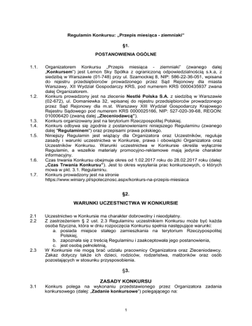 Regulamin Konkursu: „Przepis miesiąca - ziemniaki” §1. POSTANOWIENIA OGÓLNE 1.1. 1.2. 1.3. 1.4. 1.5. 1.6. 1.7. Organizatorem Konkursu „Przepis miesiąca - ziemniaki” (zwanego dalej „Konkursem”) jest Lemon Sky Spółka z ograniczoną odpowiedzialnością s.k.a, z siedzibą w Warszawie (01-748) przy ul. Szamockiej 8, NIP: 586-22-36-051, wpisana do rejestru przedsiębiorców prowadzonego przez Sąd Rejonowy dla miasta Warszawy, XII Wydział Gospodarczy KRS, pod numerem KRS 0000435937 zwana dalej Organizatorem. Konkurs prowadzony jest na zlecenie Nestlé Polska S.A. z siedzibą w Warszawie (02-672), ul. Domaniewka 32, wpisanej do rejestru przedsiębiorców prowadzonego przez Sąd Rejonowy dla m.st. Warszawy XIII Wydział Gospodarczy Krajowego Rejestru Sądowego pod numerem KRS 0000025166, NIP: 527-020-39-68, REGON: 010006420 (zwaną dalej „Zleceniodawcą”). Konkurs organizowany jest na terytorium Rzeczpospolitej Polskiej. Konkurs odbywa się zgodnie z postanowieniami niniejszego Regulaminu (zwanego dalej "Regulaminem") oraz przepisami prawa polskiego. Niniejszy Regulamin jest wiążący dla Organizatora oraz Uczestników, reguluje zasady i warunki uczestnictwa w Konkursie, prawa i obowiązki Organizatora oraz Uczestników Konkursu. Warunki uczestnictwa w Konkursie określa wyłącznie Regulamin, a wszelkie materiały promocyjno-reklamowe mają jedynie charakter informacyjny. Czas trwania Konkursu obejmuje okres od 1.02.2017 roku do 28.02.2017 roku (dalej: „Czas Trwania Konkursu”). Jest to okres wysyłania prac konkursowych, o których mowa w pkt. 3.1. Regulaminu. Konkurs prowadzony jest na stronie https://www.winiary.pl/spolecznosc.aspx/konkurs-na-przepis-miesiaca §2. WARUNKI UCZESTNICTWA W KONKURSIE 2.1 2.2 2.3 Uczestnictwo w Konkursie ma charakter dobrowolny i nieodpłatny. Z zastrzeżeniem § 2 ust. 2.3 Regulaminu uczestnikiem Konkursu może być każda osoba fizyczna, która w dniu rozpoczęcia Konkursu spełnia następujące warunki: a. posiada miejsce stałego zamieszkania na terytorium Rzeczypospolitej Polskiej, b. zapoznała się z treścią Regulaminu i zaakceptowała jego postanowienia, c. jest osobą pełnoletnią, W Konkursie nie mogą brać udziału pracownicy Organizatora oraz Zleceniodawcy. Zakaz dotyczy także ich dzieci, rodziców, rodzeństwa, małżonków oraz osób pozostających w stosunku przysposobienia. §3. ZASADY KONKURSU 3.1 Konkurs polega na wykonaniu przedstawionego przez Organizatora zadania konkursowego (dalej: „Zadanie konkursowe”) polegającego na: 1 3.2 Przesłaniu propozycji przepisu z wykorzystaniem składnika sezonowego (ziemniaków) oraz dowolnego produktu marki WINIARY (dalej: „Praca konkursowa”). Uczestnik może przesłać Organizatorowi Prace konkursowe w Czasie Trwania Konkursu poprzez: a) podanie w formularzu konkursowym dostępnym na stronie https://www.winiary.pl/spolecznosc.aspx/konkurs-na-przepis-miesiaca dalej: „Formularz konkursowy”) linka do swojego przepisu zamieszczonego uprzednio na serwisie winiary.pl lub linka do swojego przepisu zamieszczonego na prowadzonym przez siebie blogu (przy jednoczesnym zamieszczeniem na blogu informacji o treści: Przepis bierze udział w Konkursie na przepis miesiąca na Winiary.pl) lub b) przejścia z poziomu Formularza konkursowego do formularza dodawania przepisu i zgłoszenia przez niego Pracy konkursowej. 3.3 3.4 3.5 3.6 3.7 3.8 3.9 3.10 3.11 Przesłanie Pracy konkursowej, zgodnie z pkt. 3.2. Regulaminu wraz z podaniem w ramach Formularza konkursowego adresu mailowego uczestnika Konkursu jest jednoznaczne ze zgłoszeniem uczestnictwa w Konkursie (dalej: „Zgłoszenie”). Uczestnik musi być wyłącznym autorem nadesłanej przez niego Pracy konkursowej oraz posiadać prawa do Pracy konkursowej w zakresie umożliwiającym udział w niniejszym Konkursie zgodnie z jego postanowieniami. Uczestnik oświadcza, że przesłana Praca konkursowa jest jego oryginalną pracą i posiada do niej pełnię praw autorskich zgodnie z obowiązującymi przepisami. W celu wzięcia udziału w Konkursie każdy Uczestnik jest obowiązany do wypełnienia łącznie wymogów zawartych w pkt. 2.2. - 2.3. i pkt. 3.1. -3.5. Każdy Uczestnik Konkursu może nadesłać dowolną liczbę Zgłoszeń zawierających Prace konkursowe, jednakże jeden Uczestnik może wygrać tylko jedną nagrodę. Organizator zarejestruje datę oraz treść nadesłanych Zgłoszeń. Spośród wszystkich Zgłoszeń nadsyłanych w Czasie Trwania Konkursu (tj. w terminie od 01.02.2017 roku do 28.02.2017 roku) wyłonione zostanie 5 (pięć) Zgłoszeń, które zdaniem Komisji Konkursowej zawierają najciekawszą i najbardziej kreatywną Pracę konkursową (najciekawszy przepis z wykorzystaniem podanego składnika sezonowego (tj. ziemniaków) oraz produktu marki WINIARY). Uczestnicy Konkursu będący autorami 5 wyłonionych w sposób opisany w zdaniu poprzednim Prac konkursowych (dalej: „Zwycięzcy Konkursu”) zostaną nagrodzeni nagrodą opisaną w § 4 ust. 4.1. Regulaminu. Komisja Konkursowa ustali listę zwycięzców Konkursu (dalej: „Zwycięzcy Konkursu”) najpóźniej do dnia 14.03.2017 , tj. 14 dni od daty zakończenia Czasu Trwania Konkursu. W Konkursie nie będą brać udziału Zgłoszenia, co do których, z przyczyn leżących po stronie Uczestnika Konkursu, Organizator Konkursu nie mógł potwierdzić przyjęcia Zgłoszenia. §4. NAGRODY 4.1. W Konkursie zostanie przyznanych 5 (pięć) nagród w postaci przedpłaconych kart na zakupy, o wartości jednostkowej 500 zł (pięćset złotych, zero groszy) brutto wraz ze świadczeniem pieniężnym w wysokości 55 zł (pięćdziesiąt złotych, zero groszy), co daje łączną wartość nagrody w wysokości 555 zł brutto (pięćset pięćdziesiąt złotych, zero groszy). 2 4.2. 4.3. 4.4. Organizator, przed wydaniem nagrody obliczy, pobierze i odprowadzi do właściwego urzędu skarbowego zryczałtowany podatek dochodowy od wartości nagród, w wysokości 10% wartości. Z