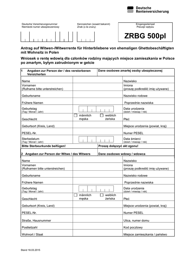 Deutsche Versicherungsnummer Niemiecki numer ubezpieczeniowy Kennzeichen (soweit bekannt) Znak (o ile znany) Eingangsstempel Pieczęć wpływu ZRBG 500pl Antrag auf Witwen-/Witwerrente für Hinterbliebene von ehemaligen Ghettobeschäftigten mit Wohnsitz in Polen Wniosek o rentę wdowią dla członków rodziny mających miejsce zamieszkania w Polsce po zmarłym, byłym zatrudnionym w getcie 1 Angaben zur Person der / des verstorbenen Versicherten Dane osobowe zmarłej osoby ubezpieczonej Name Vornamen (Rufname bitte unterstreichen) Nazwisko Imiona (proszę podkreślić imię używane) Geburtsname Nazwisko rodowe Frühere Namen Poprzednie nazwiska Geburtstag Data urodzenia (dzień / miesiąc / rok) (Tag / Monat / Jahr) Geschlecht männlich męska weiblich żeńska Płeć Geburtsort (Kreis, Land) Miejsce urodzenia (powiat, kraj) PESEL-Nr. Numer PESEL Sterbedatum Data śmierci (dzień / miesiąc / rok) (Tag / Monat / Jahr) Bitte Sterbeurkunde beifügen! Proszę dołączyć akt zgonu! 2 Angaben zur Person der Witwe / des Witwers Dane osobowe wdowy / wdowca Name Vornamen (Rufnamen bitte unterstreichen) Nazwisko Imiona (proszę podkreślić imię używane) Geburtsname Nazwisko rodowe Frühere Namen Poprzednie nazwiska Geburtstag Data urodzenia (dzień / miesiąc / rok) (Tag / Monat / Jahr) Geschlecht männlich męska weiblich żeńska Płeć Geburtsort (Kreis, Land) Miejsce urodzenia (powiat, kraj) PESEL-Nr. Numer PESEL Straße, Hausnummer Ulica, numer domu Postleitzahl Kod pocztowy Wohnort / Staat Miejsce zamieszkania / państwo Stand 18.03.2015 Telefonisch tagsüber zu erreichen (Angabe freiwillig) Kontakt telefoniczny w ciągu dnia (dane dobrowolne) Telefax, E-Mail (Angabe freiwillig) Fax, e-mail (dane dobrowolne) Czy był/a Pan/i ubezpieczony/a w niemieckim ustawowym ubezpieczeniu emerytalnorentowym? Waren Sie in der deutschengesetzlichen Rentenversicherung versichert? ja / tak nein / nie Versicherungsträger Wurde eine Versicherungsnummer vergeben? Instytucja ubezpieczeniowa ja / tak nein / nie Czy nadano numer ubezpieczeniowy? Versicherungsnummer der / des Hinterbliebenen Numer ubezpieczeniowy członka rodziny Tag der Eheschließung mit der / dem Versicherten Data zawarcia związku małżeńskiego z osobą ubezpieczoną (Tag / Monat / Jahr) (dzień / miesiąc / rok) Bestand diese Ehe bis zum Tod der / des Versicherten? ja / tak nein / nie Hat die Witwe / der Witwer nach dem Tod des / der Versicherten wieder geheiratet? ja / tak nein / nie Czy małżeństwo to trwało do śmierci osoby ubezpieczonej? Czy wdowiec / wdowa zawarł/a nowe małżeństwo po śmierci osoby ubezpieczonej? Wiederheirat am Ponowne małżeństwo zawarto dnia (Tag / Monat / Jahr) (dzień / miesiąc / rok) Stały pobyt w Polsce od 1991 r. Dauerhafter Wohnsitz in Polen ab 1991 Hinweis: Ein dauerhafter Wohnsitz in Polen liegt vor, wenn Sie Ihren Wohnsitz in Polen stets beibehalten haben und nur zu kurzen Aufenthalten im Ausland waren (z.B. Urlaub). Wskazówka: Stały pobyt w Polsce występuje wtedy, gdy zachował/a Pan/i miejsce zamieszkania w Polsce na stałe i przebywał/a Pan/i za granicą tylko w krótkich okresach (np. urlop). Haben Sie seit dem 31.12.1990 Ihren dauerhaften Wohnsitz ununterbrochen in Polen? Czy od dnia 31.12.1990 r. posiadał/a Pan/i swoje stałe miejsce zamieszkania nieprzerwanie w Polsce? ja / tak nein / nie Proszę dołączyć wszystkie posiadane dokumenty! Przebywałem/am za granicą w podanych poniżej okresach: a) Okres od - do Bitte fügen Sie alle vorhandenen Unterlagen bei! Ich habe mich zu folgenden Zeiten dauerhaft im Ausland aufgehalten: a) Zeitraum vom – bis Tag / Monat / Jahr – Tag / Monat / Jahr b) / – / / in Zeitraum vom – bis Tag / Monat / Jahr – Tag / Monat / Jahr c) / b) / / – / / in Zeitraum vom – bis Tag / Monat / Jahr – Tag / Monat / Jahr in Stand 18.03.2015 dzień / miesiąc / rok – dzień / miesiąc / rok dzień / miesiąc / rok – dzień / miesiąc / rok c) / / – / / w Okres od – do w Okres od - do dzień / miesiąc / rok – dzień / miesiąc / rok w 3 Antragstellung durch andere Personen Vollmacht oder Beschluss des Gerichts bitte beifügen. Der Antrag wird in Vertretung gestellt von Składanie wniosku przez inne osoby Proszę dołączyć pełnomocnictwo lub postanowienie sądu. Wniosek składa w zastępstwie Name Nazwisko Vorname Imię Dienststelle (ggf. Aktenzeichen) Urząd (ew. znak sprawy) in der Eigenschaft als w charakterze Gesetzlicher Vertreter przedstawiciela prawnego Vormund kuratora Betreuer opiekuna pełnomocnika Bevollmächtigter Straße, Hausnummer Ulica, numer domu Postleitzahl Kod pocztowy Wohnort / Staat Telefonisch tagsüber zu erreichen (Angabe freiwillig) Miejsce zamieszkania / państwo Kontakt telefoniczny w ciągu dnia (dane dobrowolne) Telefax, E-Mail (Angabe freiwillig) Fax, e-mail (dane dobrowolne) Hinweis: Hat die/der verstorbene Versicherte bereits eine Altersrente nach dem ZRBG bezogen, entfällt die Beantwortung der Fragen 4 bis 9. Wskazówka: Jeżeli zmarła osoba ubezpieczona pobierała już emeryturę zgodnie z Ustawą ZRBG, odpowiedź na pytania od 4 do 9 nie jest konieczna. Verfolgteneigenschaft der / des Versicherten Cechy prześladowania osoby ubezpieczonej Bitte fügen Sie alle vorhandenen Unterlagen bei! Proszę dołączyć wszystkie posiadane dokumenty! 4.1 Aus welchem Grund wurde die / Z jakiego powodu osoba der Versicherte verfolgt? ubezpieczona była prześladowana? 4 4.2 War die / der Versicherte als Verfolgte(r) im Sinne des § 1 Bundesentschädigungsgesetzes (BEG) anerkannt (durch z. B. Entschädigungsbehörde, Jewish Claims Conference, Bundesministerium für Finanzen)? ja / tak Czy osoba ubezpieczona została uznana za osobę prześladowaną w myśl § 1 Federalnej Ustawy Odszkodowawczej (BEG) (np. przez Urząd ds. Odszkodowań, Jewish Claims Conference, Federalne Ministerstwo Finansów)? Entschädigungsbehörde / Urząd ds. Odszkodowań / Aktenzeichen Znak sprawy nein / nie Stand 18.03.2015 5 Angaben zur