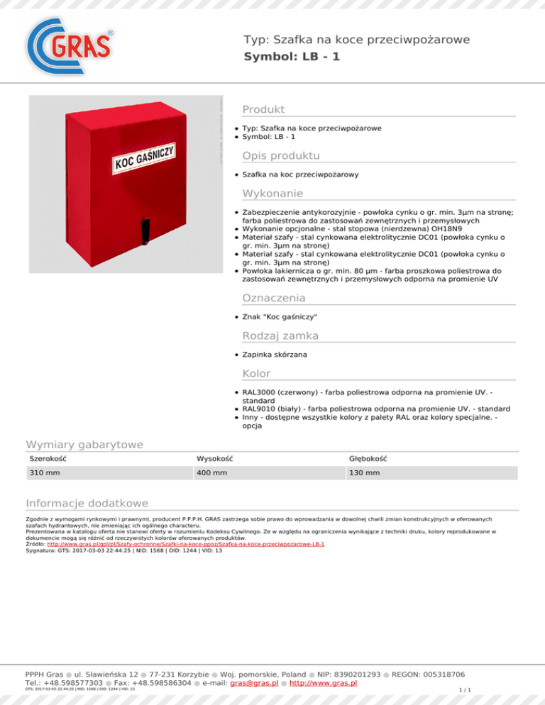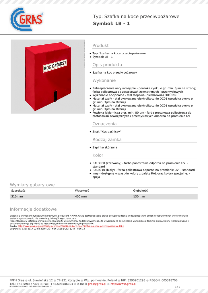 Typ: Szafka na koce przeciwpożarowe Symbol: LB - 1 Produkt Typ: Szafka na koce przeciwpożarowe Symbol: LB - 1 Opis produktu Szafka na koc przeciwpożarowy Wykonanie Zabezpieczenie antykorozyjnie - powłoka cynku o gr. min. 3μm na stronę; farba poliestrowa do zastosowań zewnętrznych i przemysłowych Wykonanie opcjonalne - stal stopowa (nierdzewna) OH18N9 Materiał szafy - stal cynkowana elektrolitycznie DC01 (powłoka cynku o gr. min. 3μm na stronę) Materiał szafy - stal cynkowana elektrolitycznie DC01 (powłoka cynku o gr. min. 3μm na stronę) Powłoka lakiernicza o gr. min. 80 μm - farba proszkowa poliestrowa do zastosowań zewnętrznych i przemysłowych odporna na promienie UV Oznaczenia Znak "Koc gaśniczy" Rodzaj zamka Zapinka skórzana Kolor RAL3000 (czerwony) - farba poliestrowa odporna na promienie UV. standard RAL9010 (biały) - farba poliestrowa odporna na promienie UV. - standard Inny - dostępne wszystkie kolory z palety RAL oraz kolory specjalne. opcja Wymiary gabarytowe Szerokość Wysokość Głębokość 310 mm 400 mm 130 mm Informacje dodatkowe Zgodnie z wymogami rynkowymi i prawnymi, producent P.P.P.H. GRAS zastrzega sobie prawo do wprowadzania w dowolnej chwili zmian konstrukcyjnych w oferowanych szafach hydrantowych, nie zmieniając ich ogólnego characteru. Prezentowana w katalogu oferta nie stanowi oferty w rozumieniu Kodeksu Cywilnego. Ze w względu na ograniczenia wynikające z techniki druku, kolory reprodukowane w dokumencie mogą się różnić od rzeczywistych kolorów oferowanych produktów. Źródło: http://www.gras.pl/gpl/pl/Szafy-ochronne/Szafki-na-koce-ppoz/Szafka-na-koce-przeciwpozarowe-LB-1 Sygnatura: GTS: 2017-03-03 22:44:25 | NID: 1568 | OID: 1244 | VID: 13 PPPH Gras ● ul. Sławieńska 12 ● 77-231 Korzybie ● Woj. pomorskie, Poland ● NIP: 8390201293 ● REGON: 005318706 Tel.: +48.598577303 ● Fax: +48.598586304 ● e-mail: [email protected] ● http://www.gras.pl GTS: 2017-03-03 22:44:25 | NID: 1568 | OID: 1244 | VID: 13 1/1