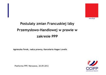Postulaty zmian Francuskiej Izby Przemysłowo-Handlowej w prawie w zakresie PPP Agnieszka Ferek, radca prawny, Kancelaria Hogan Lovells Agnieszka Ferek, radca prawny Platforma PPP, Warszawa, 20.09.2012 Plany legislacyjne • PPP to stosunkowo nowy model realizacji inwestycji w Polsce. Niemniej jednak coraz więcej podmiotów publicznych wdraża lub przygotowuje przedsięwzięcia w tej formule. • Podstawowym utrudnieniem dla rozwoju tej instytucji jest brak doświadczenia w realizacji tego typu przedsięwzięć oraz niejasne lub zbyt sformalizowane regulacje prawne. Dlatego też wskazana jest ich nowelizacja w zakresie w jakim stwarzają bariery dla wdrażania projektów partnerskich. www.hoganlovells.com Spółka projektowa Obecny stan prawny: • Art. 7 ust. 3 - zamówienia udziela się wyłącznie wykonawcy wybranemu zgodnie z przepisami ustawy. • Zakaz dokonywania zmian podmiotowych po stronie wykonawców. • Wyrok SN (V CK 97/03 ) "Zmiana podmiotowa umowy zawartej w następstwie przetargu, umożliwiająca przejęcie zamówienia publicznego przez podmiot nieuprawniony, jest nieważną czynnością prawną". • Wymagana tożsamość podmiotu, który wygrał przetarg i podmiotu, który podpisał umowę z zamawiającym. Wykluczona jest zmiana podmiotowa w trakcie prowadzonego postępowania przetargowego, jak również po zawarciu umowy o PPP. www.hoganlovells.com Spółka projektowa Uzasadnienie konieczności zmiany: • Powszechną praktyką zagraniczną jest powoływanie do każdego przedsięwzięcia PPP spółki projektowej (SPV) przez sektor prywatny. • Wszyscy oferenci muszą ponieść koszty i poświęcić czas na utworzenie i zarejestrowanie spółki projektowej w sytuacji kiedy nie wiadomo komu udzielone zostanie zamówienie. • Konieczne jest przekazanie SPV przez spółkę matkę wymaganego potencjału. • Wątpliwości prawne np. co do możliwości skorzystania z potencjału ekonomicznego (pozytywny wyrok KIO 269/11), zasad udziału w postępowaniu podmiotów przekazujących referencje (UZP – konieczny udział jako podwykonawców, KIO – wystarczy umowa o świadczenie usług). • Wyrok ETS – C-454/06 www.hoganlovells.com Spółka projektowa Propozycja zmiany: • • • • Umowa o partnerstwie publiczno-prywatnym może określać, że partner prywatny, w celu realizacji przedsięwzięcia, utworzy spółkę, w której posiada wszystkie udziały lub akcje (SPV). SPV może wstąpić do umowy o ppp w miejsce partnera prywatnego, pod warunkiem, że partner prywatny udostępni jej lub zobowiąże się wobec podmiotu publicznego do udostępnienia SPV zasobów niezbędnych do realizacji przedsięwzięcia. Do SPV stosuje się przepisy dotyczące partnera prywatnego. W przypadku, gdy umowę o ppp zawiera więcej niż jeden partner prywatny wszystkie udziały lub akcje w SPV mogą posiadać wyłącznie partnerzy prywatni w proporcji określonej w tej umowie. www.hoganlovells.com Zasady wyboru trybu postępowania Obecny stan prawny: • Art. 4 ust. 1 i 2 ustawy o PPP w zależności od planowanego przez podmiot publiczny modelu wynagrodzenia partnera prywatnego, do wyboru partnera stosuje się przepisy Ustawy o Koncesjach lub przepisy Pzp. • Zmiana źródeł wynagrodzenia partnera prywatnego w toku procedury zmierzającej do zawarcia umowy o PPP, prowadzonej w trybie Pzp, w ten sposób, że większa część wynagrodzenia strony prywatnej miałaby pochodzić z pożytków z przedmiotu partnerstwa - konieczność unieważnienia postępowania. • Art. 17a pkt 1 ustawy o odpowiedzialności za naruszenie dyscypliny finansów publicznych, naruszeniem dyscypliny finansów publicznych jest „zawarcie umowy koncesji z koncesjonariuszem, który nie został wybrany zgodnie z przepisami o koncesji na roboty budowlane lub usługi”. www.hoganlovells.com Zasady wyboru trybu postępowania Uzasadnienie konieczności zmiany: • Dychotomiczny podział procedur wyboru partnera prywatnego wymusza każdorazowe ustalenie przez podmiot publiczny z góry modelu wynagrodzenia kontrahenta i zastosowanie właściwej ustawy. • Niekiedy podział ryzyk w umowie i ostateczny kształt wynagrodzenia partnera prywatnego nie jest ewidentny. • Często brak możliwości ustalenia z góry przez podmiot publiczny czy przedsięwzięcie może być realizowane na zasadach komercyjnych, gwarantujących zwrot poniesionych nakładów z pożytków ze świadczenia usług. Wiedzą taką będzie dysponował prywatny przedsiębiorca, biorący udział w postępowaniu. www.hoganlovells.com Zasady wyboru trybu postępowania Propozycja zmiany: • • Konieczna zmiana w taki sposób aby możliwe było kontynuowanie postępowania w trybie Pzp. Ustawa o PPP powinna dopuszczać zastosowanie trybu Prawa zamówień publicznych w każdej sytuacji. Tryb koncesyjny powinien być fakultatywny w sytuacji gdy spełnione są warunki dla jego zastosowania. Zmiana Art. 4 ust. 1 ustawy o PPP: – Jeżeli wynagrodzeniem partnera prywatnego jest prawo do pobierania pożytków z przedmiotu partnerstwa publiczno-prywatnego, albo przede wszystkim to prawo wraz z zapłatą sumy pieniężnej, do wyboru partnera prywatnego i umowy o partnerstwie publiczno-prywatnym stosuje się przepisy Pzp albo ustawy o koncesjach na roboty budowlane lub usługi. www.hoganlovells.com Ograniczenie liczby uczestników postępowania w trakcie dialogu/negocjacji Obecny stan prawny: • Na gruncie Pzp dialog konkurencyjny składa się z trzech etapów tj. prekwalifikacja formalna (wnioski o dopuszczenie do udziału w postępowaniu), dialog z zaproszonymi wykonawcami, opracowanie SIWZ i złożenie ofert. • Zamawiający zobowiązany jest do prowadzenia dialogu ze wszystkimi wykonawcami, którzy zostali do dialogu zaproszeni. • Zamawiający musi zaprosić wszystkich wykonawców do złożenia ofert. www.hoganlovells.com Ograniczenie liczby uczestników postępowania w trakcie dialogu/negocjacji Uzasadnienie konieczności zmiany: • • • • • W jurysdy