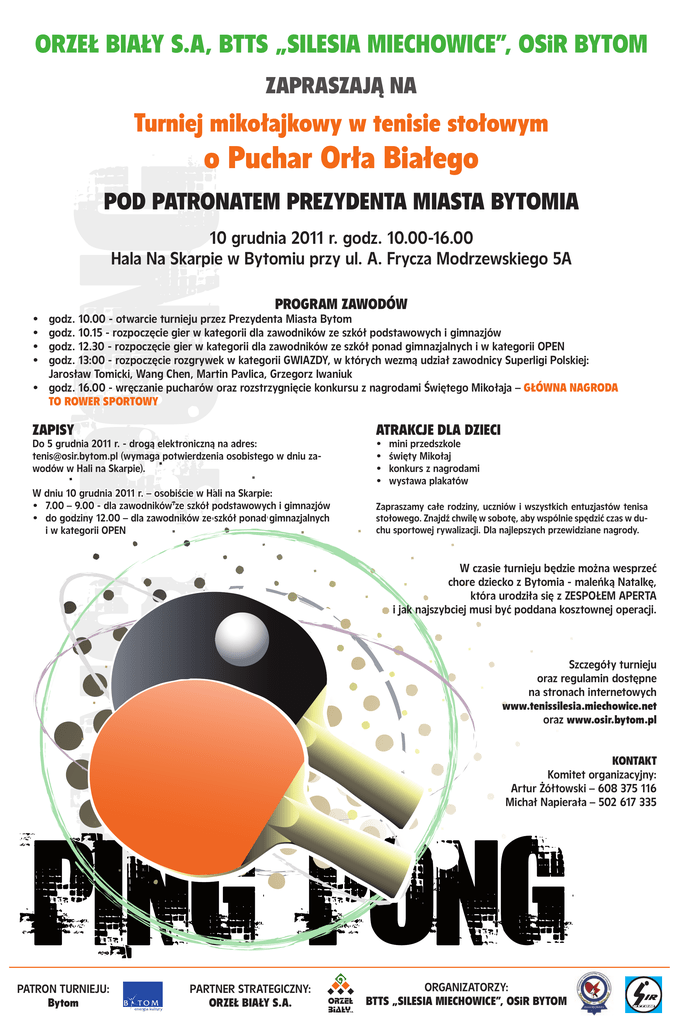 ORZEŁ BIAŁY S.A, BTTS „SILESIA MIECHOWICE”, OSiR BYTOM ZAPRASZAJĄ NA Turniej mikołajkowy w tenisie stołowym o Puchar Orła Białego POD PATRONATEM PREZYDENTA MIASTA BYTOMIA 10 grudnia 2011 r. godz. 10.00-16.00 Hala Na Skarpie w Bytomiu przy ul. A. Frycza Modrzewskiego 5A • • • • PROGRAM ZAWODÓW godz. 10.00 - otwarcie turnieju przez Prezydenta Miasta Bytom godz. 10.15 - rozpoczęcie gier w kategorii dla zawodników ze szkół podstawowych i gimnazjów godz. 12.30 - rozpoczęcie gier w kategorii dla zawodników ze szkół ponad gimnazjalnych i w kategorii OPEN godz. 13:00 - rozpoczęcie rozgrywek w kategorii GWIAZDY, w których wezmą udział zawodnicy Superligi Polskiej: Jarosław Tomicki, Wang Chen, Martin Pavlica, Grzegorz Iwaniuk • godz. 16.00 - wręczanie pucharów oraz rozstrzygnięcie konkursu z nagrodami Świętego Mikołaja – GŁÓWNA NAGRODA TO ROWER SPORTOWY ZAPISY ATRAKCJE DLA DZIECI W dniu 10 grudnia 2011 r. – osobiście w Hali na Skarpie: • 7.00 – 9.00 - dla zawodników ze szkół podstawowych i gimnazjów • do godziny 12.00 – dla zawodników ze szkół ponad gimnazjalnych i w kategorii OPEN Zapraszamy całe rodziny, uczniów i wszystkich entuzjastów tenisa stołowego. Znajdź chwilę w sobotę, aby wspólnie spędzić czas w duchu sportowej rywalizacji. Dla najlepszych przewidziane nagrody. Do 5 grudnia 2011 r. - drogą elektroniczną na adres: [email protected] (wymaga potwierdzenia osobistego w dniu zawodów w Hali na Skarpie). • • • • mini przedszkole święty Mikołaj konkurs z nagrodami wystawa plakatów W czasie turnieju będzie można wesprzeć chore dziecko z Bytomia - maleńką Natalkę, która urodziła się z ZESPOŁEM APERTA i jak najszybciej musi być poddana kosztownej operacji. Szczegóły turnieju oraz regulamin dostępne na stronach internetowych www.tenissilesia.miechowice.net oraz www.osir.bytom.pl KONTAKT Komitet organizacyjny: Artur Żółtowski – 608 375 116 Michał Napierała – 502 617 335 PATRON TURNIEJU: Bytom PARTNER STRATEGICZNY: ORZEŁ BIAŁY S.A. ORGANIZATORZY: BTTS „SILESIA MIECHOWICE”, OSiR BYTOM